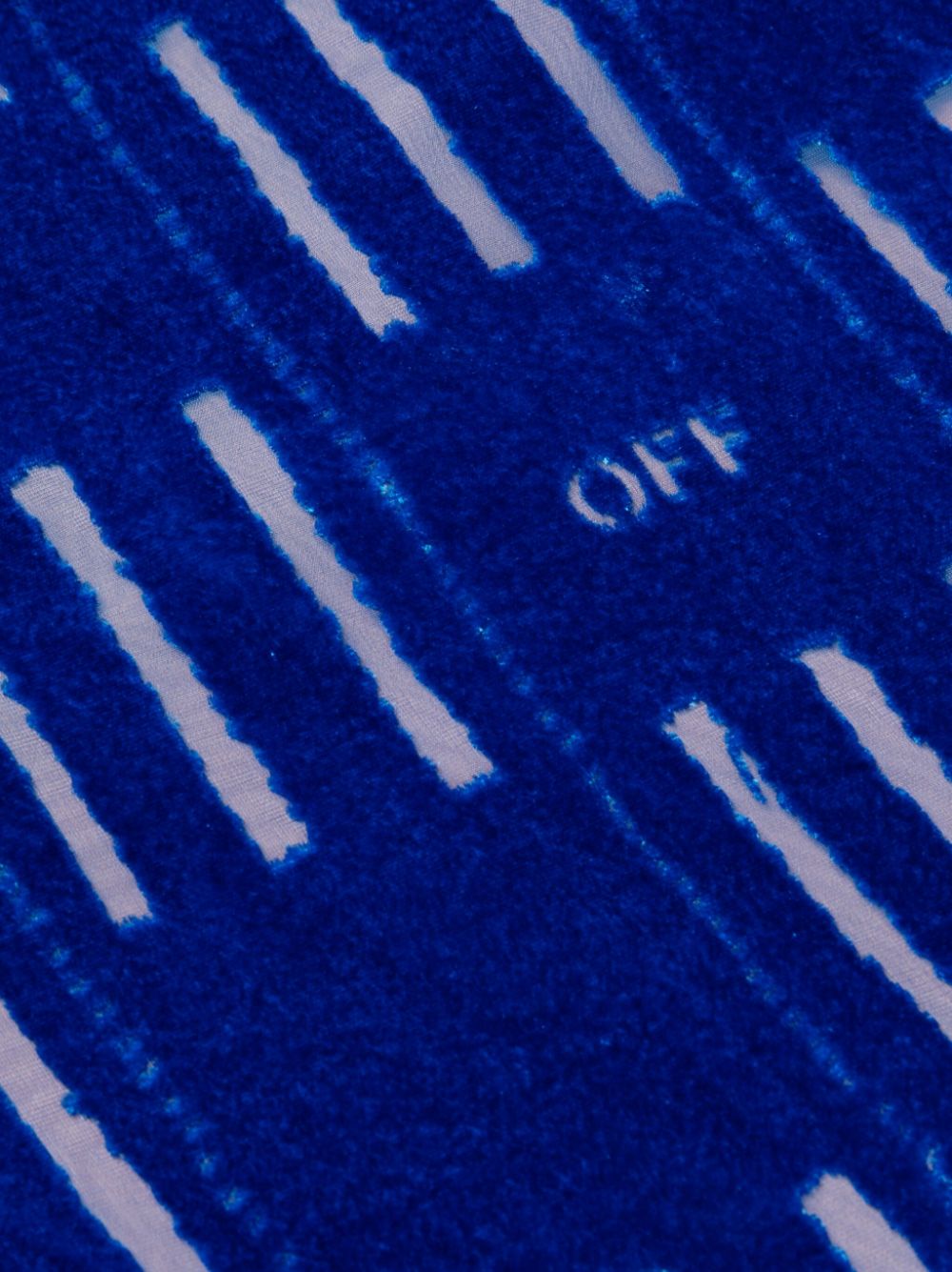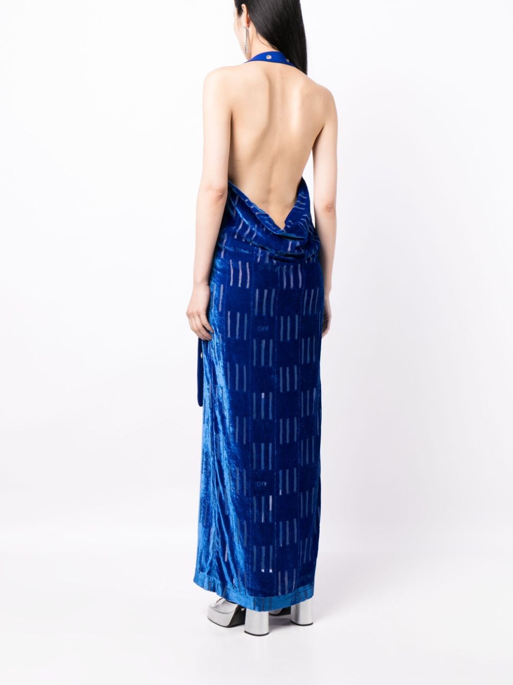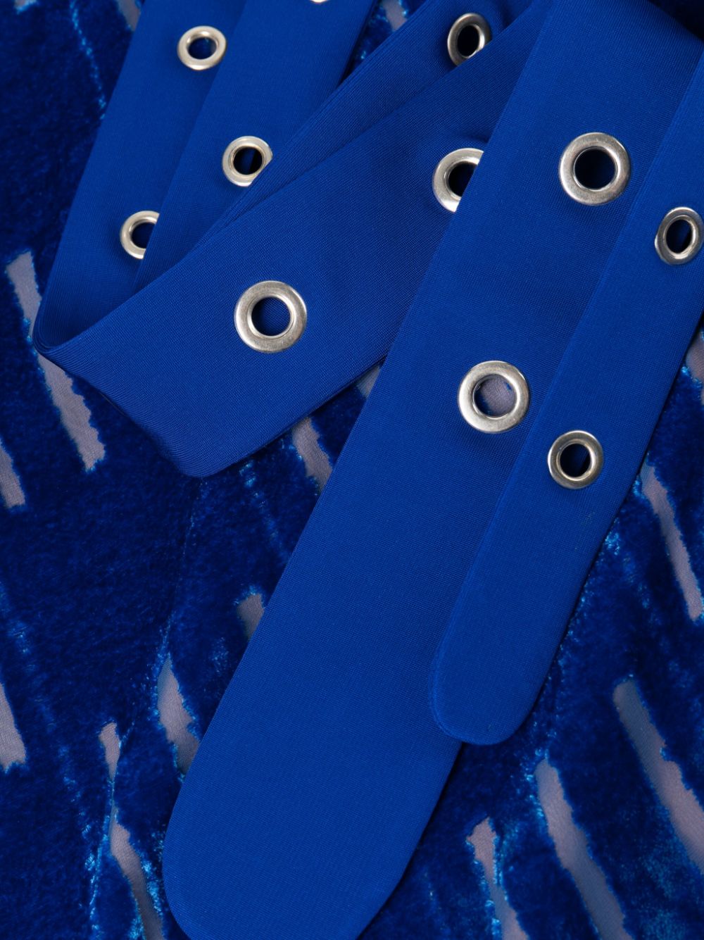 Inspired by the Japanese dyeing technique Shibori, this electric-blue dress is cut from devoré velvet with a geometric pattern. The halter neckline is created by an elongated buckled strap dotted with silver-tone eyelets in a nod to the label's utilitarian inspirations.