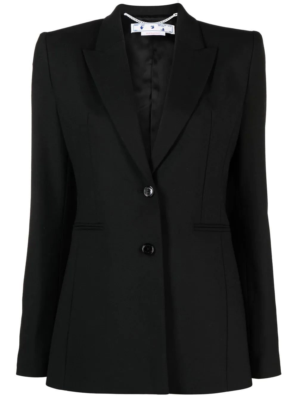 Off-White seamlessly incorporates its streetwear-inspired aesthetic into timeless silhouettes for SS23, as shown by this black single-breasted blazer. Spun in Italy from a delicate blend of virgin wool, this piece is cut for a tailored fit and elevated with a lettering embellishment at the rear.