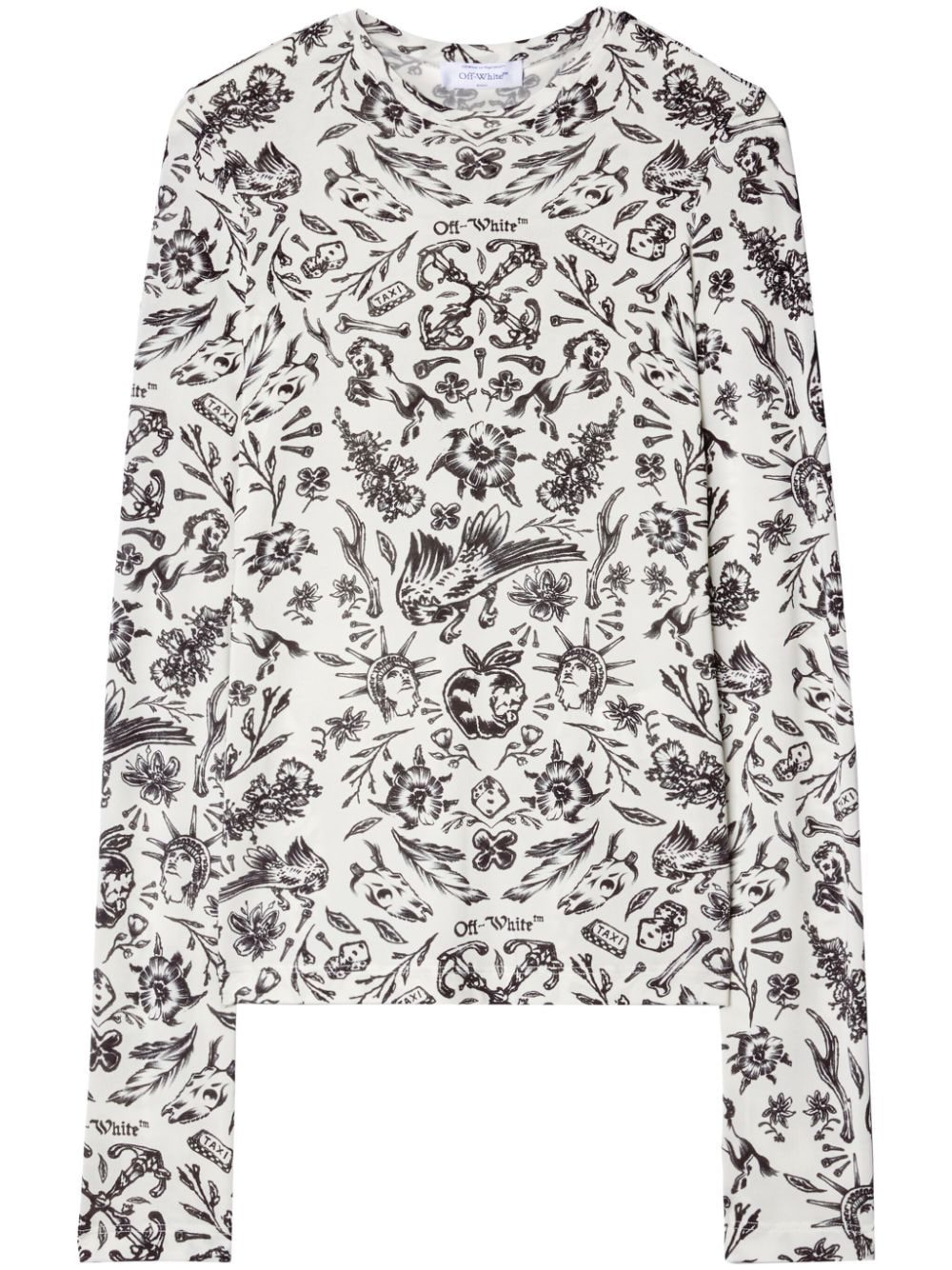 Off-White's vision is a graphic one, and this white T-shirt is proof. Cut to a minimalist crew-neck silhouette, it is animated with an inky print starring a myriad of tattoo-like designs.