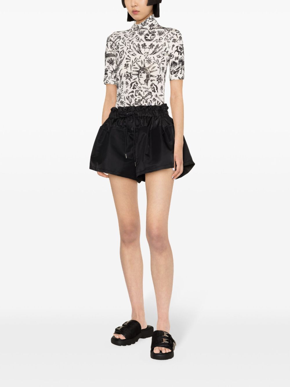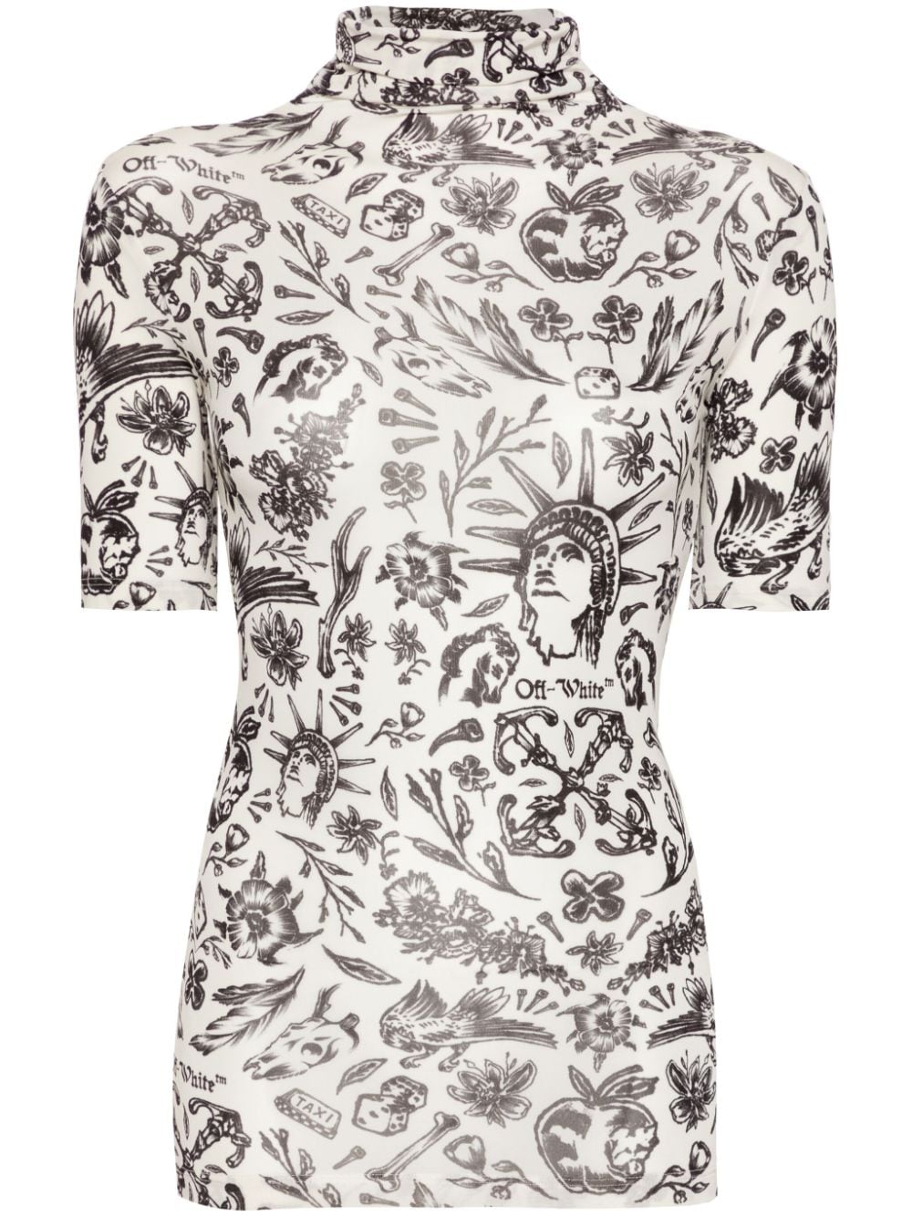 Off-White's graphic vision is clear with this white top. Cut to a short-sleeve silhouette with a rolled neckline, it is animated with an inky print starring a myriad of tattoo-like designs that grants it its name.