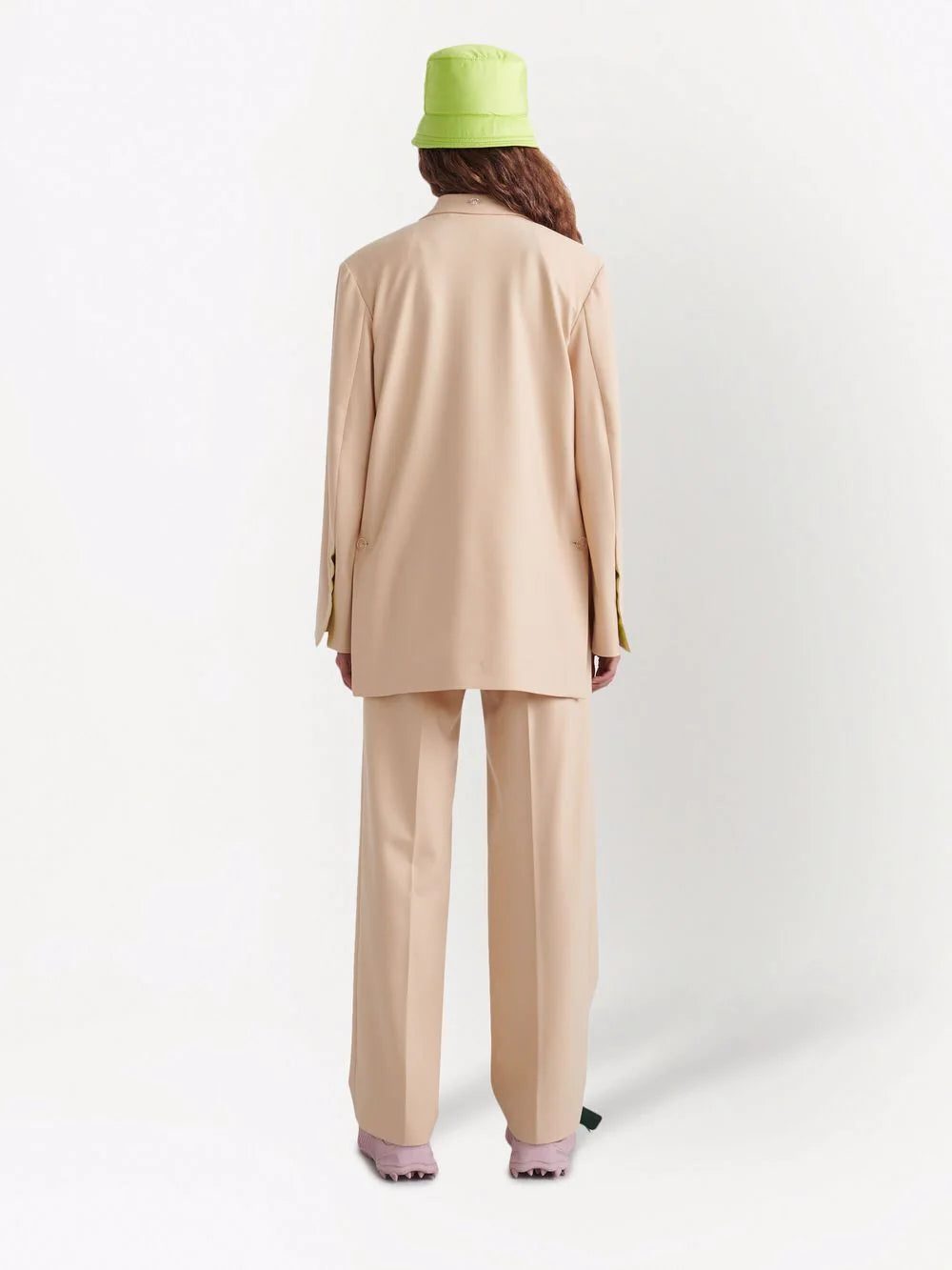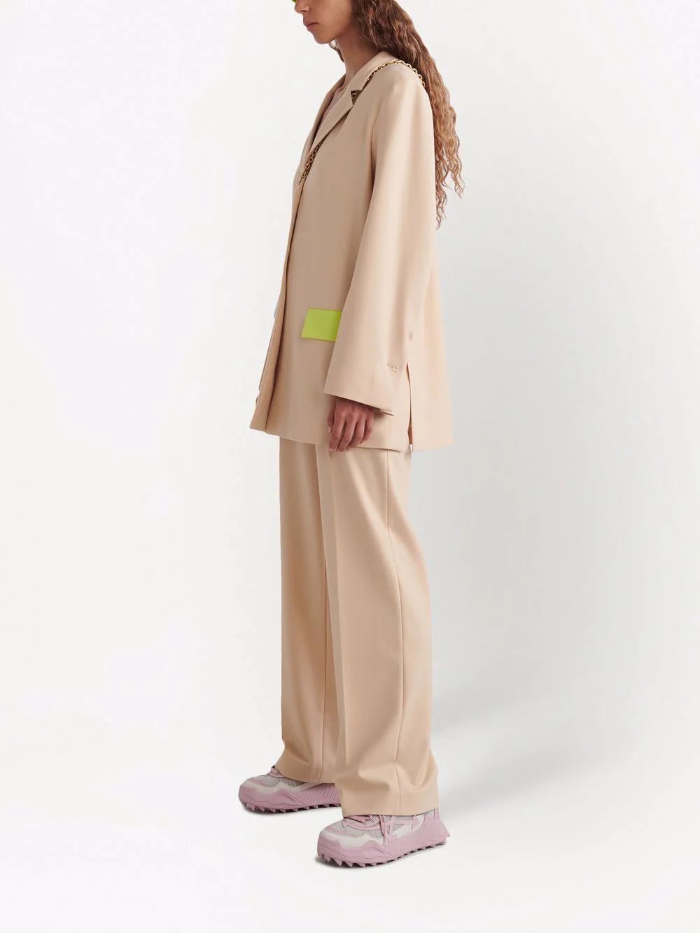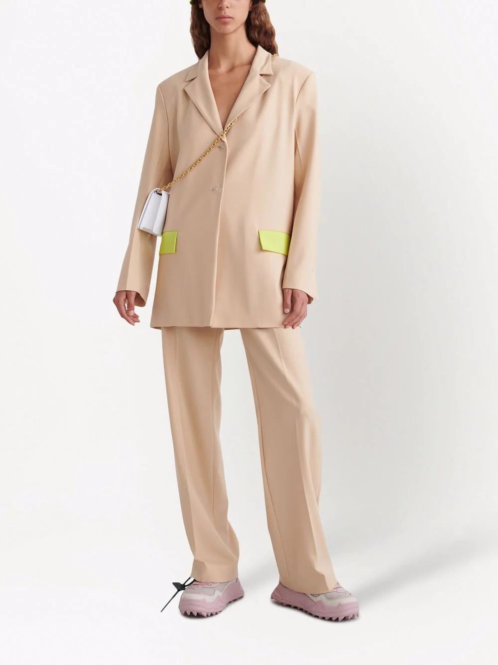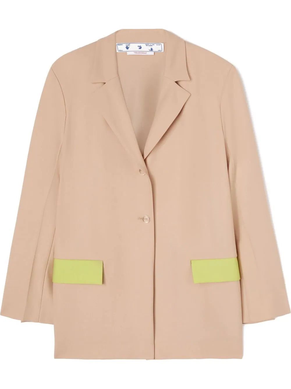 Off-White puts a modern twist on the classic single-breasted blazer. Introduced in a beige colourway, this layering piece is adorned with neon green flap pockets to the side.