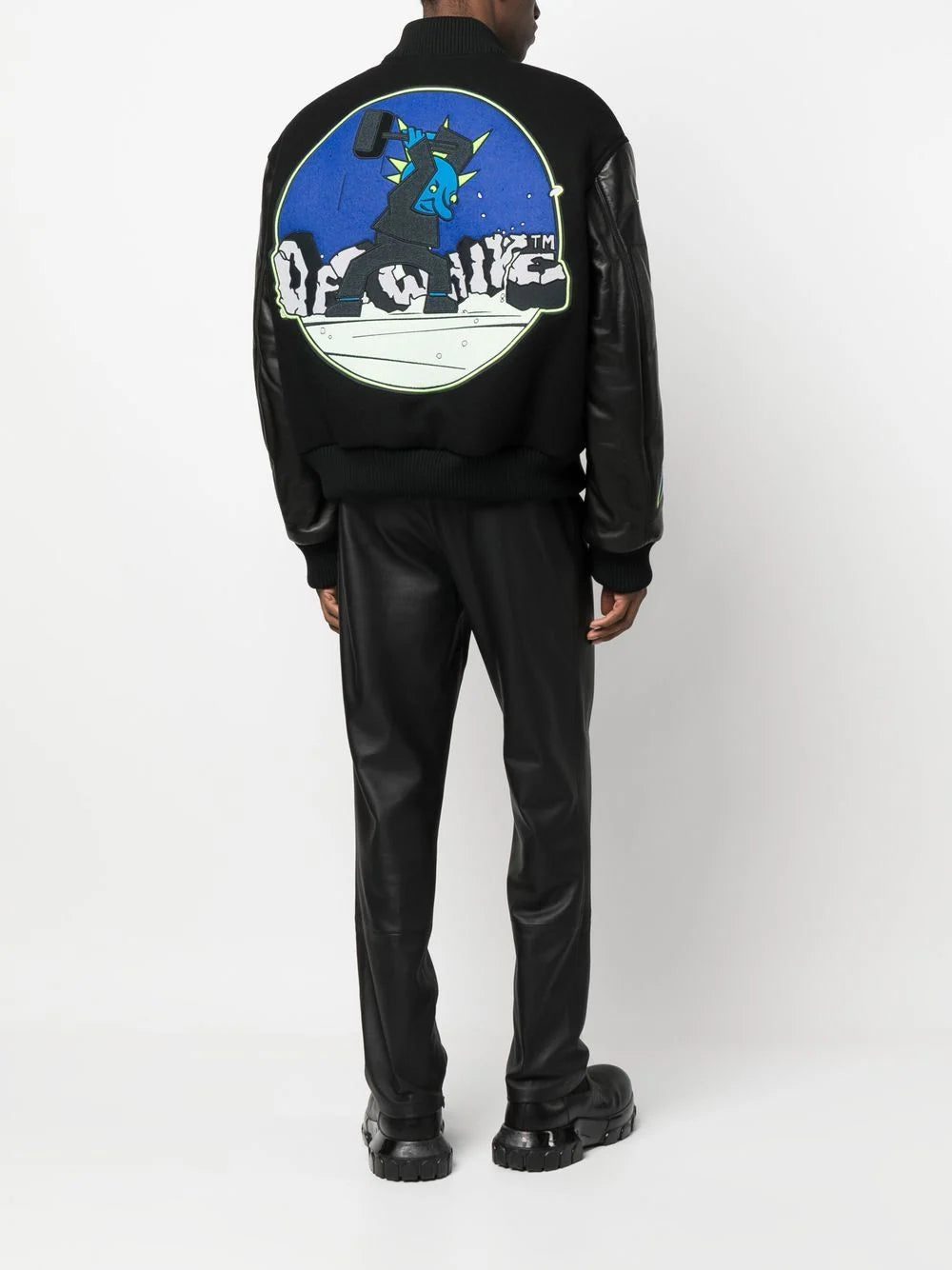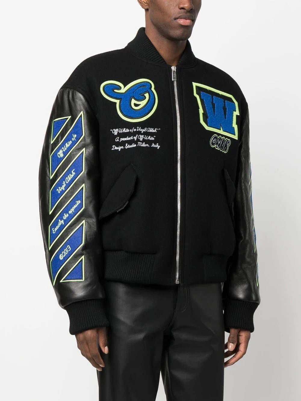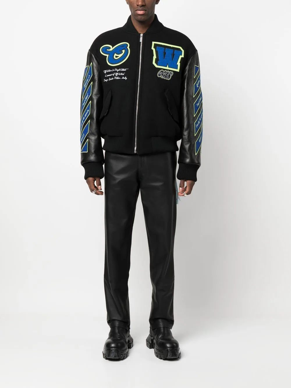 A collegiate-inspired design, this varsity jacket is adorned with Off-White's logo patches at the chest in a contrasting blue hue. Crafted from a blend of wool with Diag-printed leather sleeves, it is finished with an oversized graphic print at the rear.