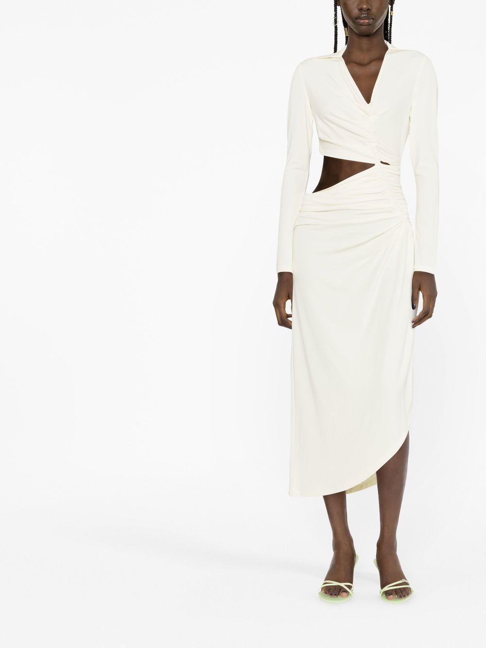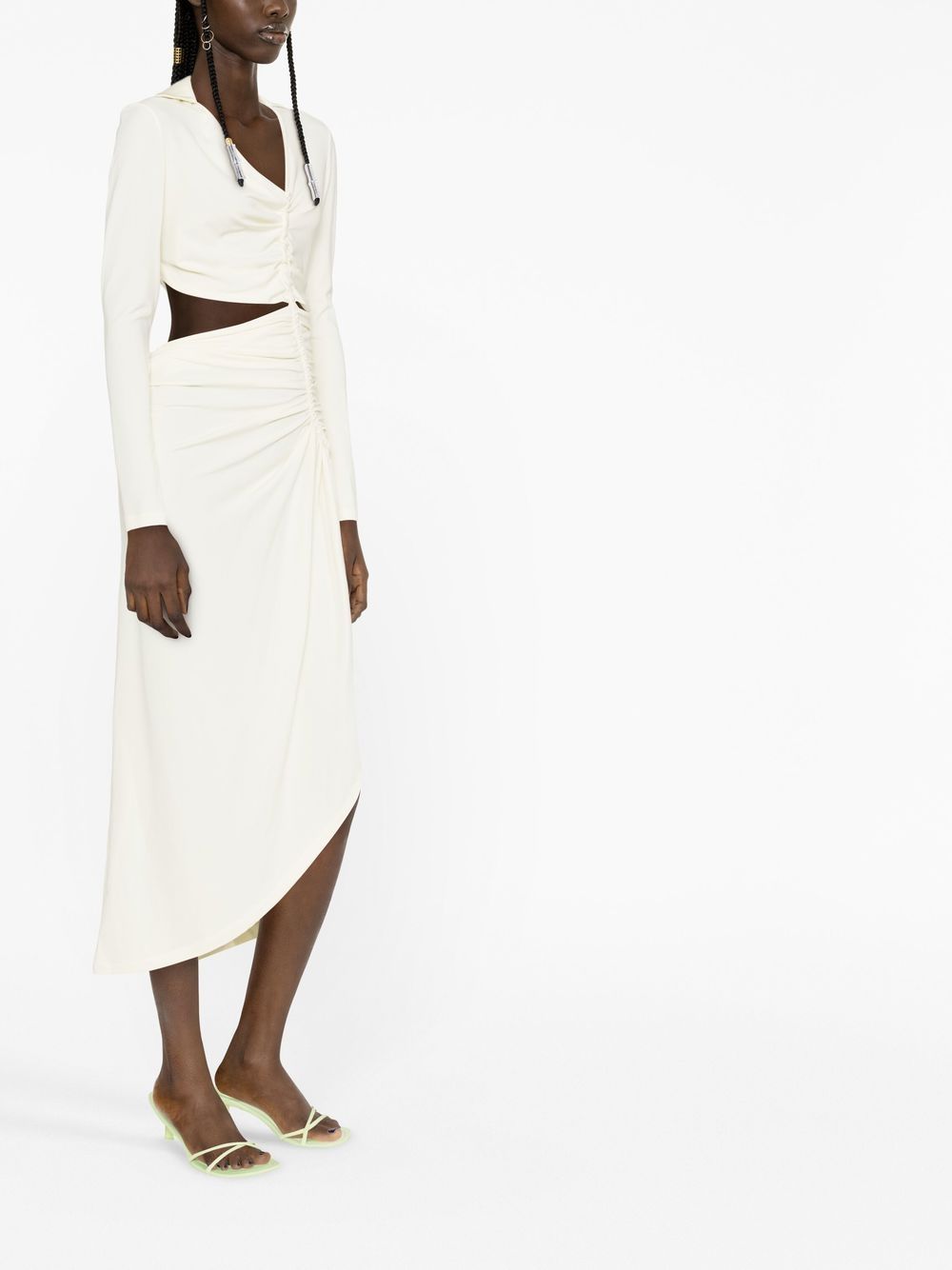 Off-White's directional design vision is captured in the asymmetric silhouette of this white crepe midi dress. Decorated with cut-out detailing, it's finished with ruched gathering that nods to the label's bold aesthetic.