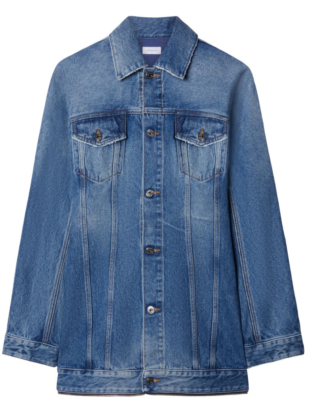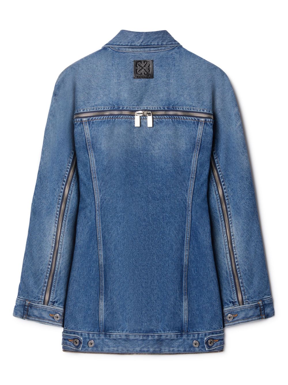 Embracing Off-White's penchant for contemporary elements, this minidress is adorned with a zip that crossed the back of the garment. It is crafted from pure cotton and features an elongated silhouette inspired by classic denim jackets.