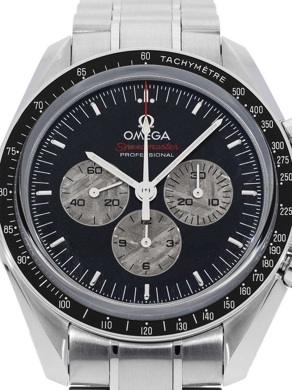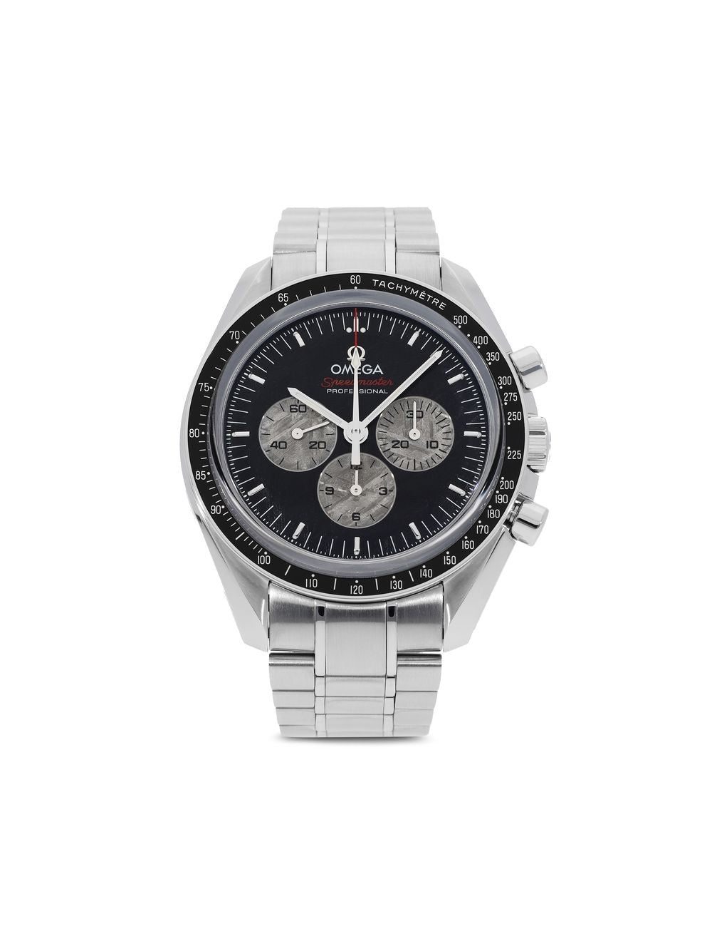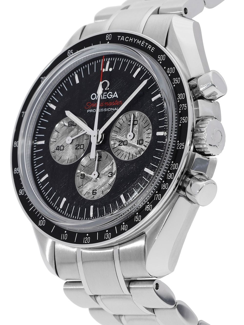 Having been present during all six moon landings, OMEGA's Speedmaster Moonwatch is one of the world's most iconic timepieces. A real test of the watchmaker's know-how with an eye toward adventure, this 2014 pre-owned Speedmaster Professional Moonwatch Apollo-Soyuz 35th Anniversary 42mm is crafted from polished stainless steel and celebrates space exploration with its dial and subdials made from slices of meteorite.