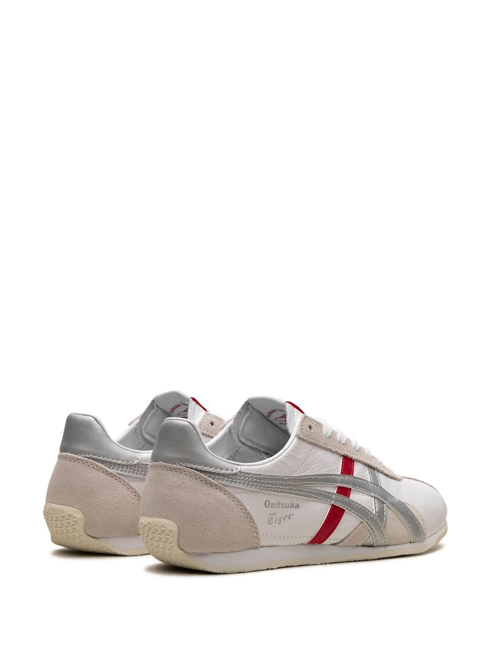 These Onitsuka Tiger Runspark sneakers boast an old-school appearance with a blend of white, red, and metallic silver hues. Made from a combination of suede and leather, they're durable and provide comfort with their flat rubber soles.