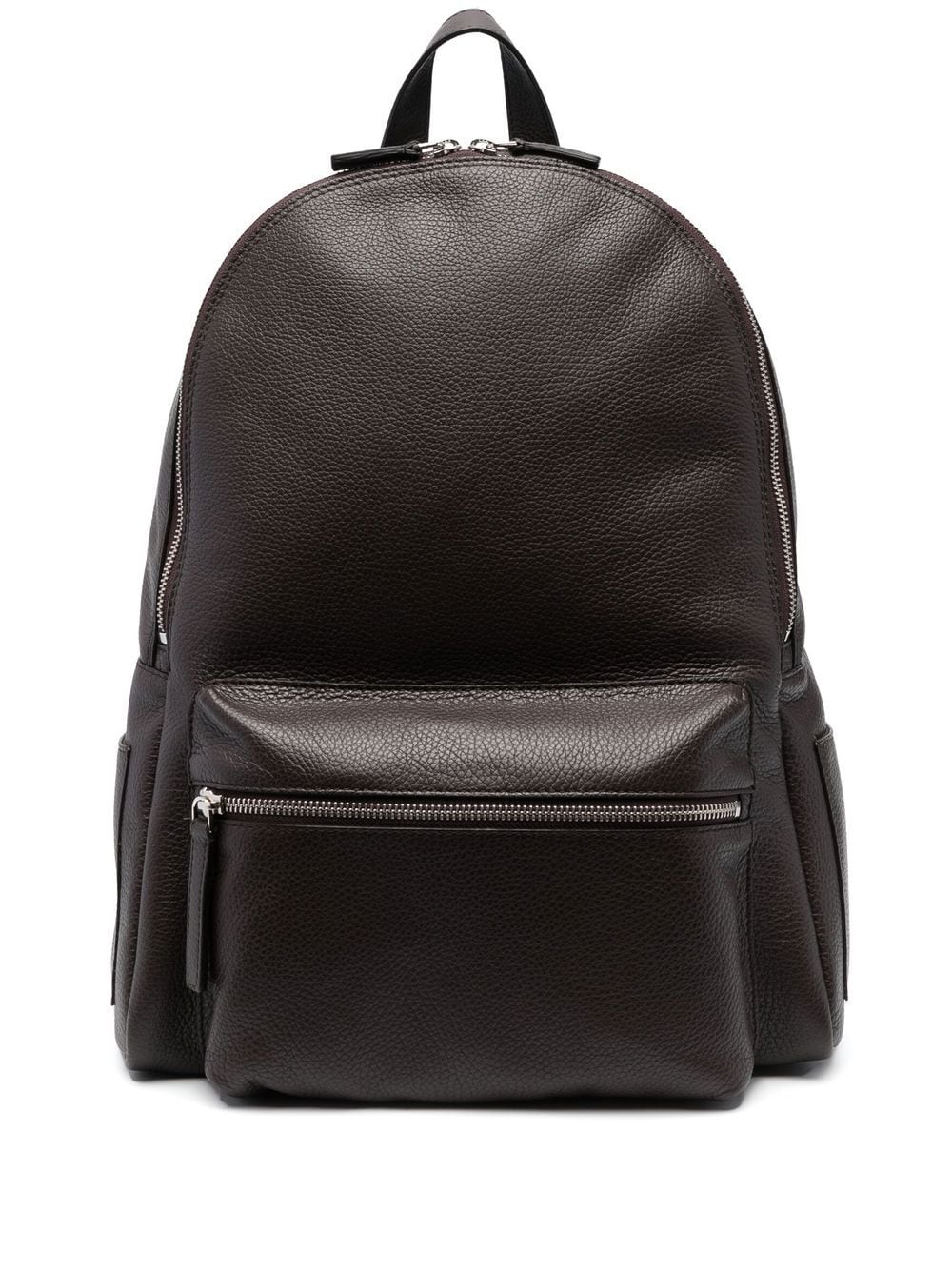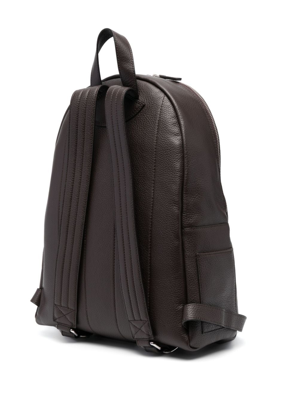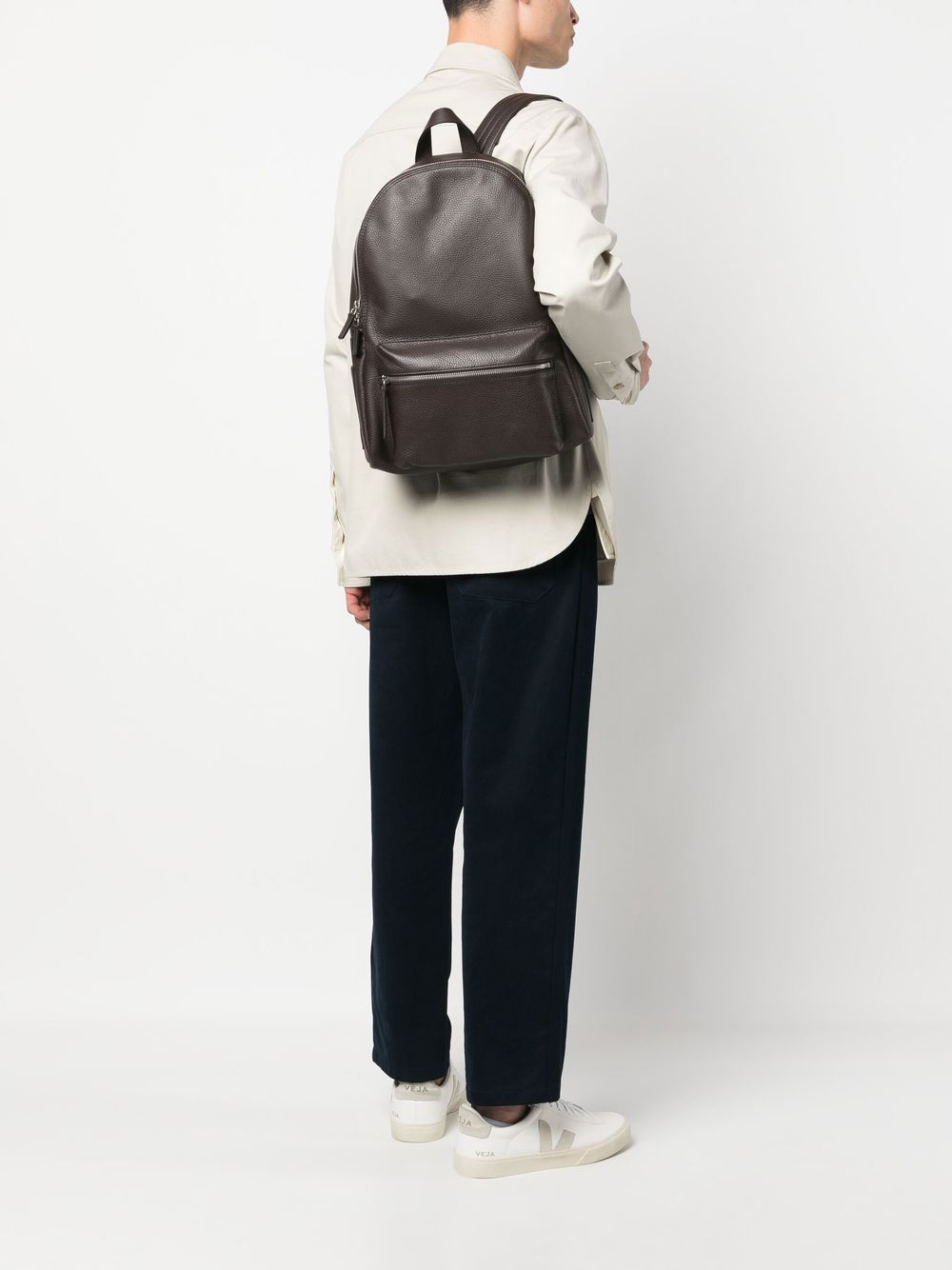 brown calf leather grained texture silver-tone logo lettering internal logo patch all-around zip fastening two padded adjustable shoulder straps loop handle front zip-fastening pouch pocket two side patch pockets main compartment multiple internal slip pockets