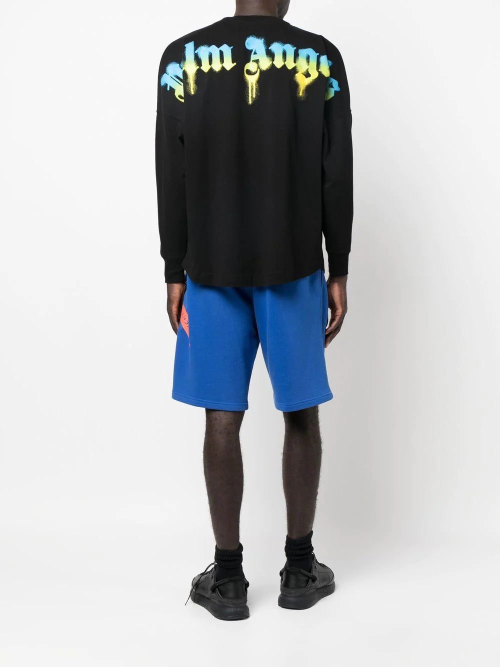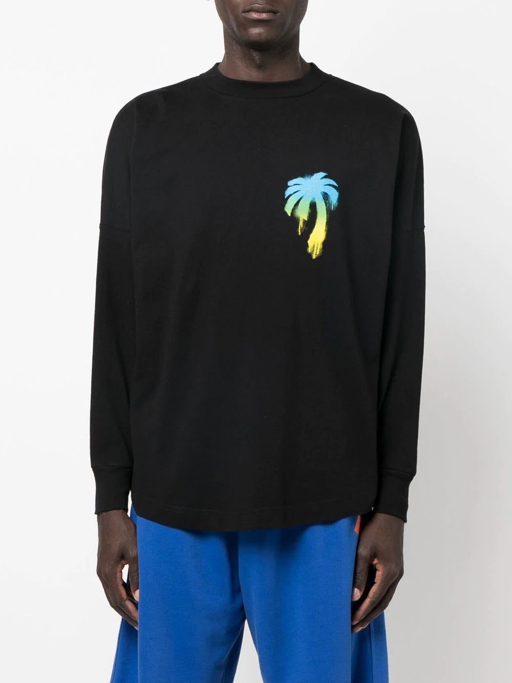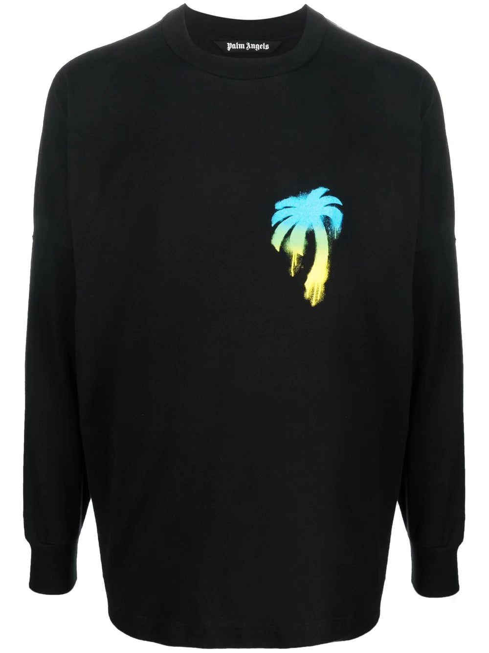 graffiti logo-print long-sleeved T-shirt from PALM ANGELS featuring black/multicolour, cotton, palm tree print, logo print to the rear, round neck, long sleeves and straight hem.