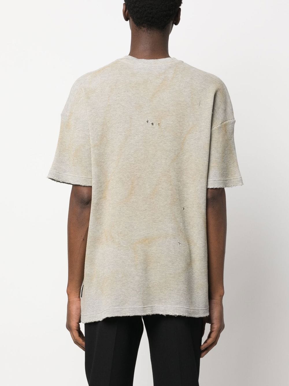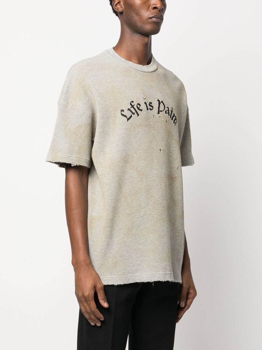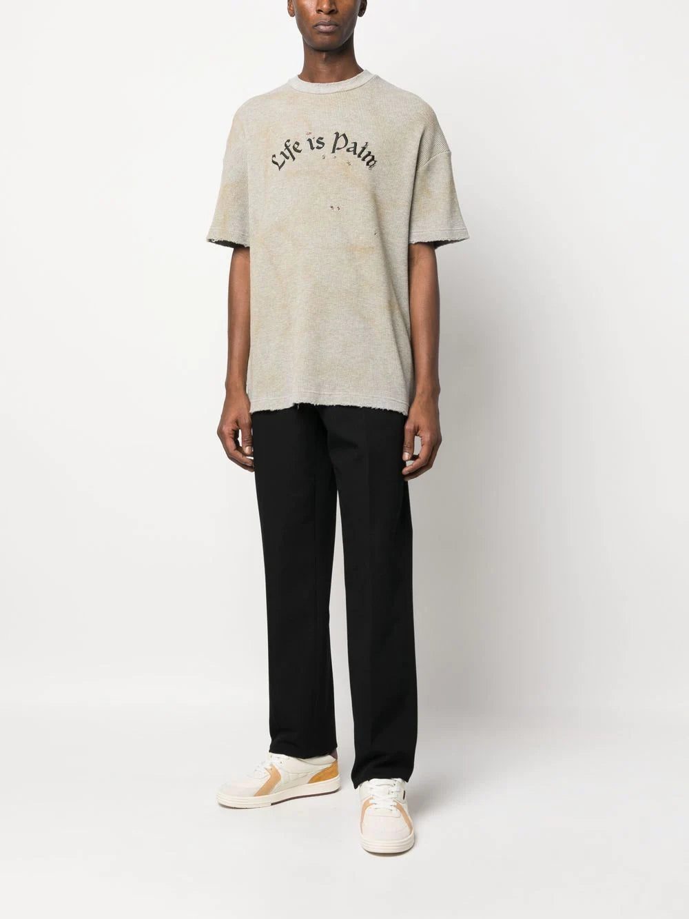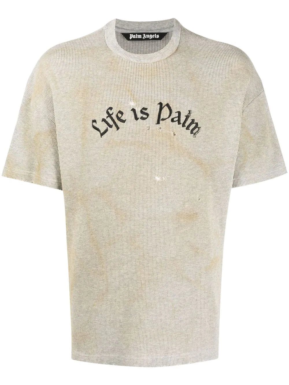Evocative of the brand's streetwear-inspired ethos and bold interpretation of classic silhouettes, this muted grey T-shirt from Palm Angels is made in Italy from soft cotton and designed for a distressed worn-in look whilst boasting a seasonal slogan motif across the chest.