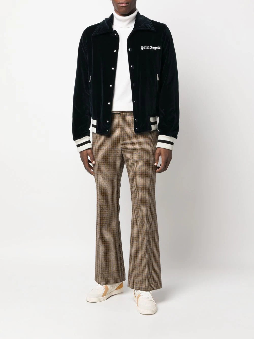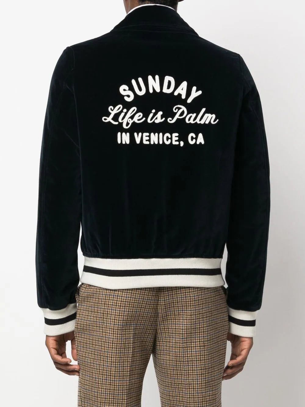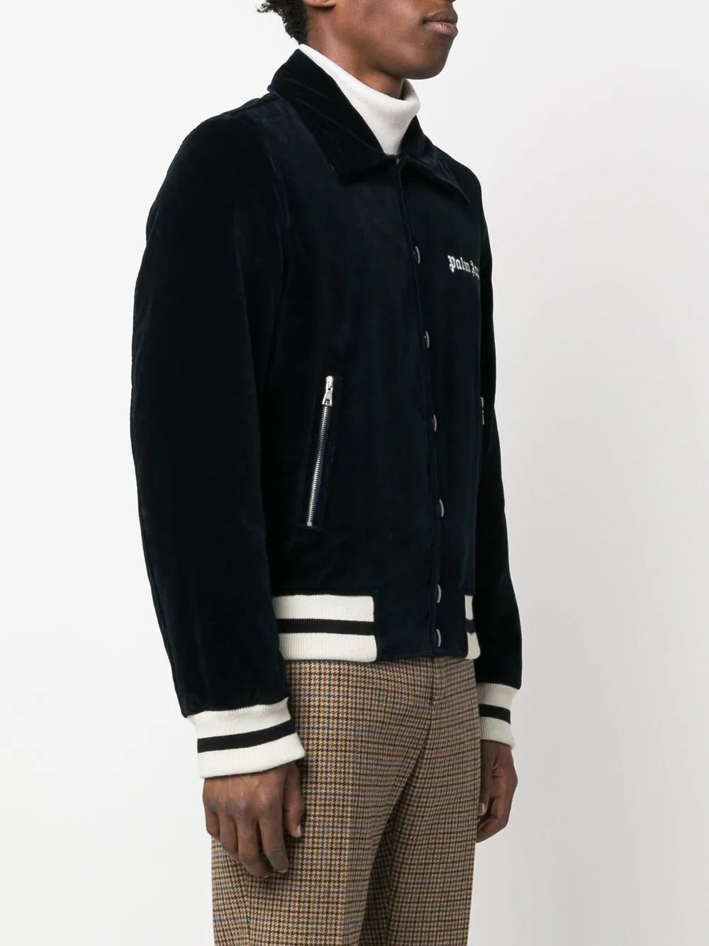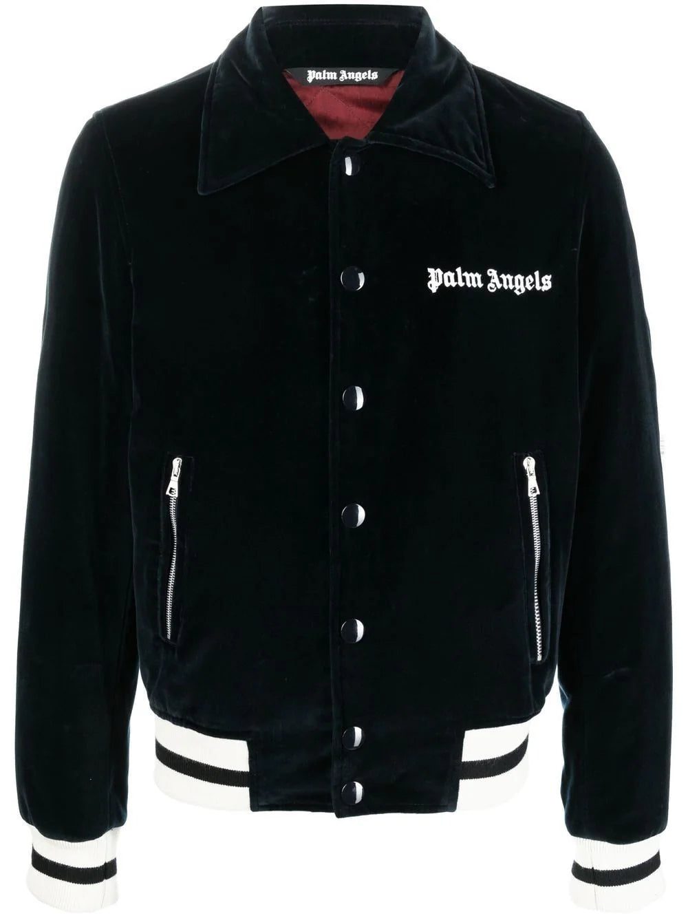 Palm Angels elevates the traditional sports jacket silhouette in this logo-embroidered design. Trimmed with the classic athletic striped trim, the collared neckline and plush velvet construction ensure a sensuous and tactile finish.