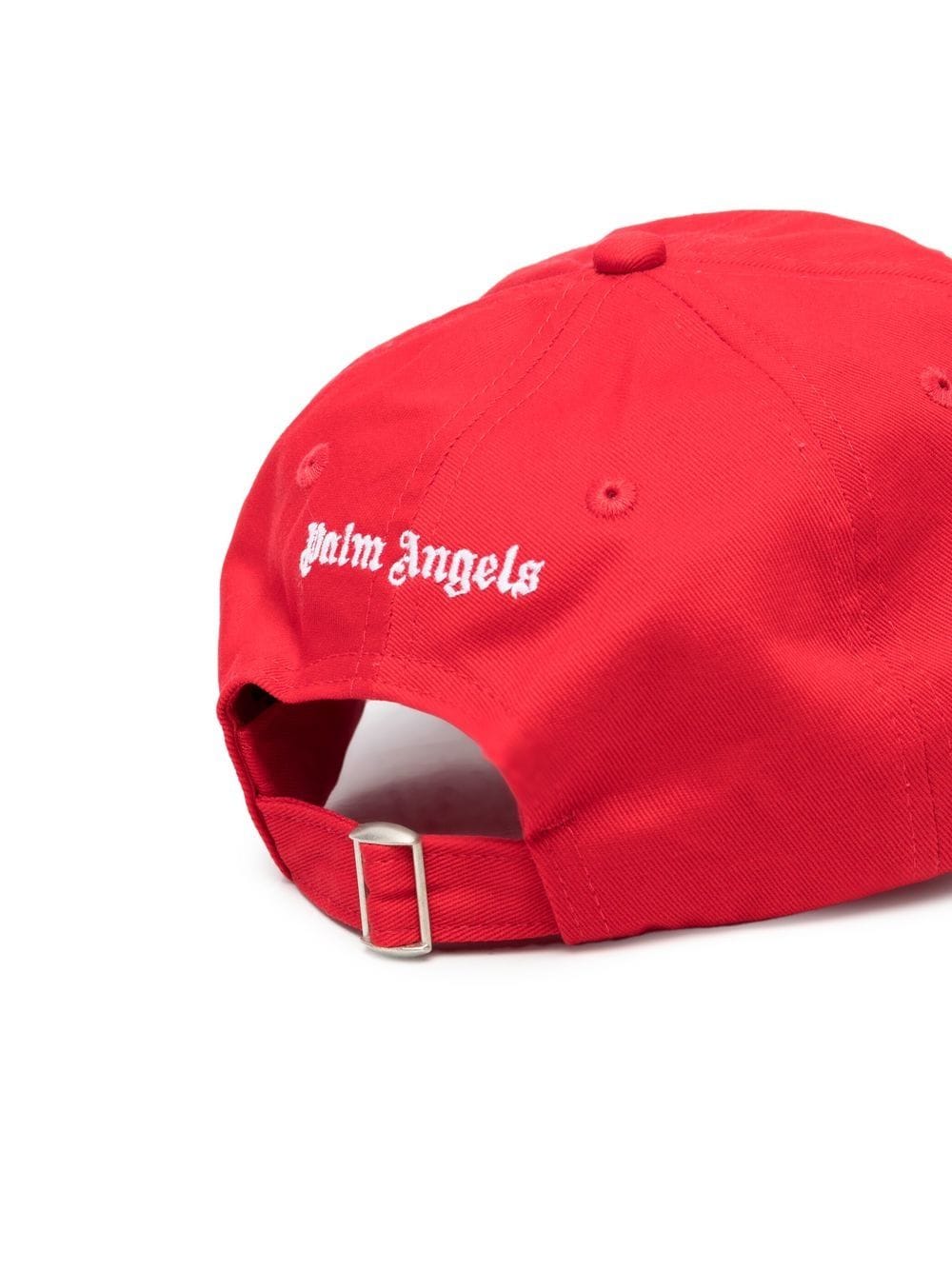 logo-print baseball cap from PALM ANGELS featuring bright red, cloud white, cotton blend, logo print to the front, logo print to the rear, curved narrow brim and adjustable strap to the rear.