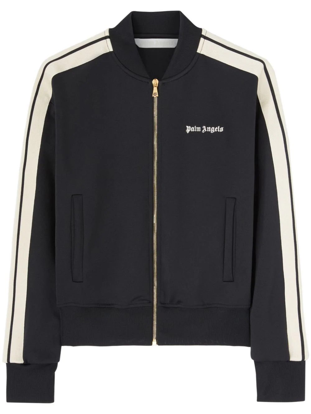 Palm Angels fuses elements from track and bomber silhouettes to create this black jacket. Its welt pockets, rounded ribbed collar and matching trims nod to military designs, while its striped sleeves and logo print stay true to the label’s signature sporty styles.