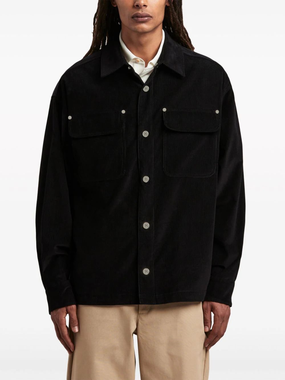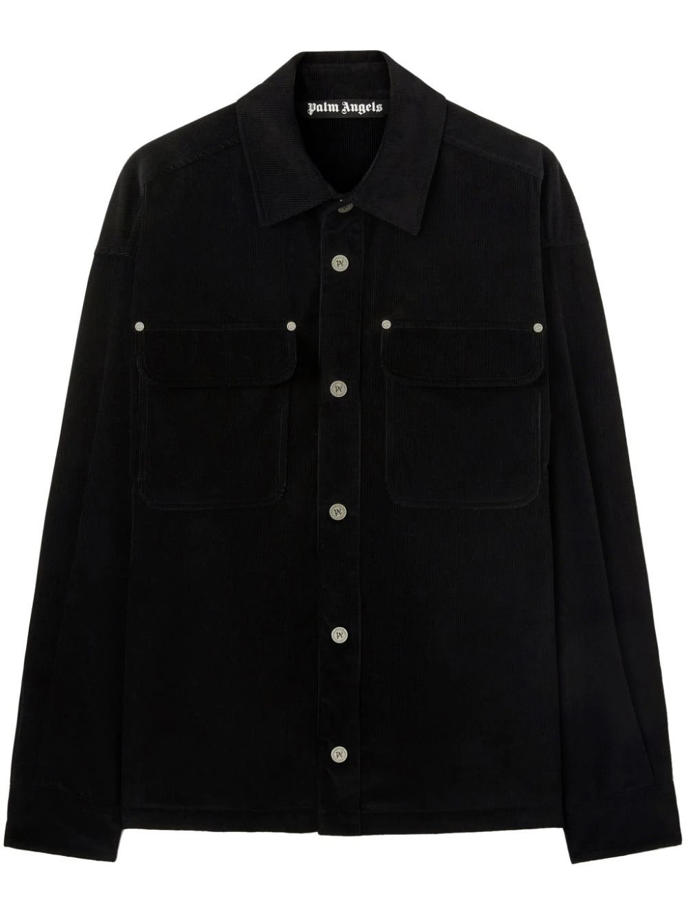 Palm Angels' velvet shirt jacket is printed with tattoo-inspired logo lettering on the back.
