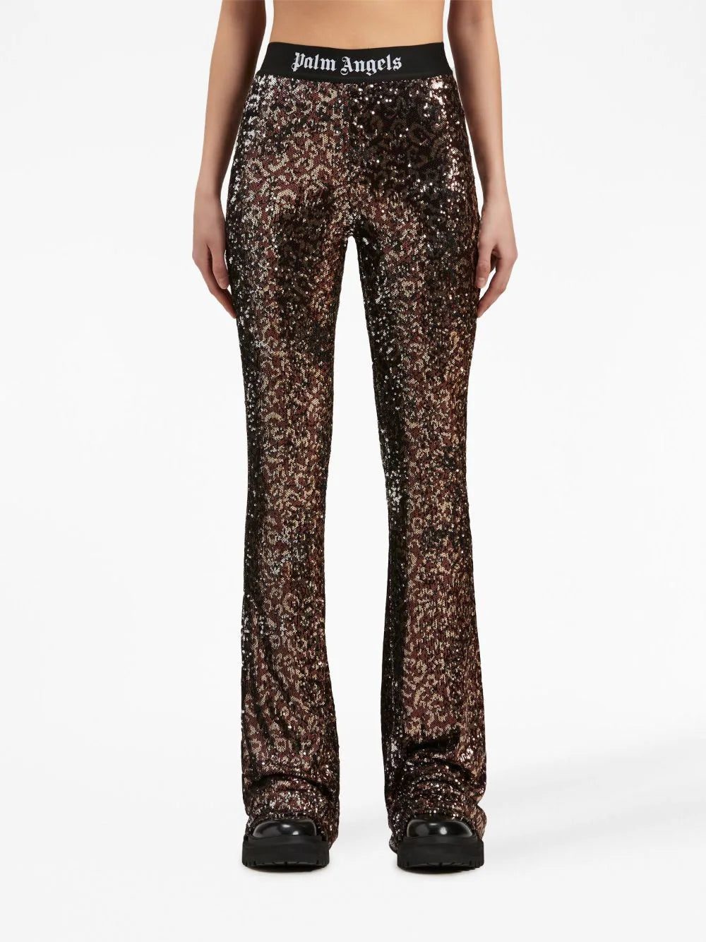 Sitting high on the waist, these flared trousers by Palm Angels are fully covered with light-catching sequins for a glamorous touch. The brand's recurrent logo tape gives the garment a recognisable touch.