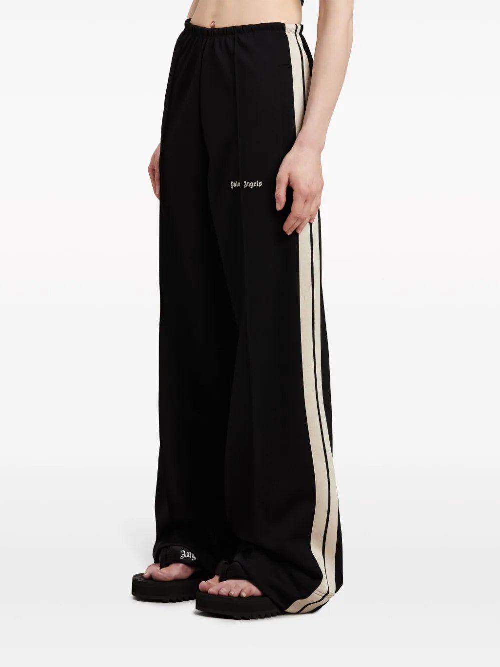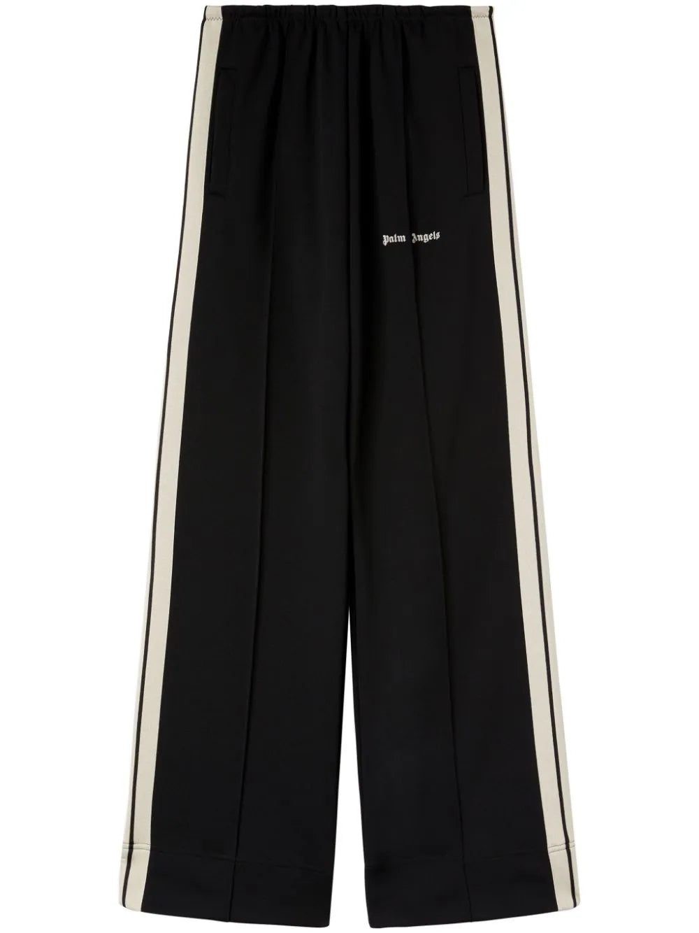 These black track pants from Palm Angels ooze retro appeal with their webbing stripes that adorn the sides in a contrasting off-white hue. They're cut from cotton jersey to a slouchy wide leg and floor-pooling hem.