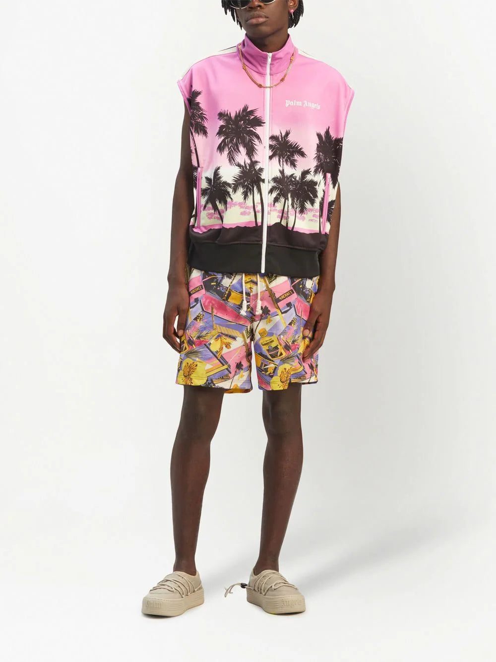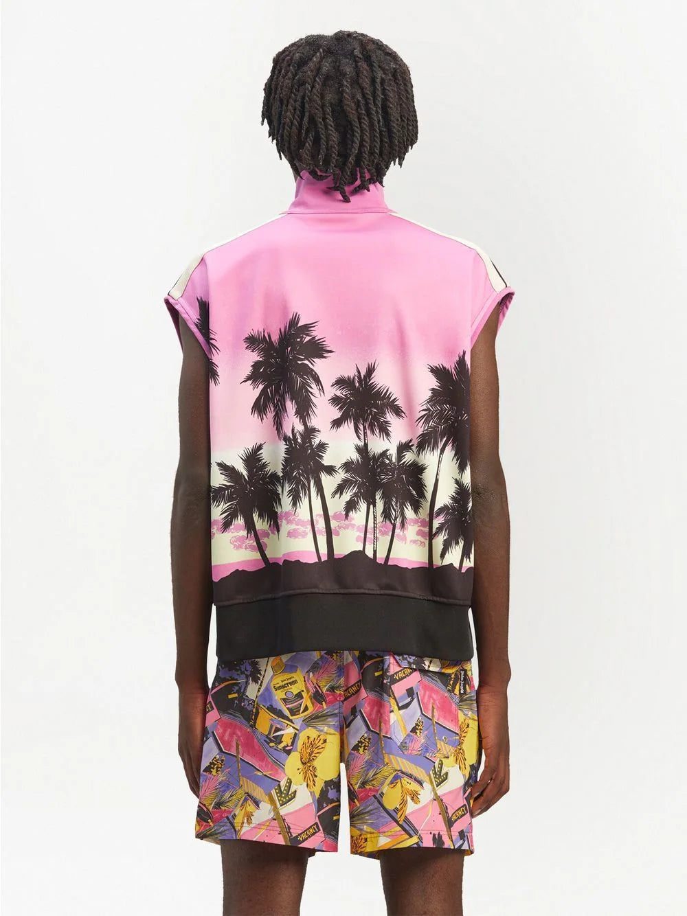 Palm Angels' LA-inspired laidback style is evidenced by this track gilet from the latest SS23 collection. Presented in pink and black, the garment is printed with silhouetted palm trees against a sunset view.