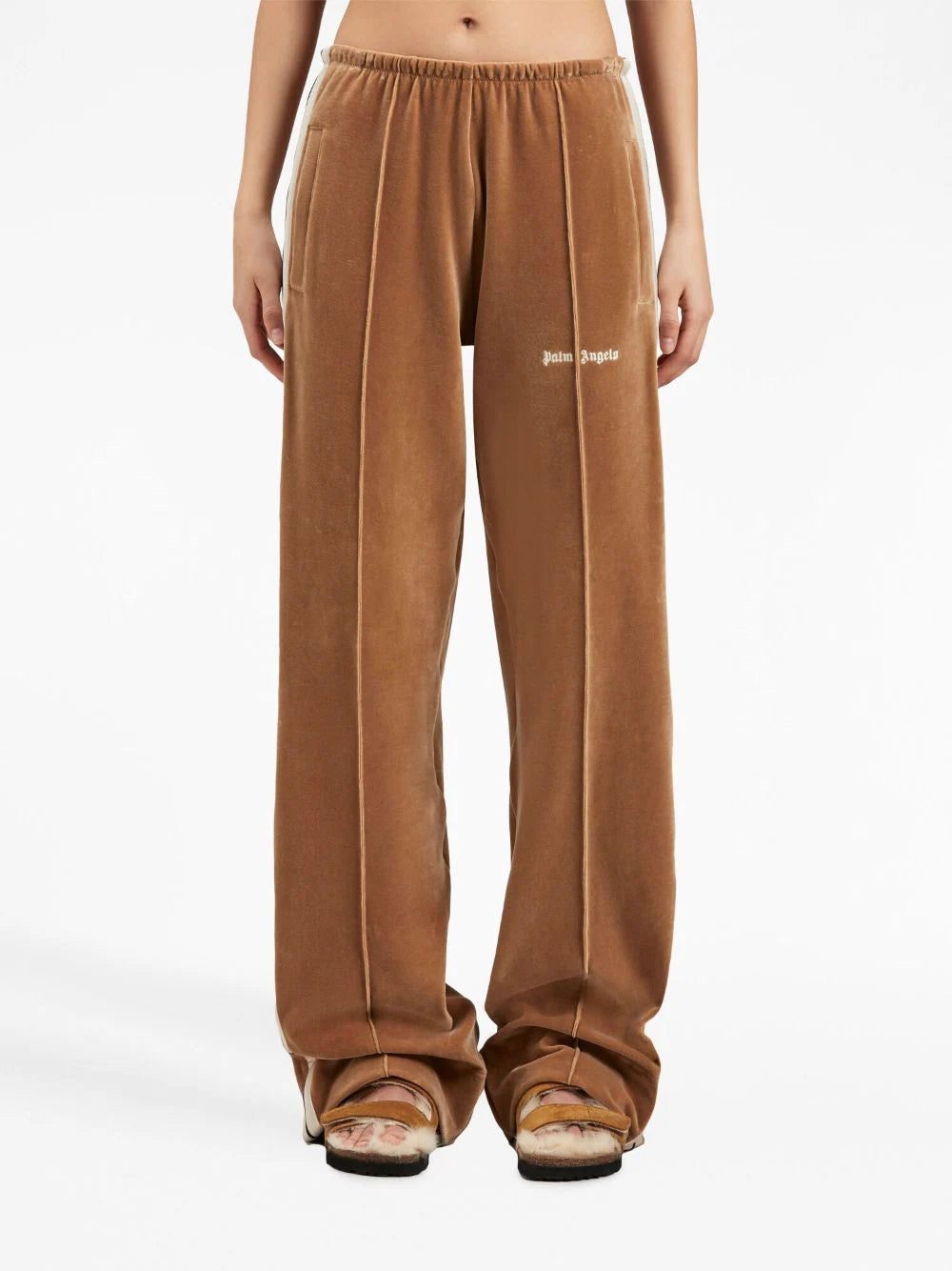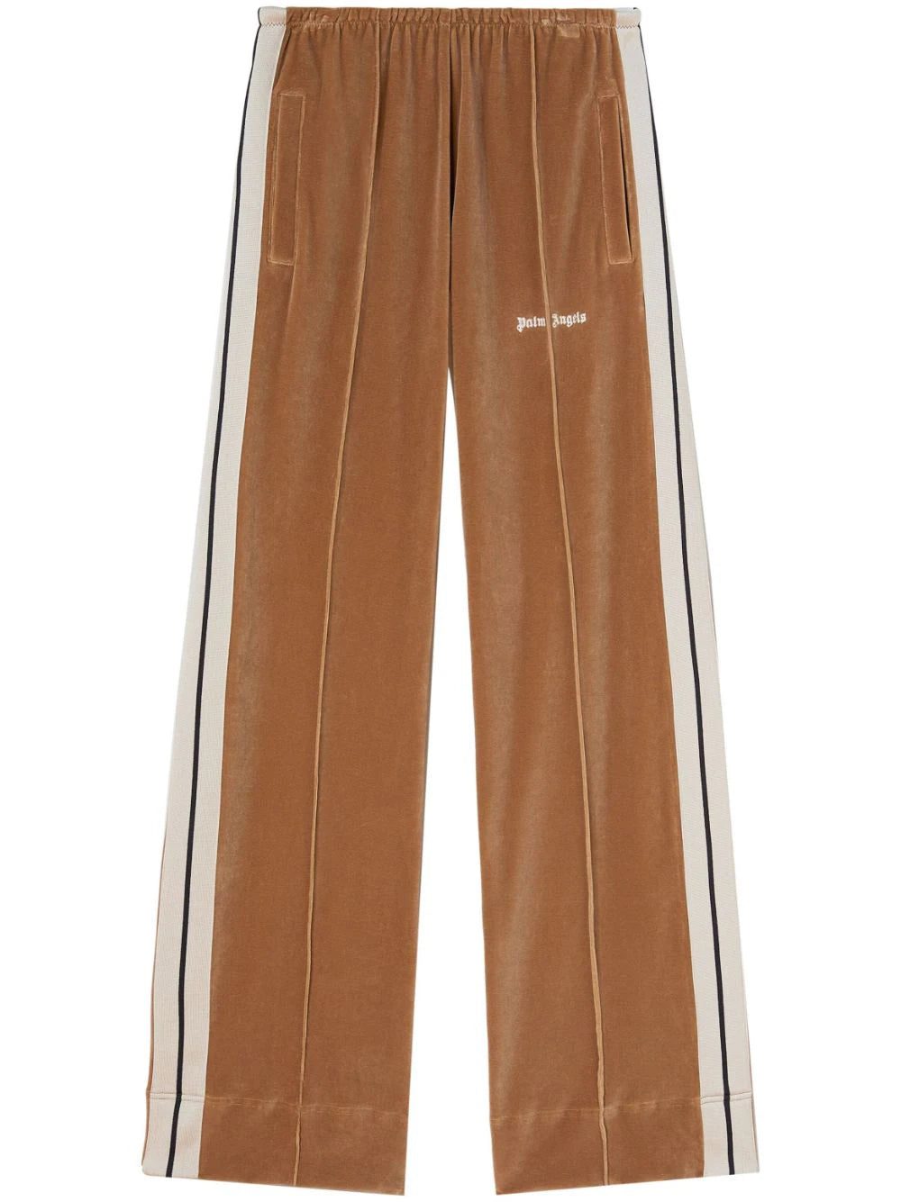 Streetwear label PALM ANGELS combines a signature Italian flair with a contemporary aesthetic inspired by American subcultures. Both are imbued in this pair of trousers, where the brand reinvents the track pants with modern velvet effect and wide-leg silhouette, for an elevated take on the sporty staple.