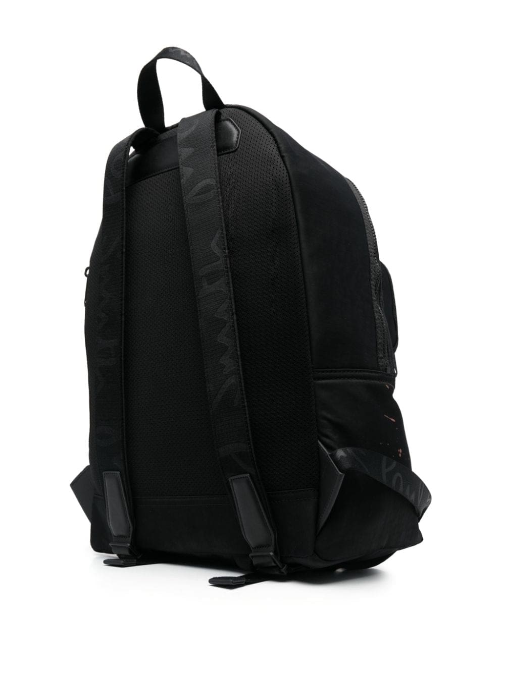 black/multicolour calf leather/recycled nylon paint splatter detail logo print to the front all-around zip fastening single top handle two adjustable shoulder straps front zip-fastening pouch pocket main compartment internal logo stamp internal zip-fastening pocket
