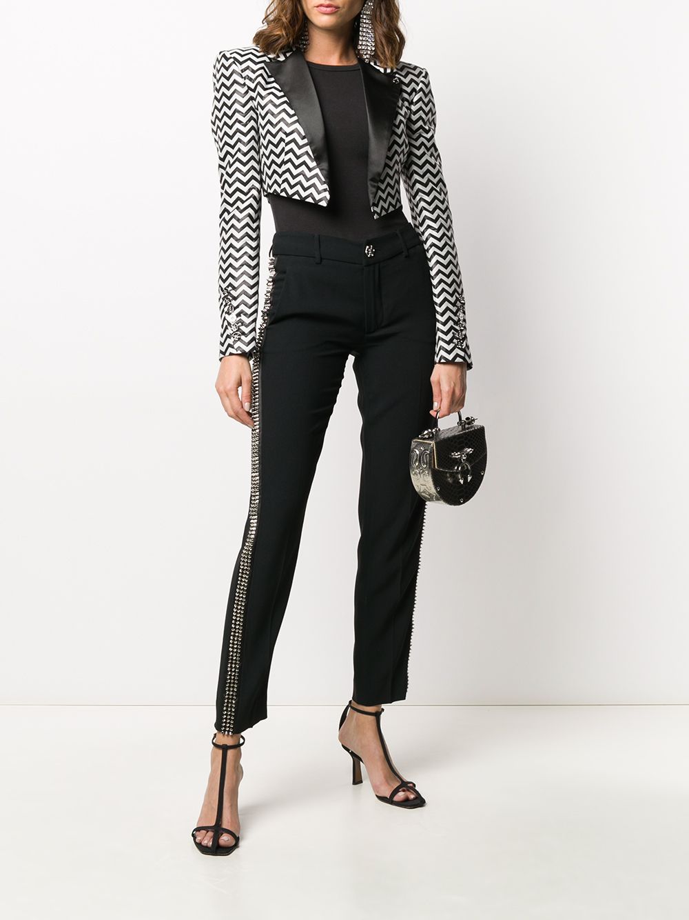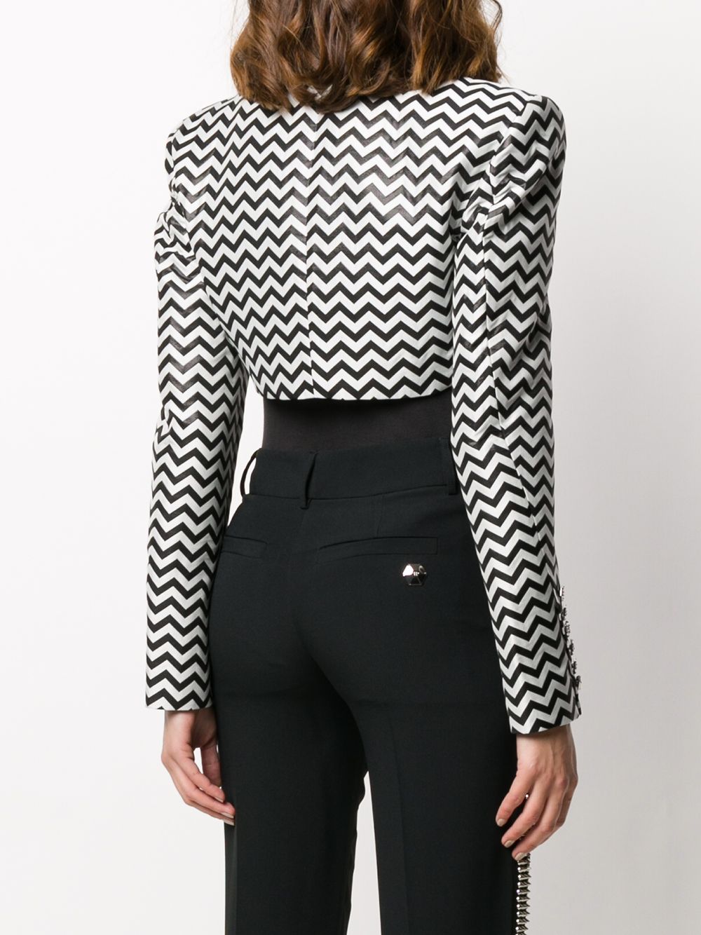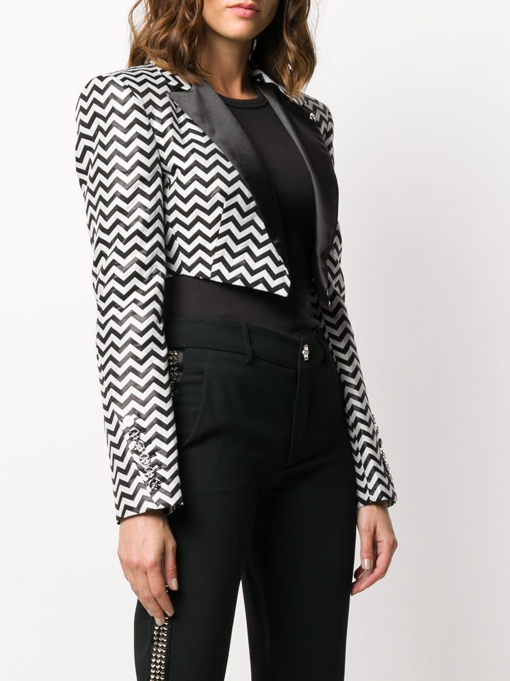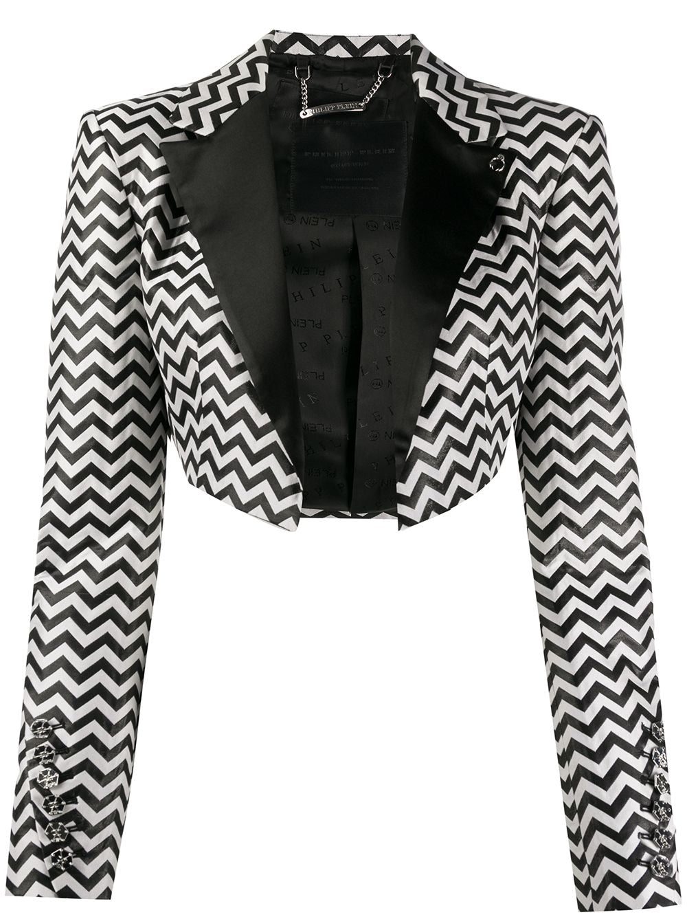Black Bolero Rock cropped jacket from Philipp Plein featuring a two tone design, a zigzag pattern, peaked lapels, long sleeves and an open front.