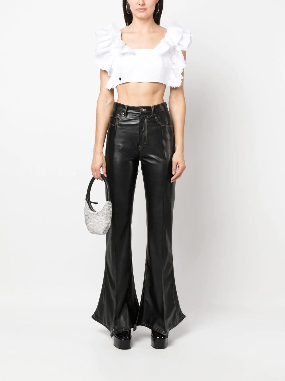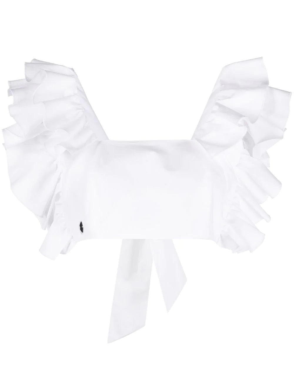 cropped ruffle-trimmed top from PHILIPP PLEIN featuring cloud white, cotton, cropped, ruffle detailing, round neck and sleeveless.