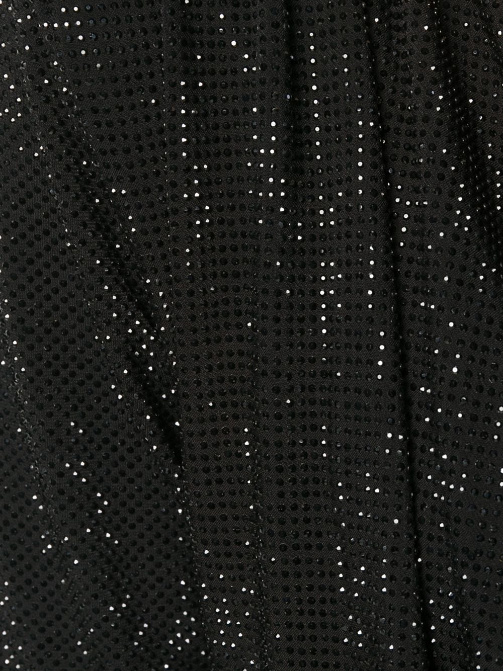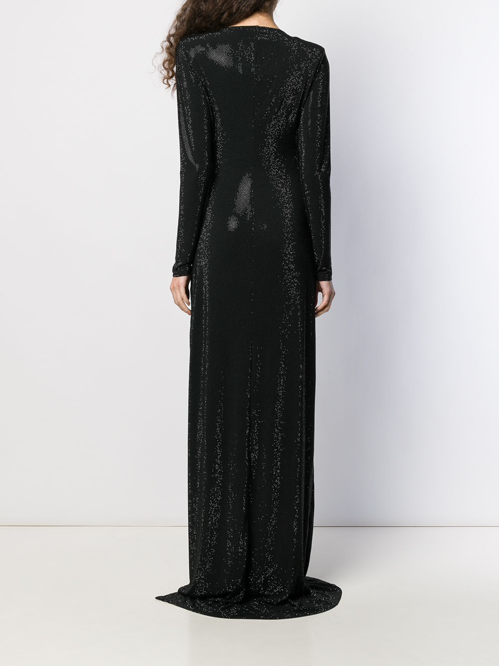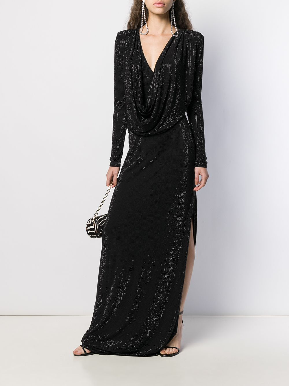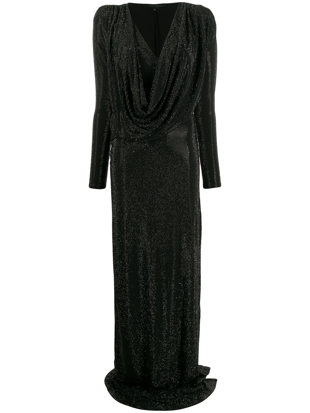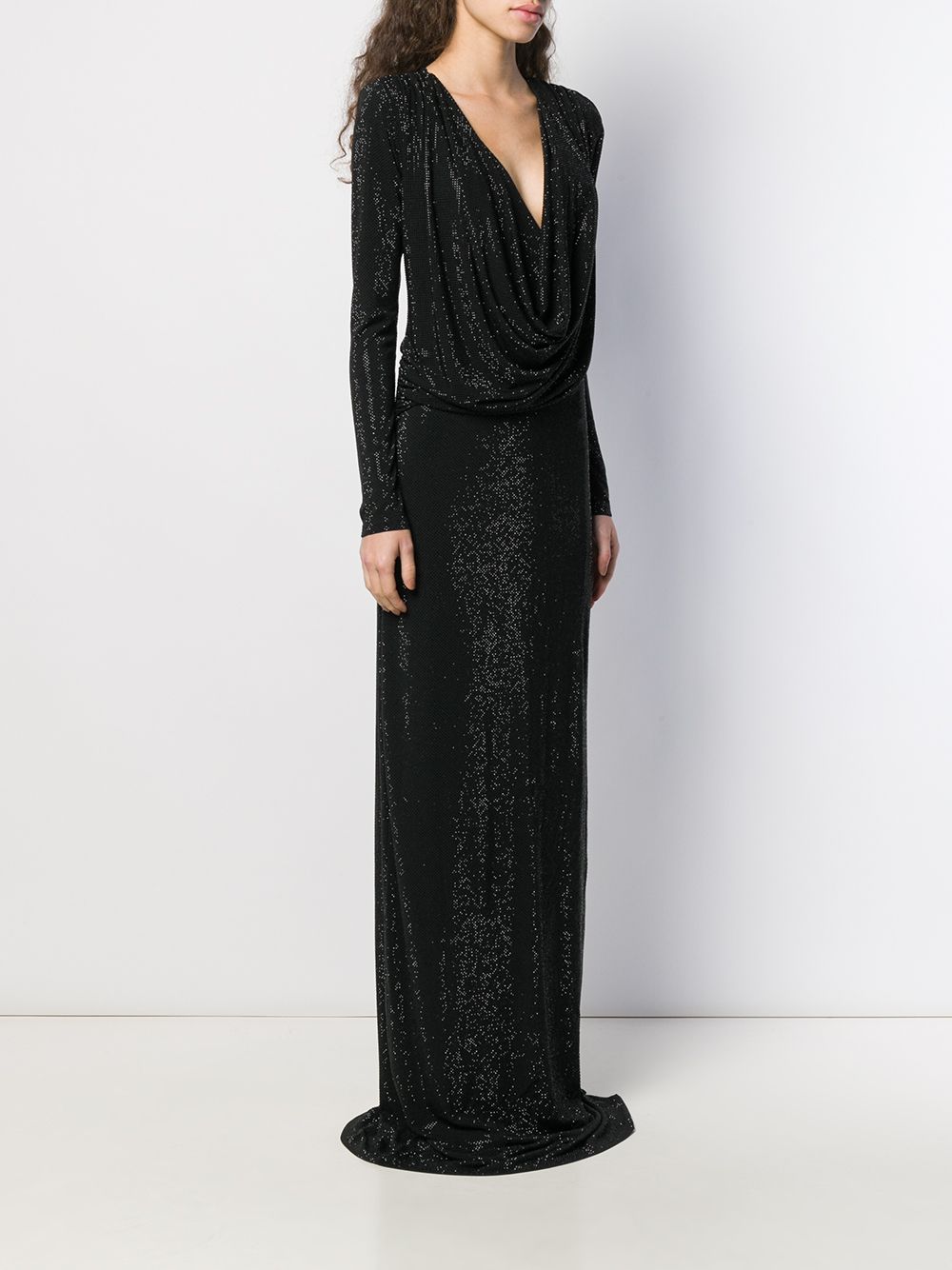 Black crystal embellished gown from Philipp Plein featuring a draped neckline, long sleeves, a fitted silhouette and a long length.