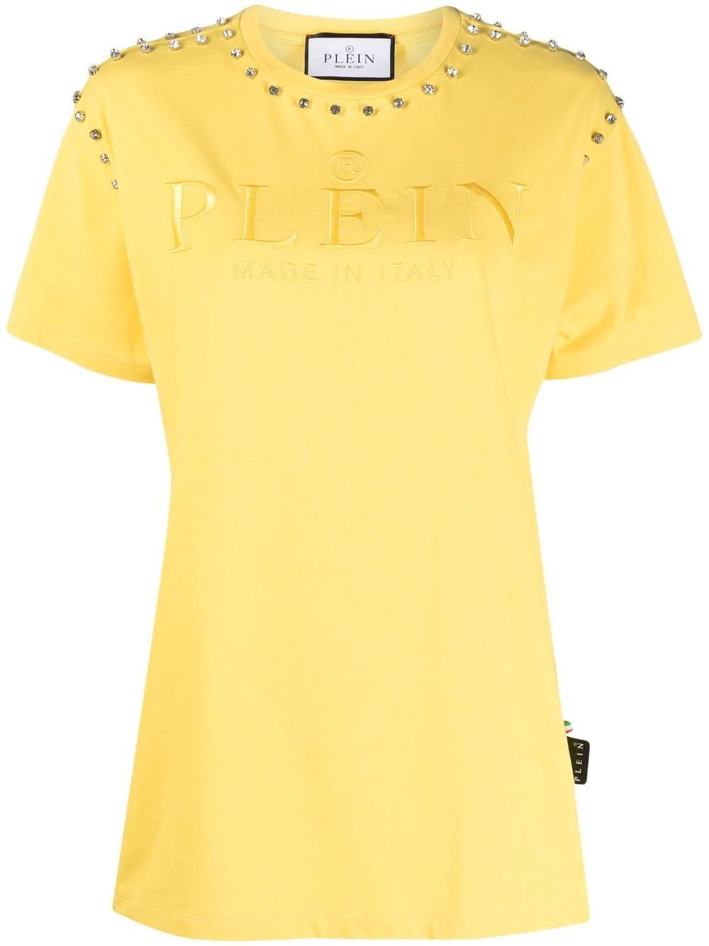 crystal-embellished logo-embroidered T-shirt from PHILIPP PLEIN featuring yellow, cotton, embroidered logo to the front, crystal embellishment, round neck and short sleeves.
