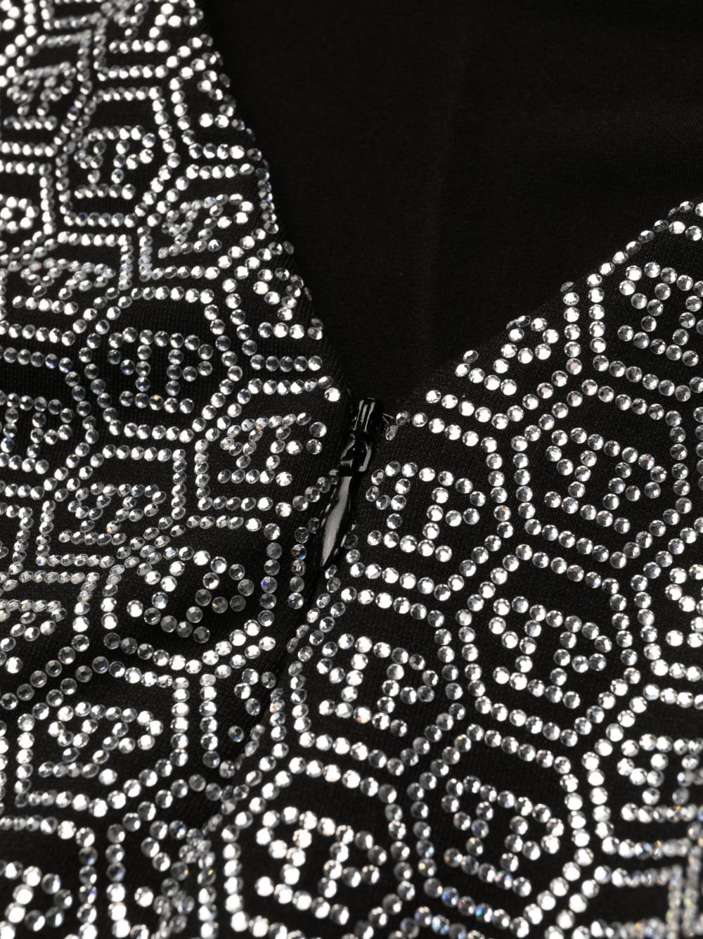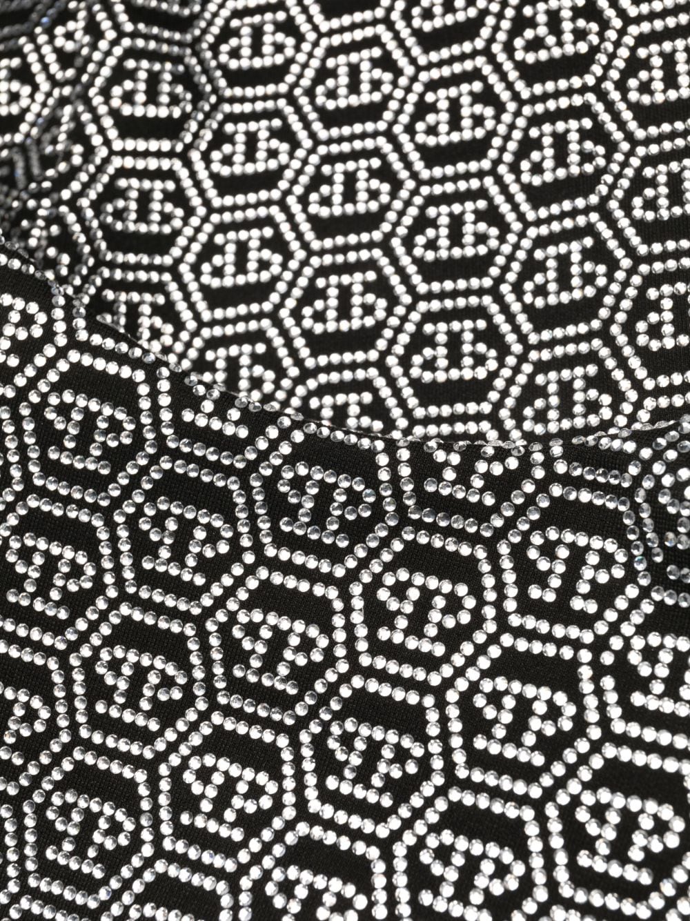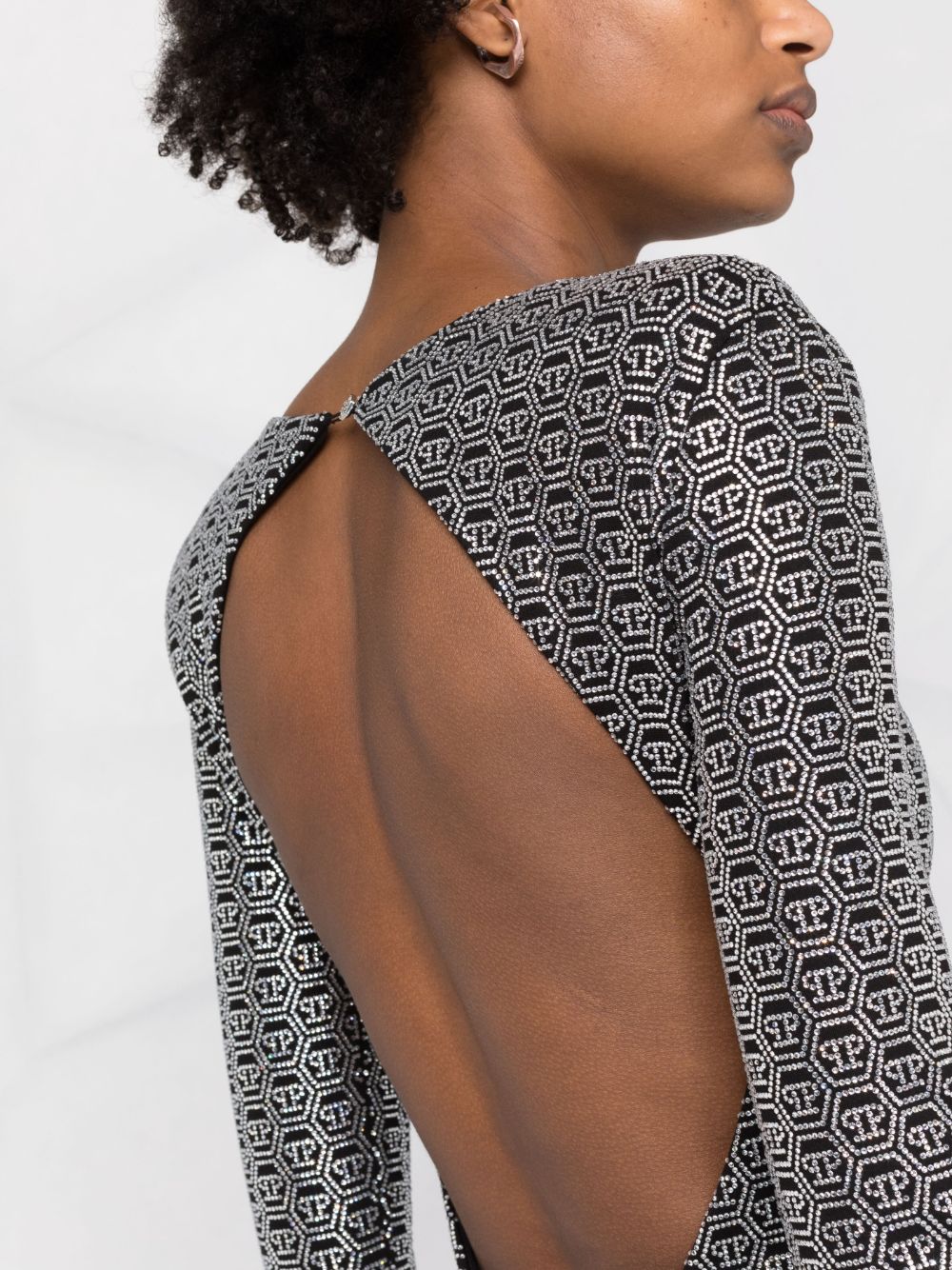 silver/black cotton bodycon design crystal embellishment monogram print round neck open back rear zip fastening long sleeves straight hem