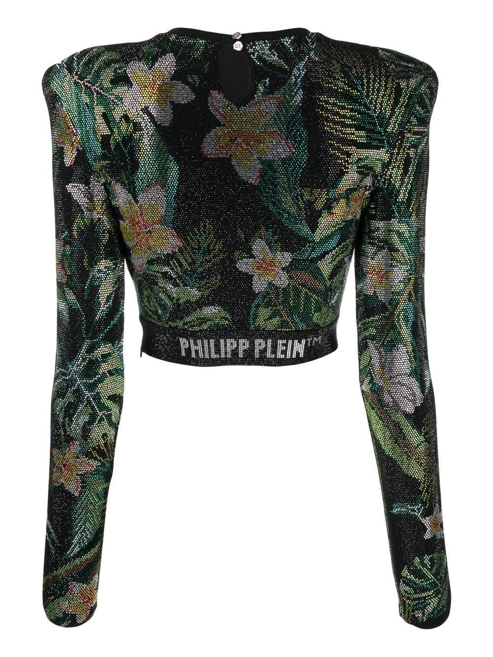 crystal-embellished long-sleeved top from PHILIPP PLEIN featuring black/multicolour, cotton blend, crystal embellishment, patterned floral print, crew neck, long sleeves and logo underband.
