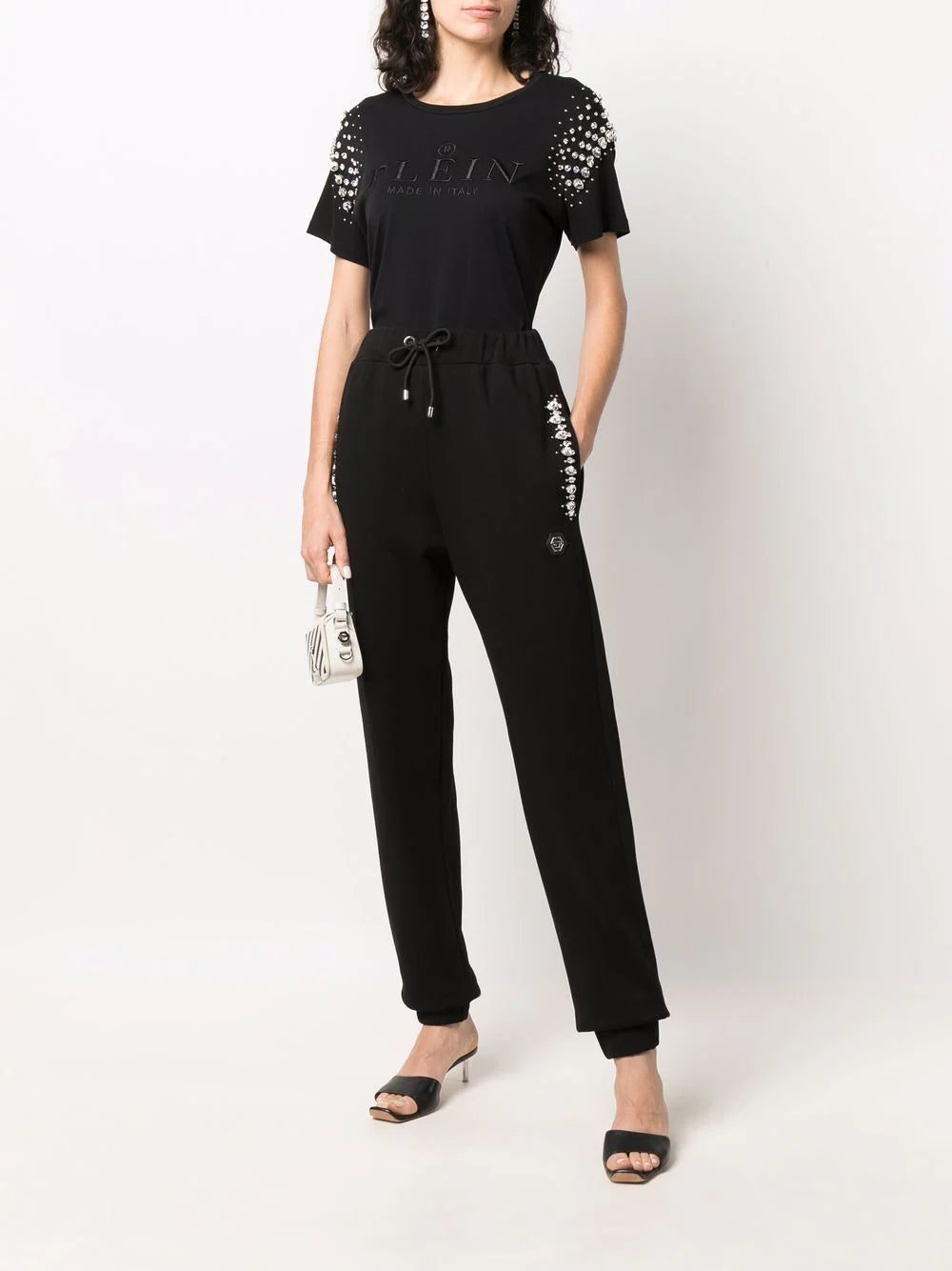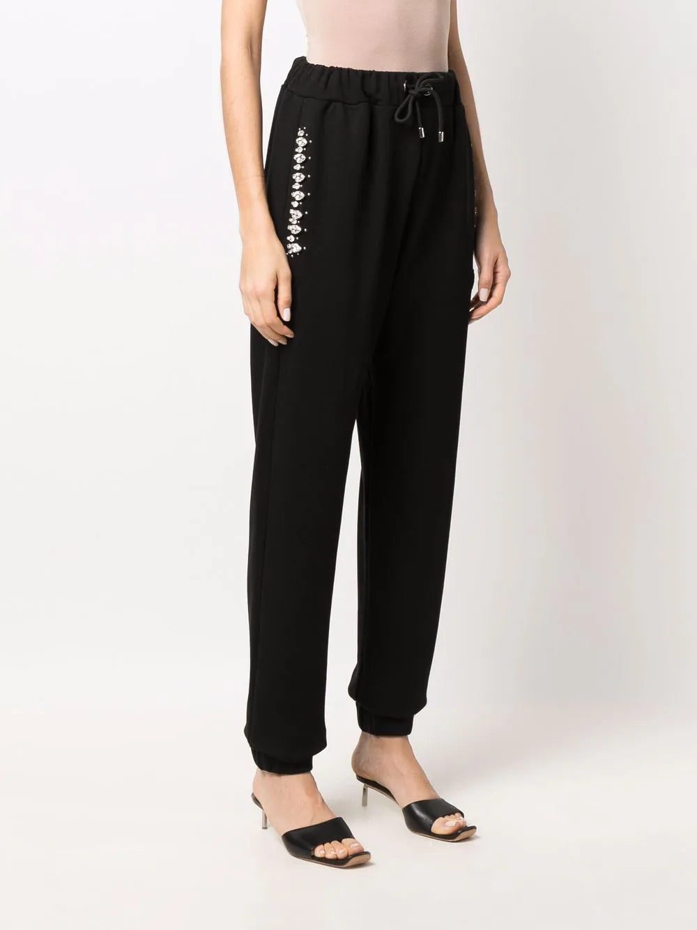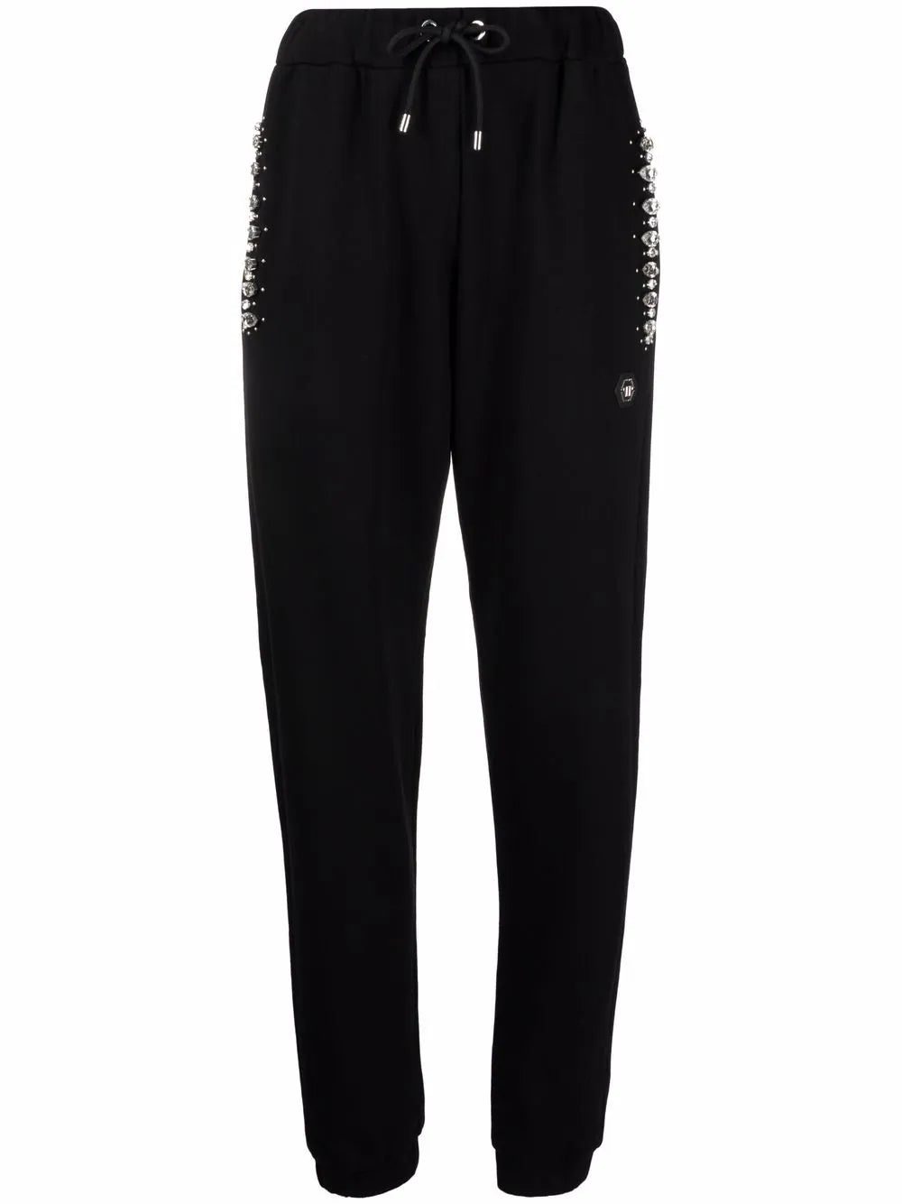 Black cotton crystal iconic-plein track pants from PHILIPP PLEIN featuring crystal embellishment, logo plaque, elasticated ankles and elasticated drawstring waistband.