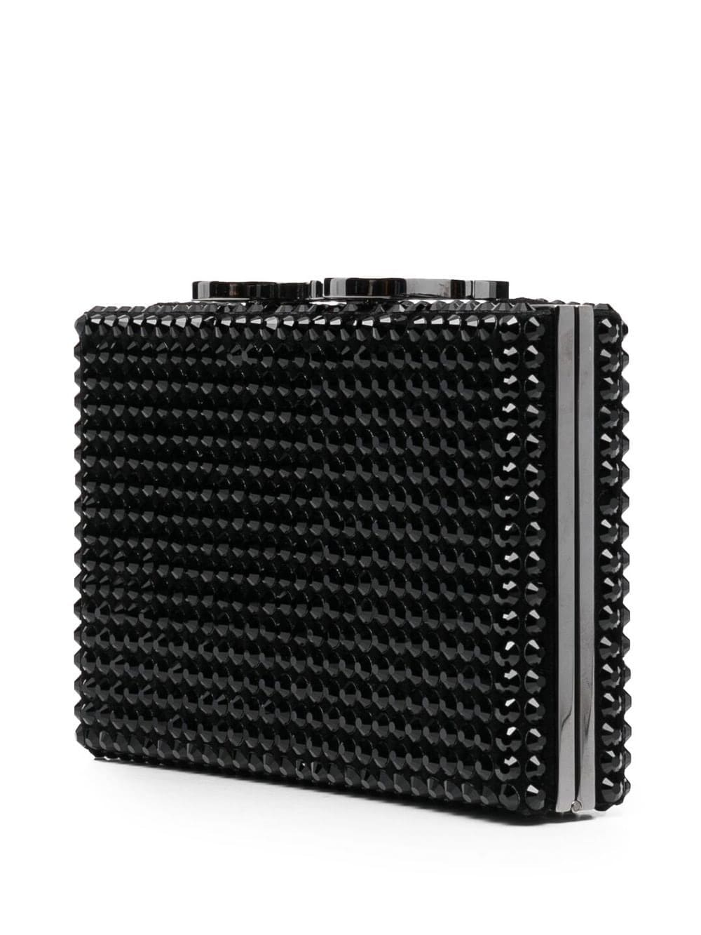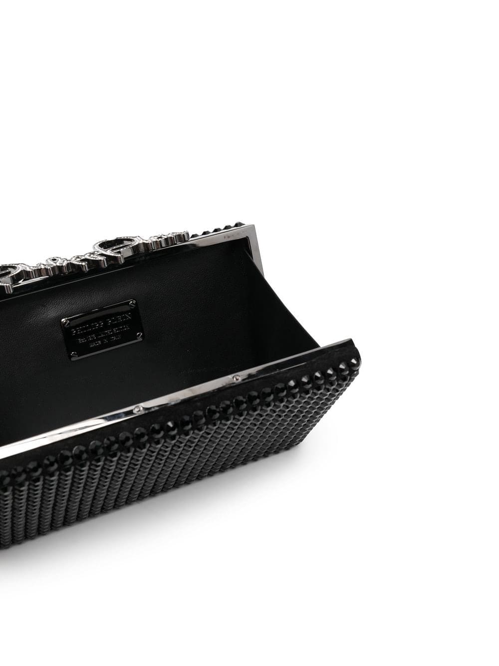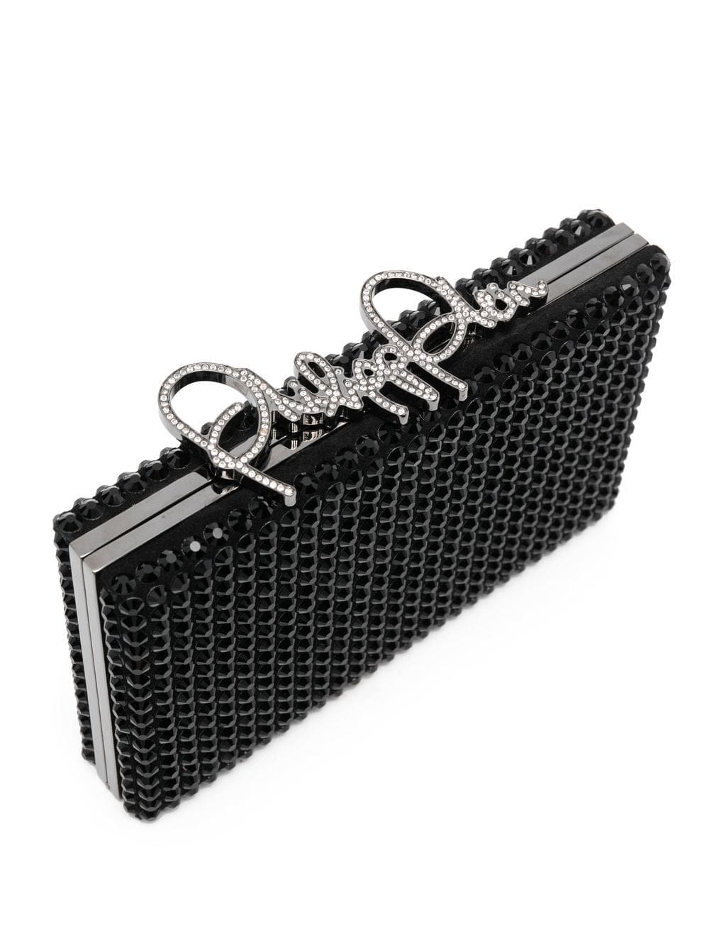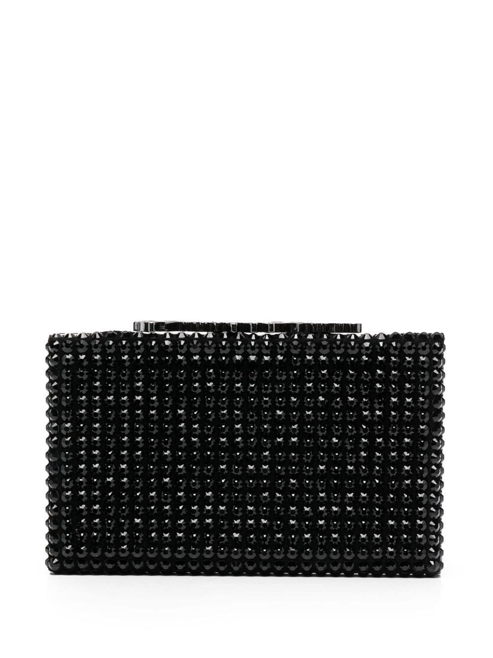black crystal embellishment silver-tone logo lettering snap-lock closure main compartment jet black