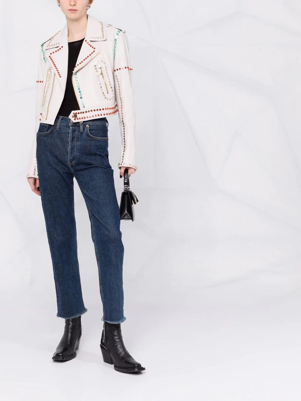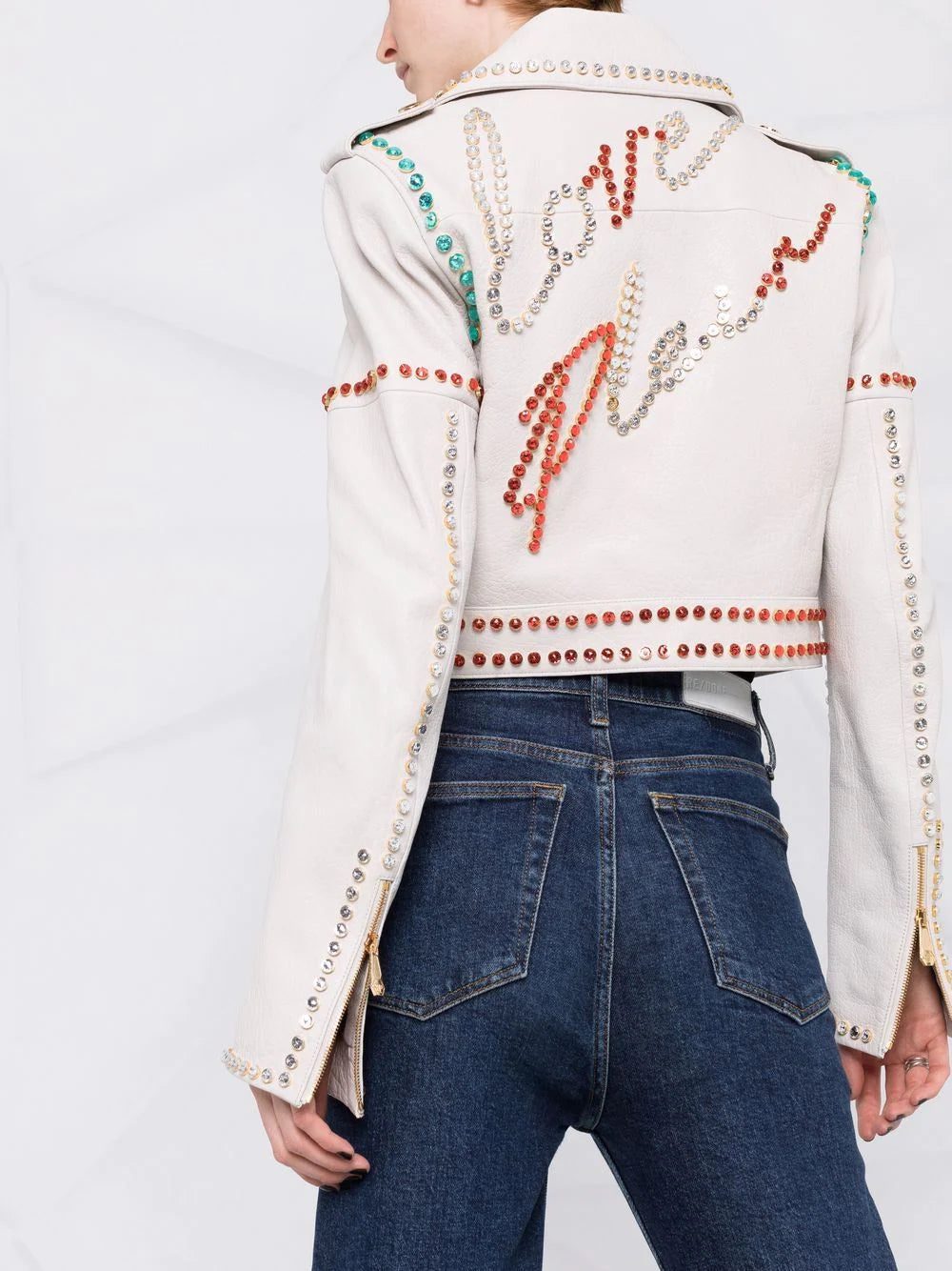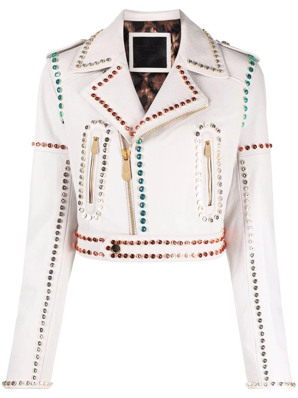 Staying true to the brands contemporary approach, this cropped biker jacket forms part of Philipp Plein's SS22 collection. Fabricated in white lambskin leather, multicolour crystal embellishments elevate this everyday piece.