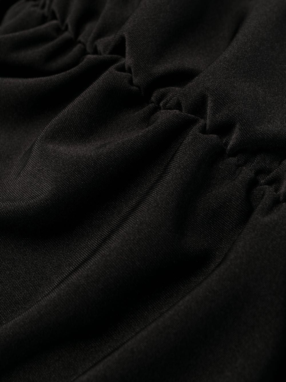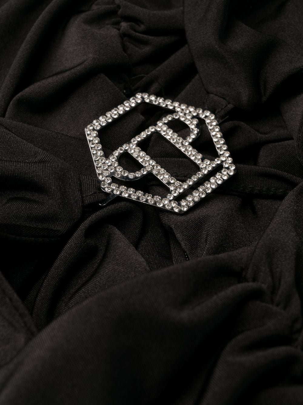 A daring aesthetic encapsulates Philipp Plein's spirit, as the brand focuses on high-octane designs to evoke a strong attitude. In this black minidress, it is done through construction details like the ruched design that is accentuated by carefully placed cut-outs.