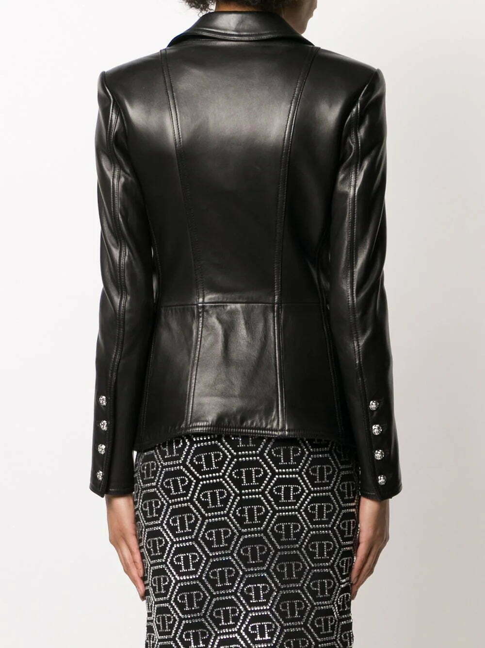 Black leather double breasted blazer from Philipp Plein featuring a wide lapel, a double breasted front fastening, long sleeves and flap pockets.