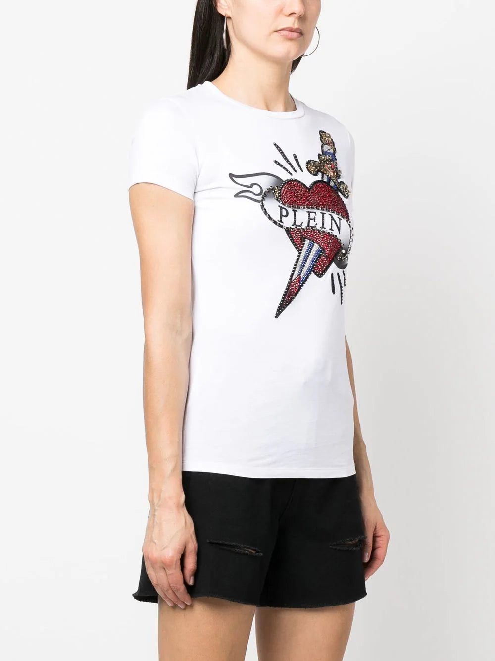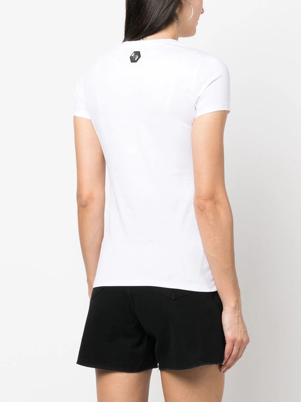 embellished-logo detail T-shirt from PHILIPP PLEIN featuring cloud white, cotton, crystal embellishment, logo print to the front, round neck, short sleeves and straight hem.