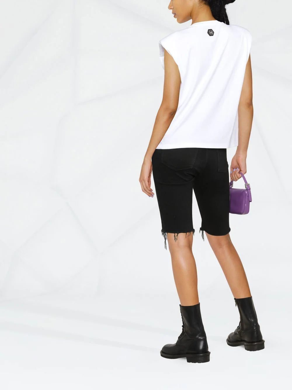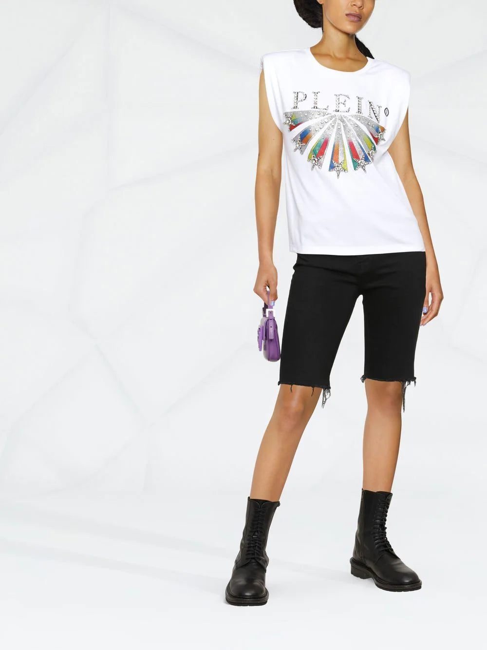 Philipp Plein sits their logo atop a star graphic print at the chest of this sleeveless T-shirt, adding to the striking design through the tonal crystal embellishments and padded shoulder silhouette.