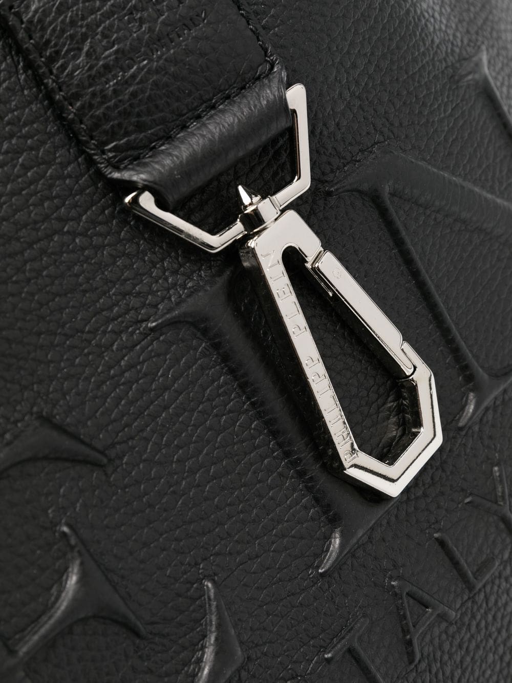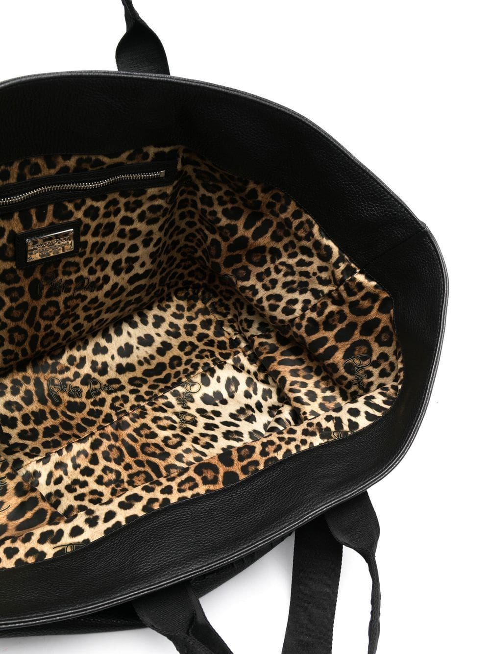 black calf leather embossed finish embossed logo to the front detachable shoulder strap two rolled top handles open top leopard print lining internal zip-fastening pocket
