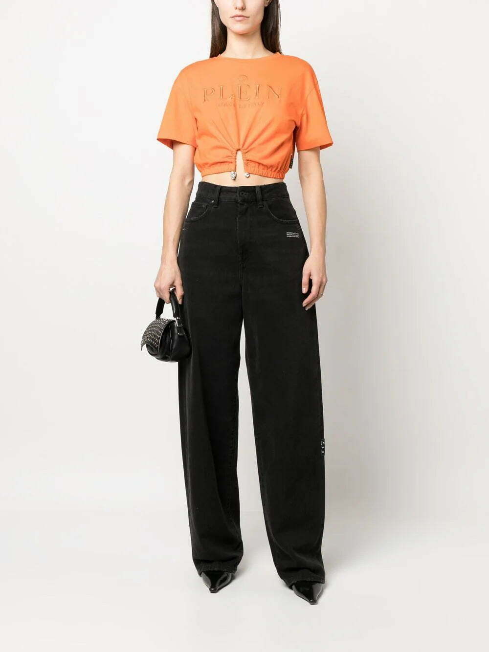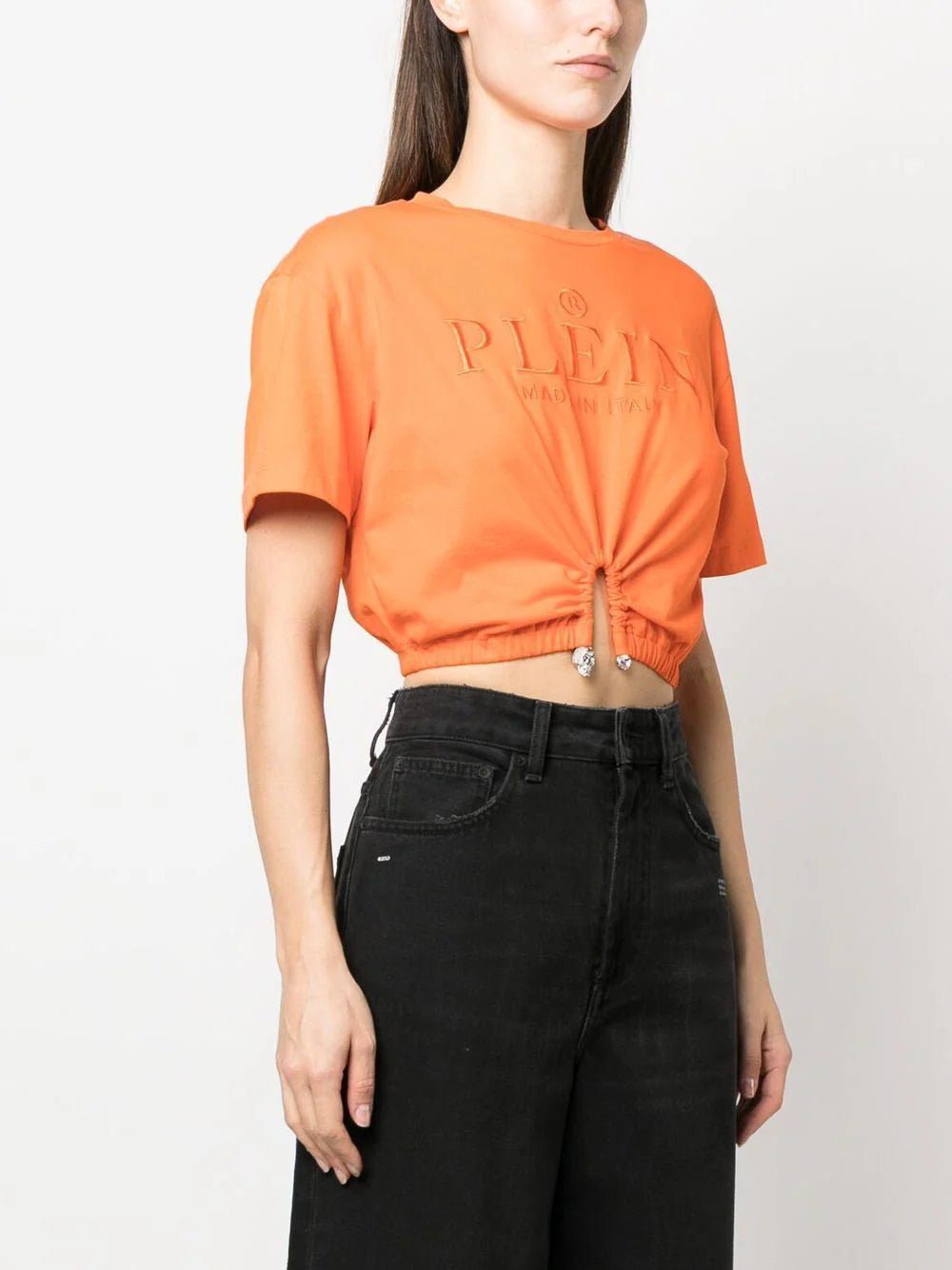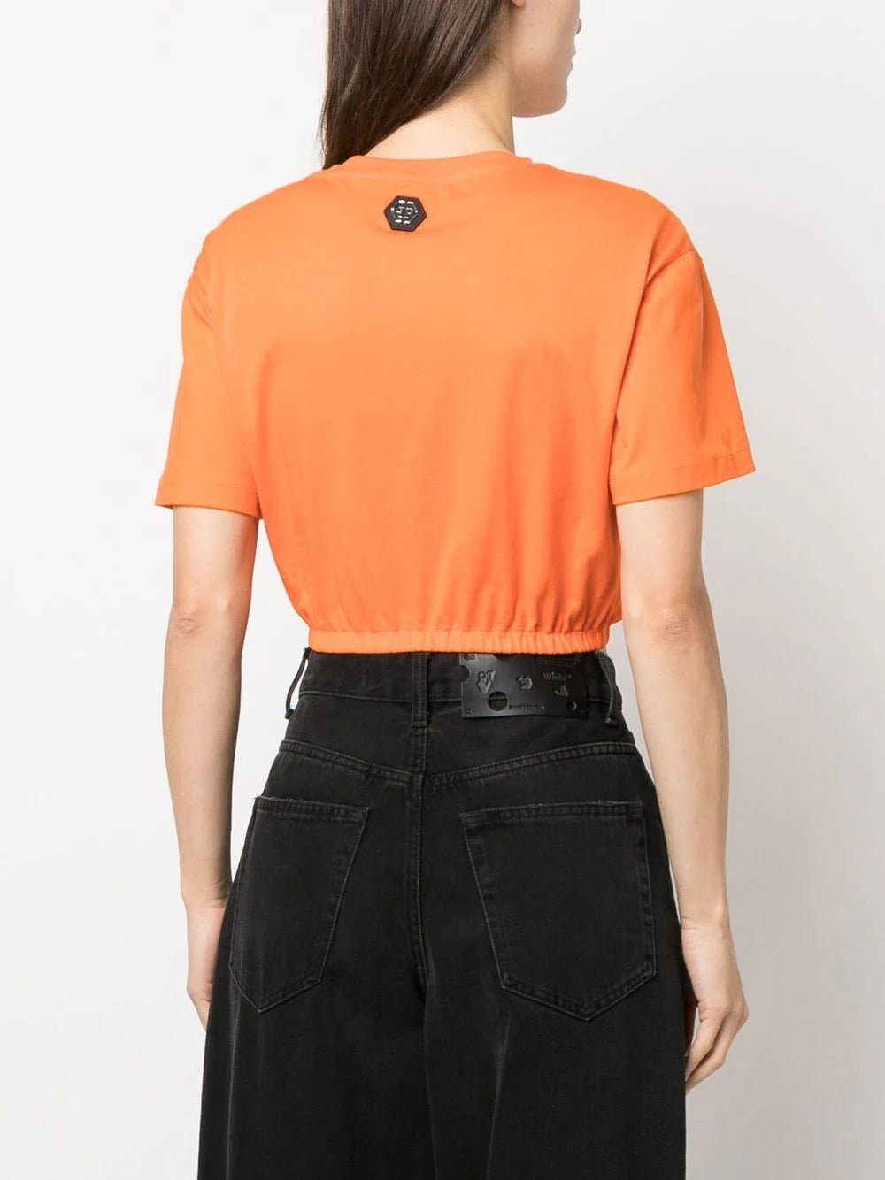 embroidered-logo cropped T-shirt from PHILIPP PLEIN featuring orange, cotton, embroidered logo to the front, crew neck, short sleeves, straight hem, appliqué detail and cropped.