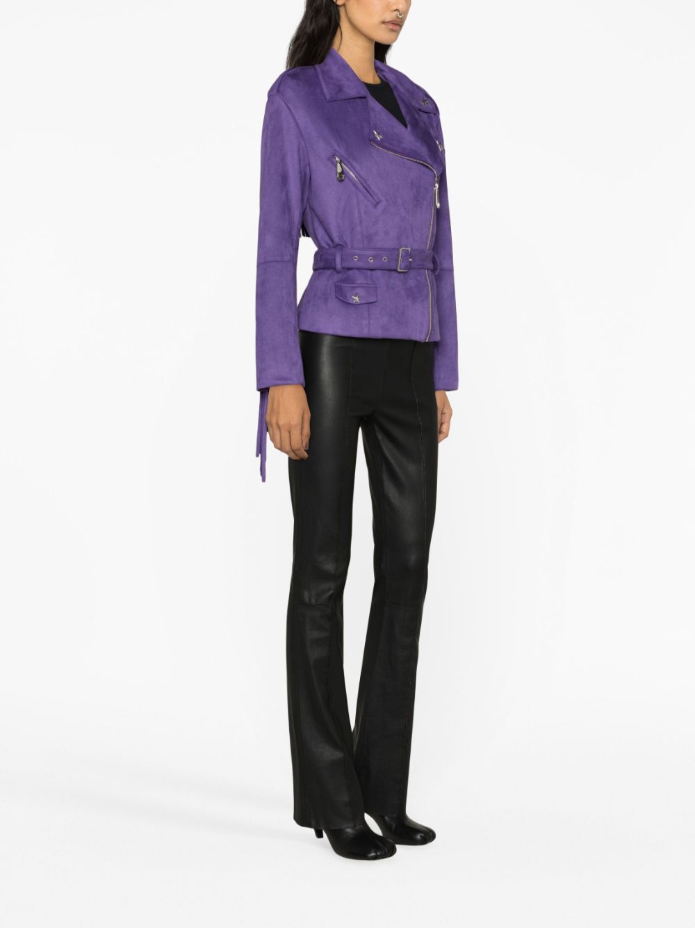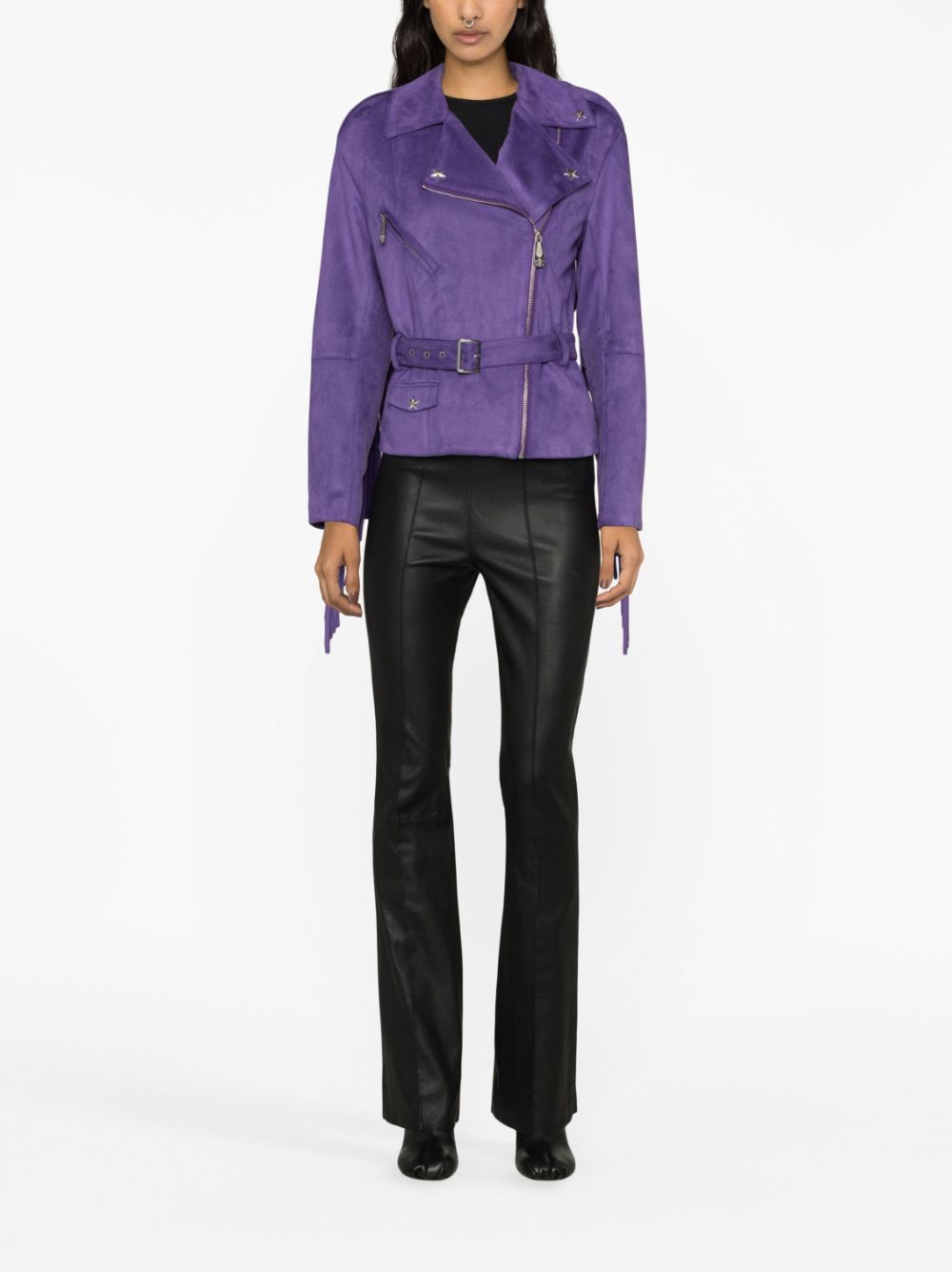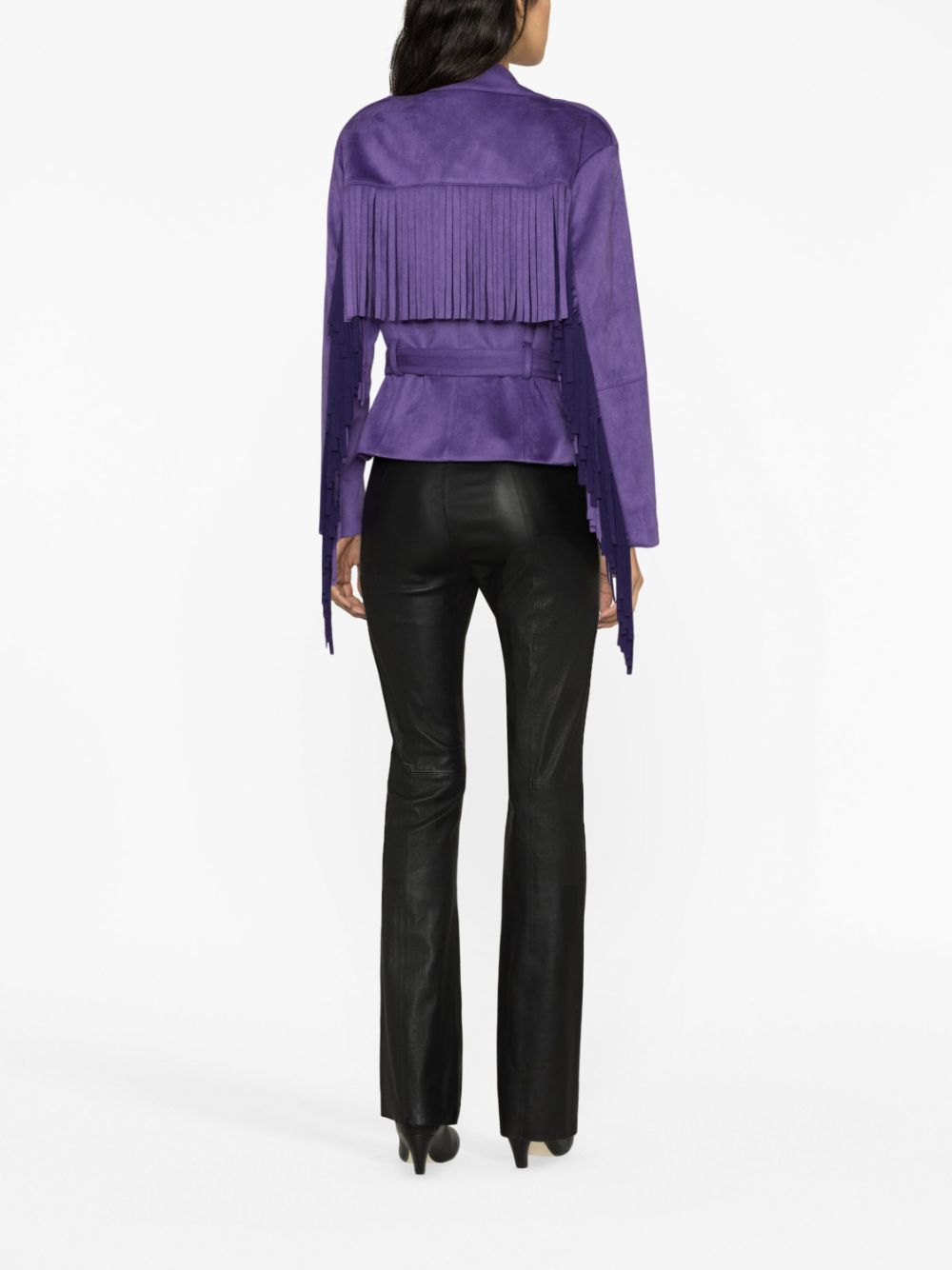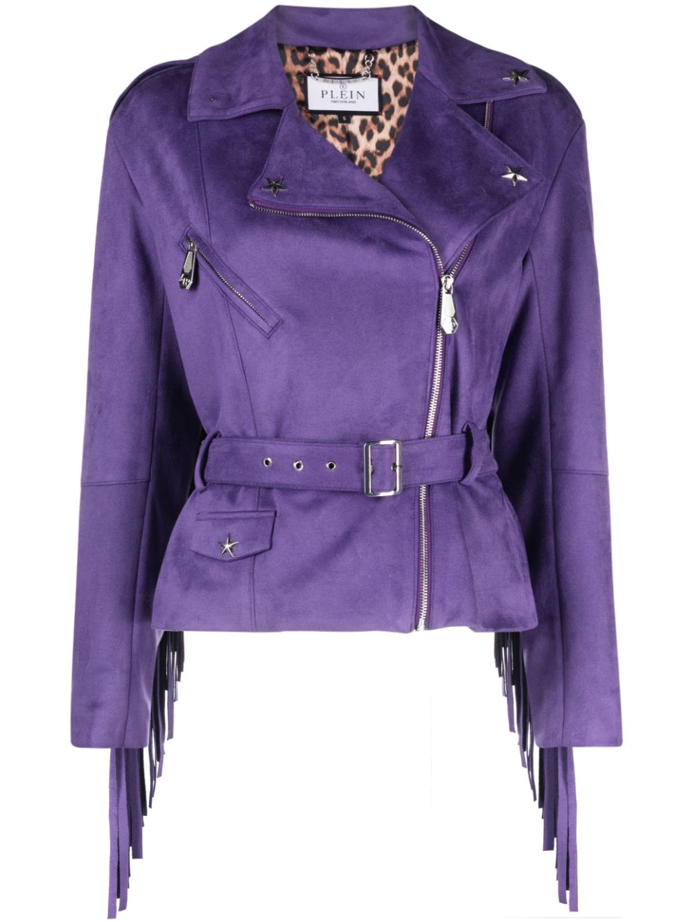 This biker jacket showcases Philipp Plein's extravagant sensibilities with a cruelty-free twist. Crafted from supple faux suede in lavender purple, it boasts a structured, belted silhouette. Fringing along the back and sleeves and silver-tone star studs accent the piece, enhancing its rocker mood.