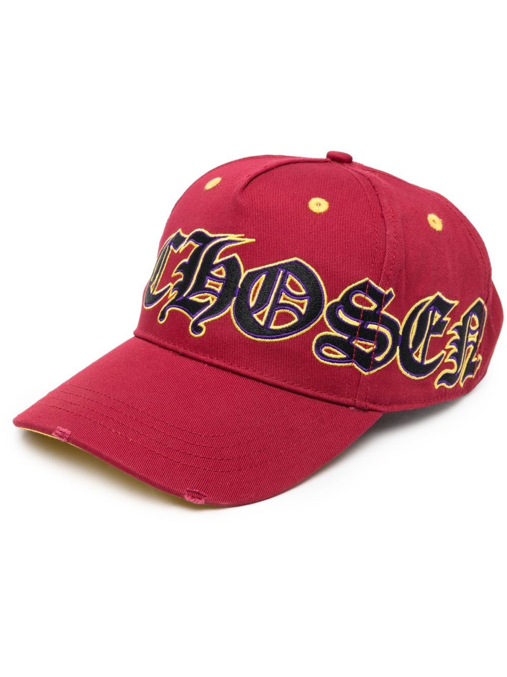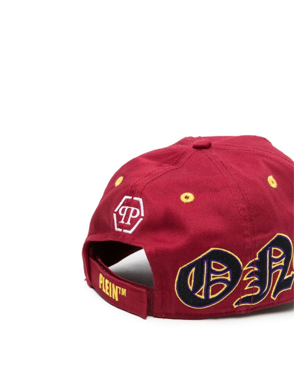 Gothic logo-print distressed cap from PHILIPP PLEIN featuring bordeaux red, cotton, gothic print, logo print to the front, distressed finish, curved peak and adjustable strap to the rear.