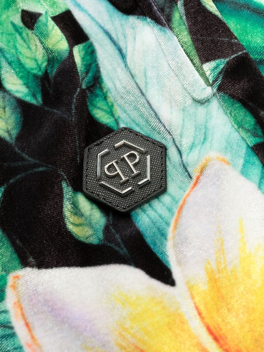 Hawaii-print tracksuit set from PHILIPP PLEIN featuring multicolour, cotton, ribbed trim, all-over floral print, silver-tone hardware, engraved logo, logo patch at the chest, band collar, front zip fastening, long sleeves, cropped, elasticated waistband, tapered leg and elasticated ankles.