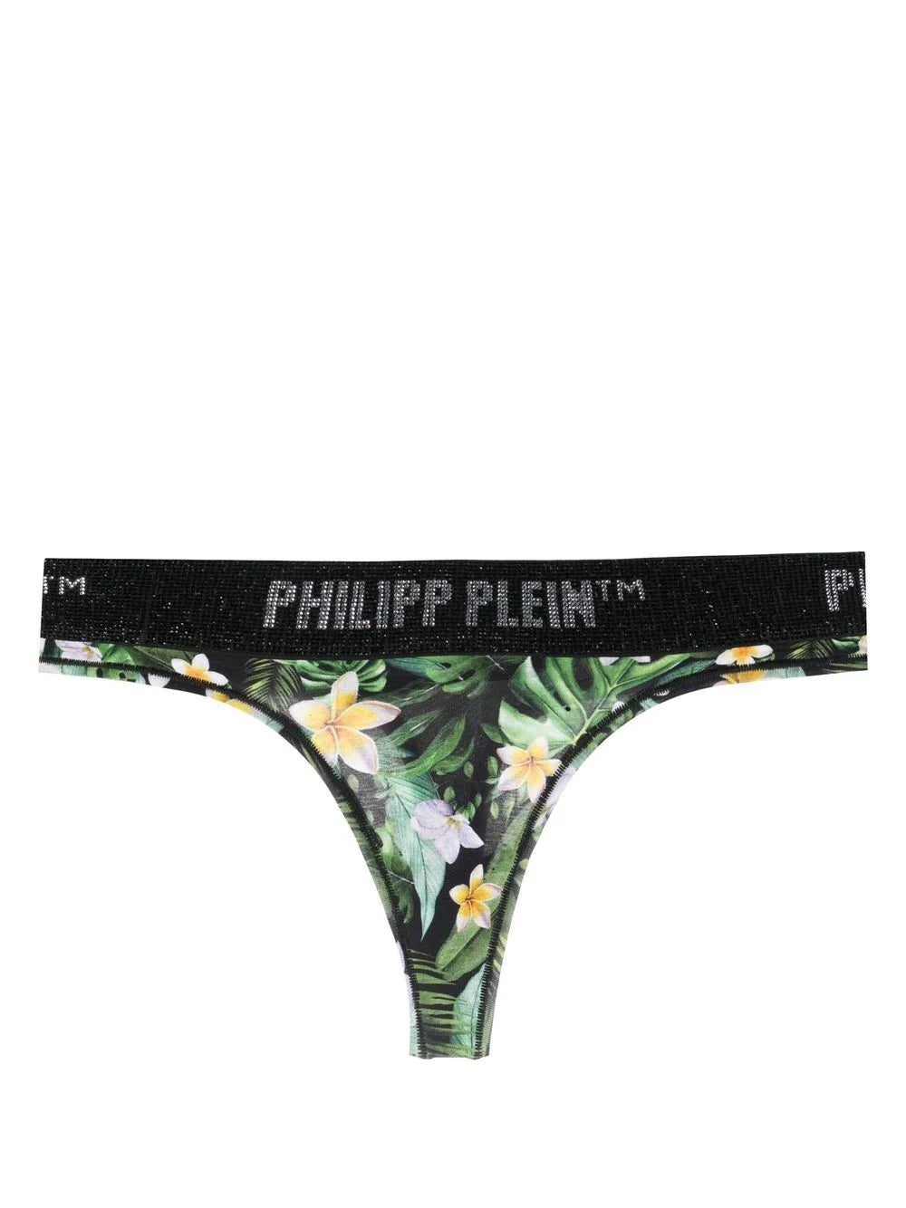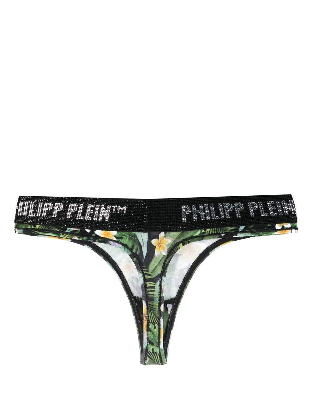 black/green Hawaiian print logo waistband rhinestone embellishment thong style Just a reminder that this piece must be tried on over your own garments.