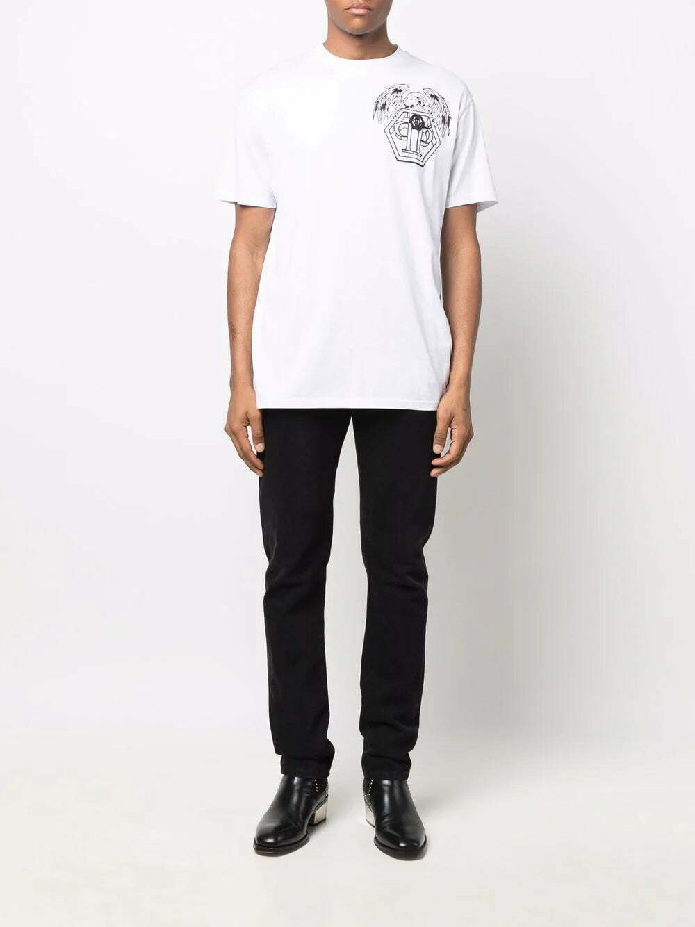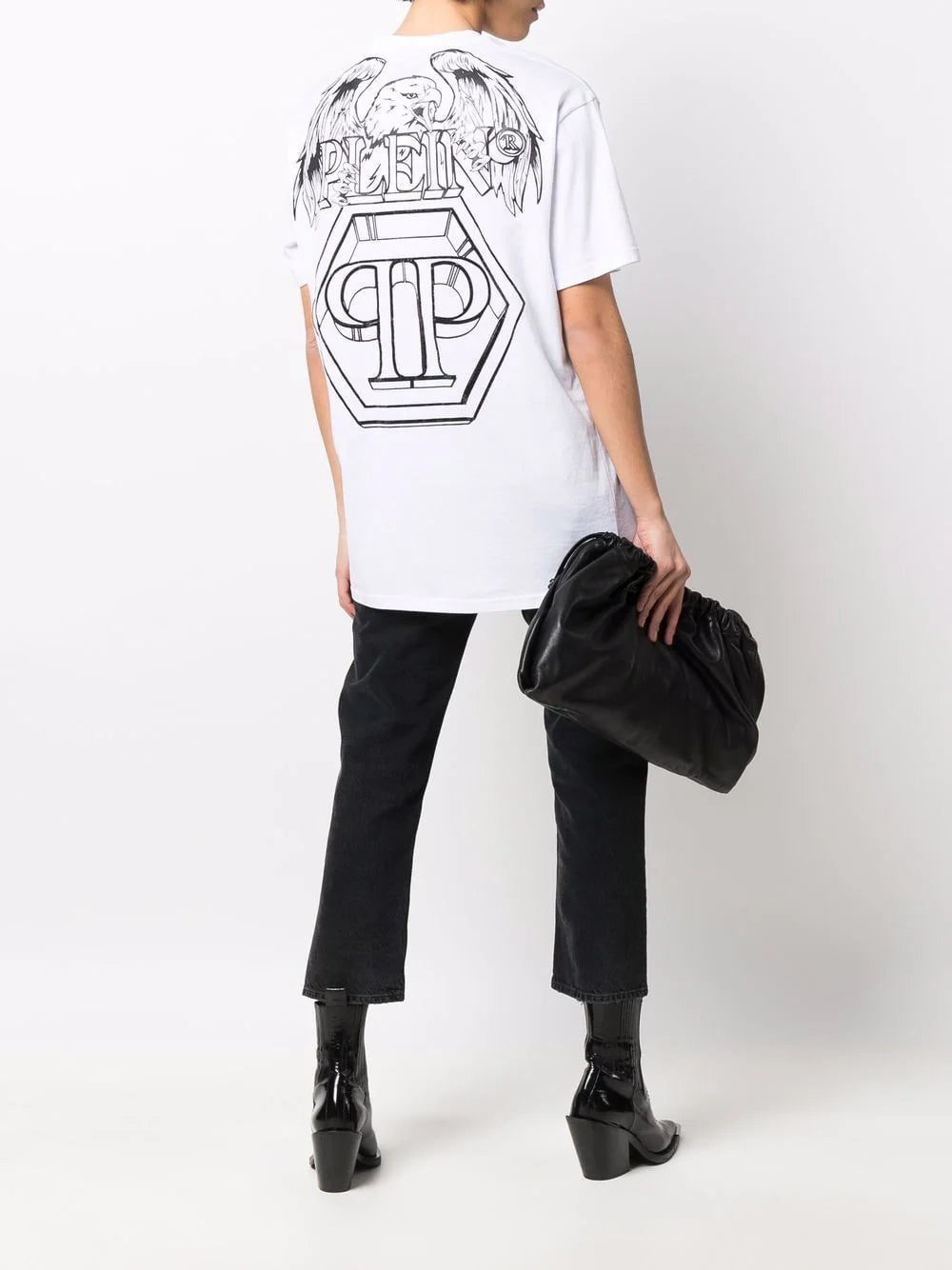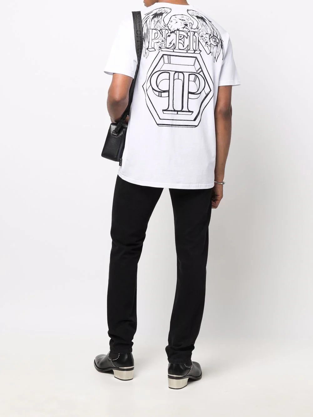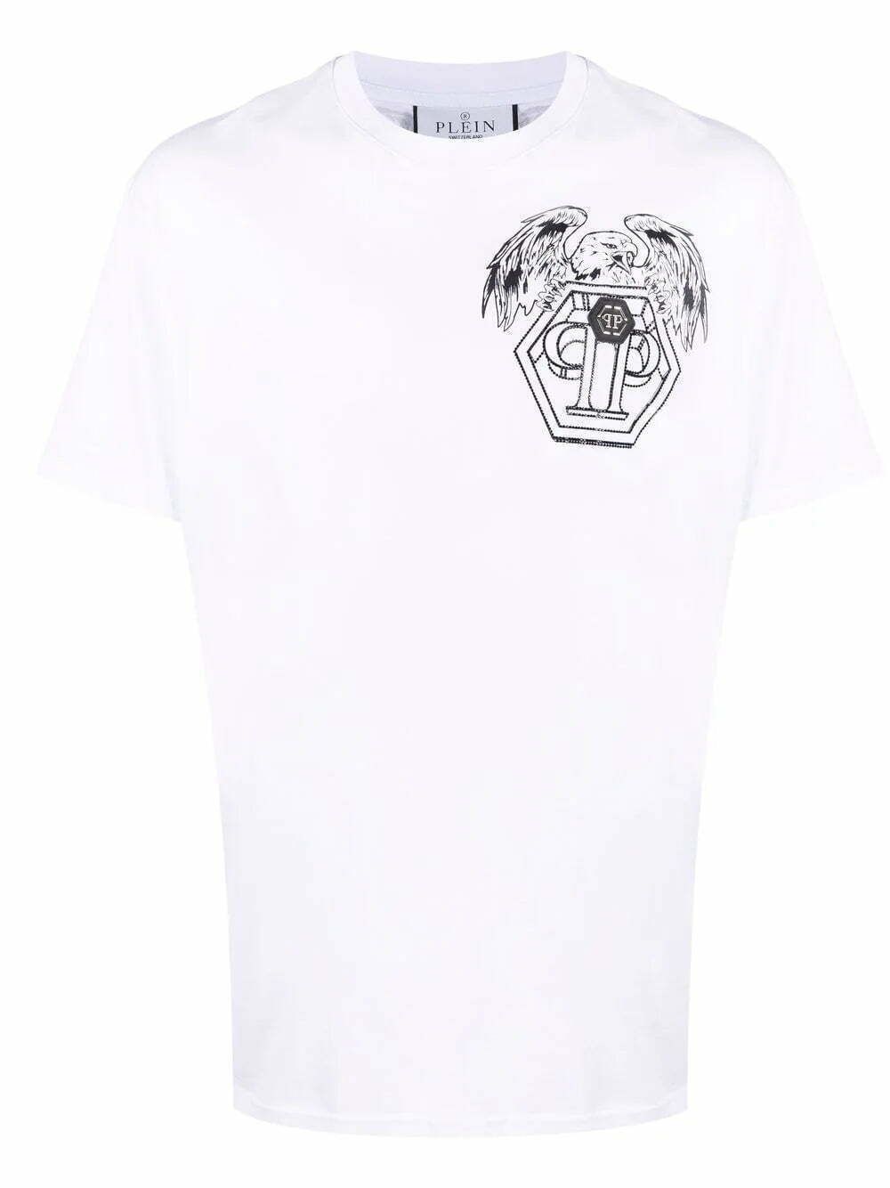 Boasting a unisex silhouette, Philipp Plein's embellished T-shirt is decorated with tonal rhinestones for barely-there interest. It is detailed with the brand's signature hexagonal logo print at the chest and back alongside a graphic eagle motif.