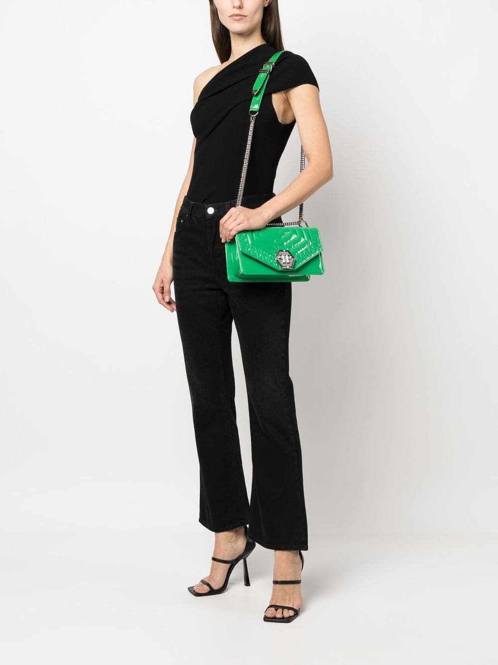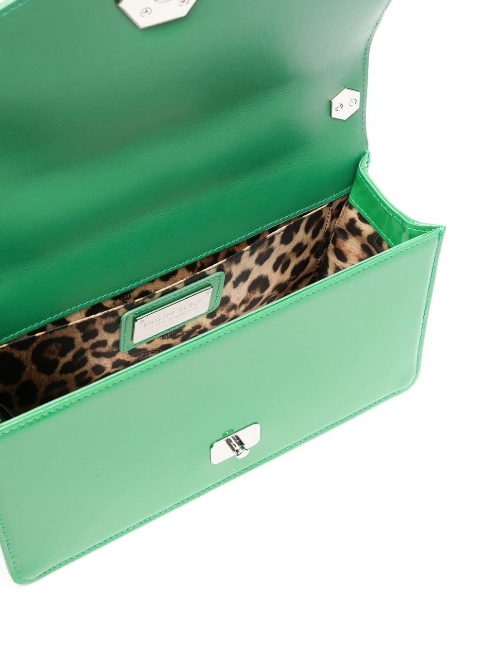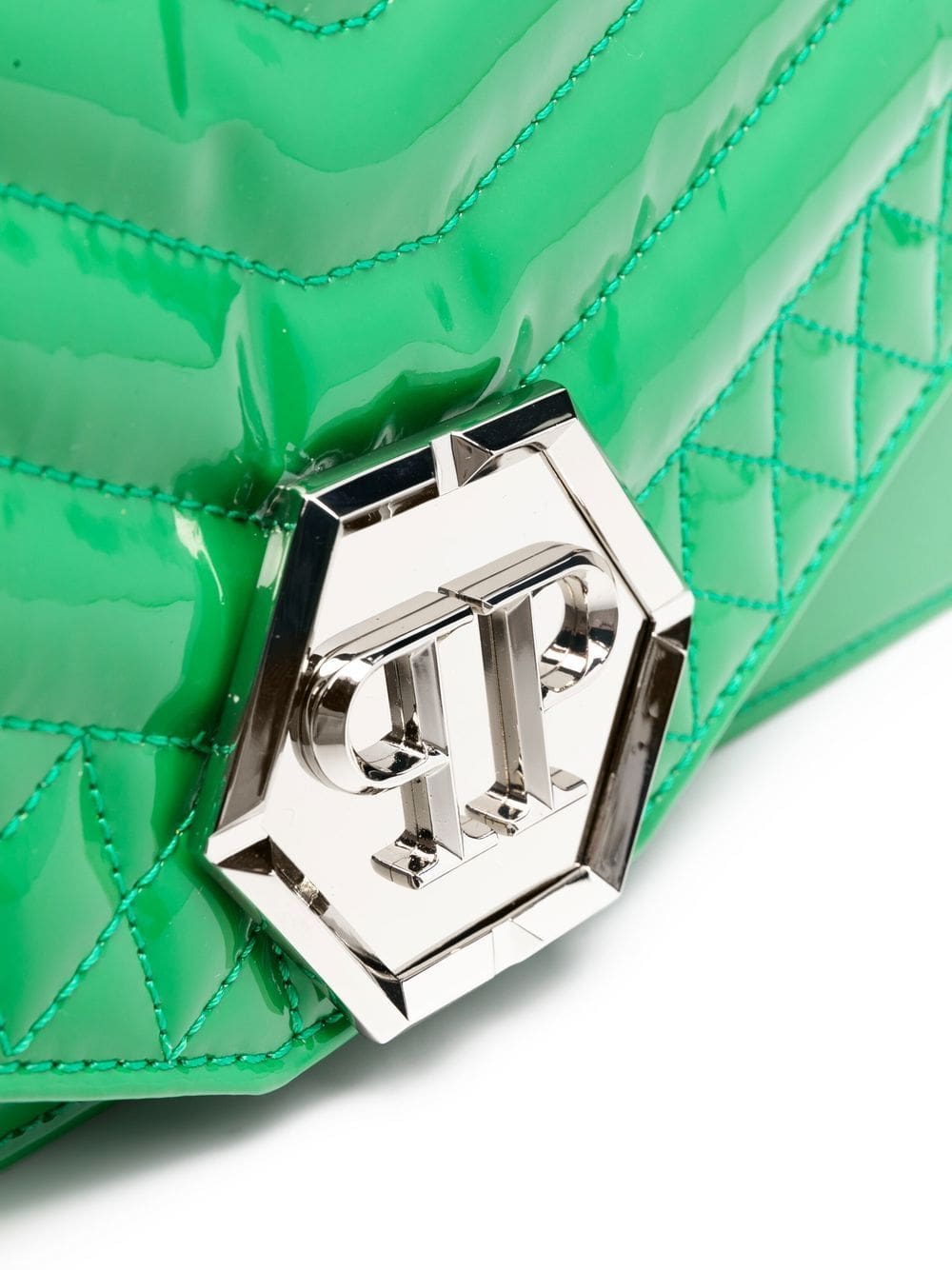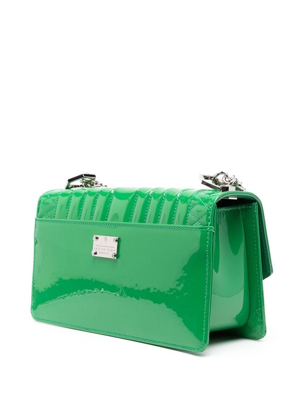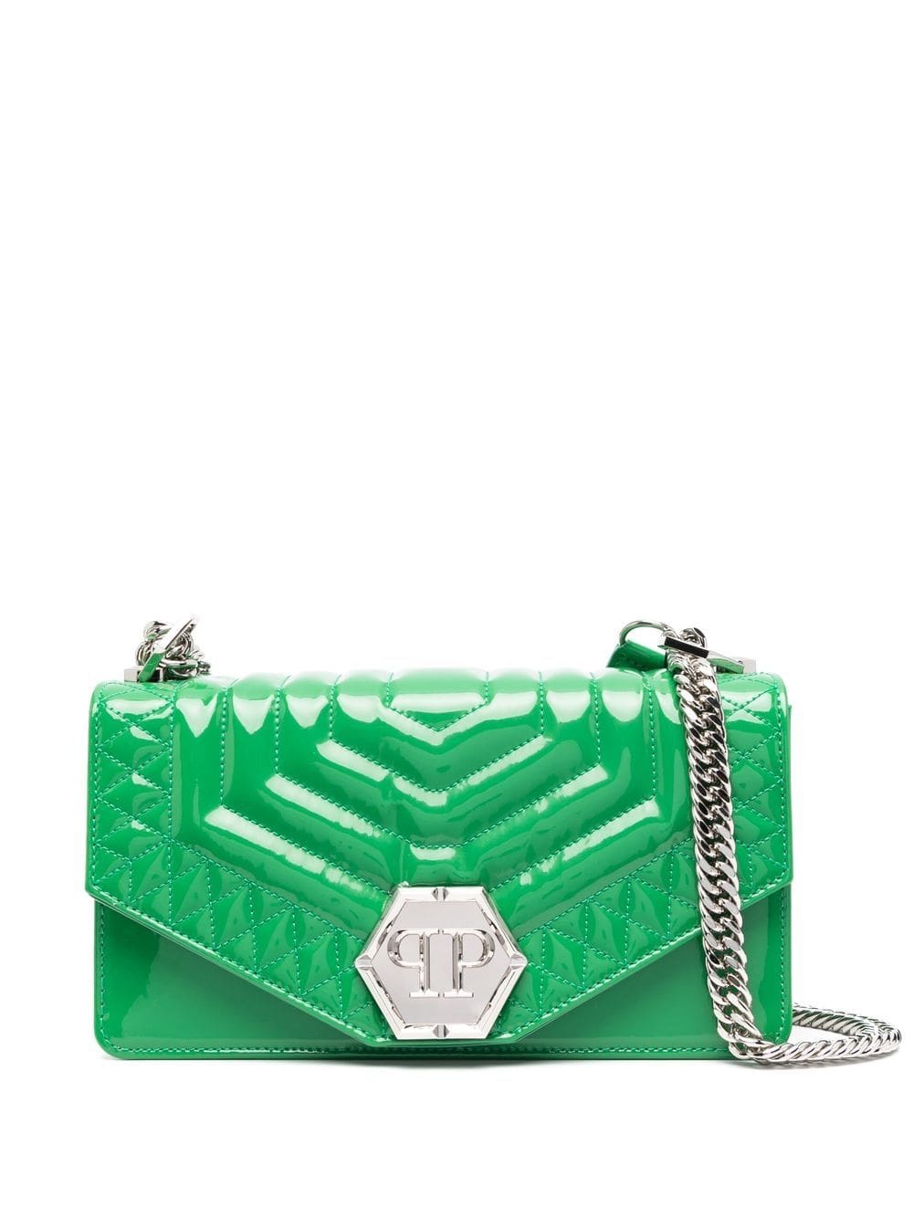 green calf leather quilted logo plaque foldover top clasp fastening sliding chain-link shoulder strap main compartment internal slip pocket