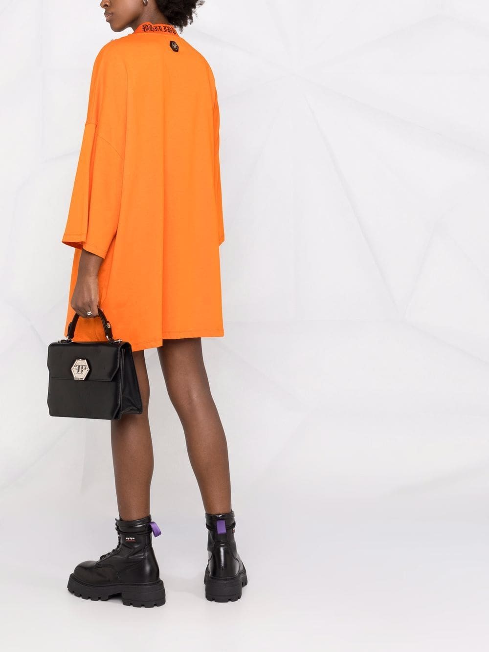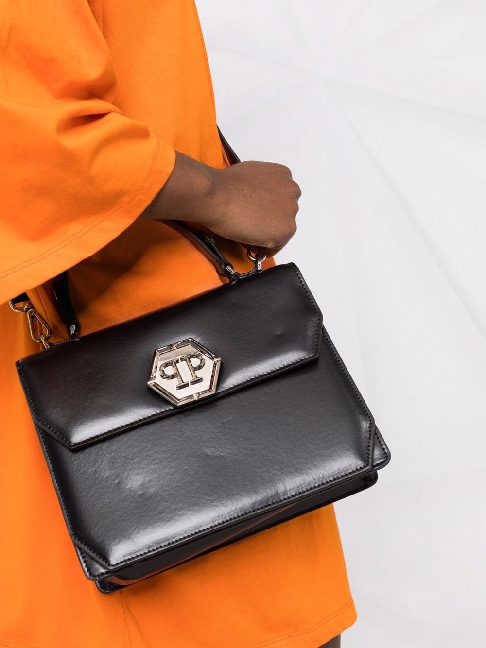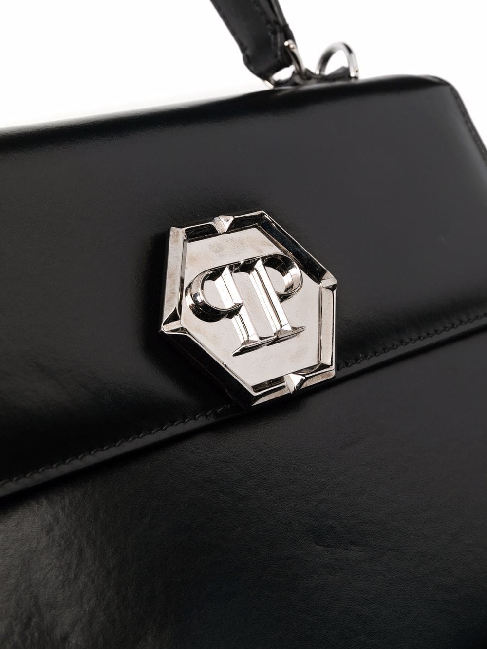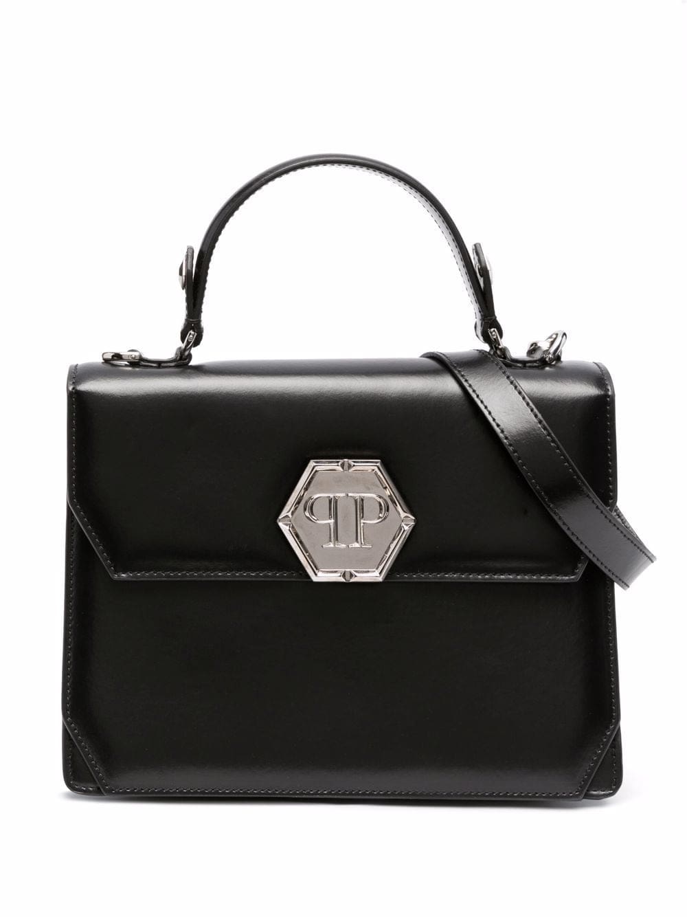 Forgoing their signature shimmering embellishments, Phillip Plein adopts a more minimal design approach in this tote bag. Presented in classic black, the accessory is simply accented with a hexagonal logo plaque to the front.Â