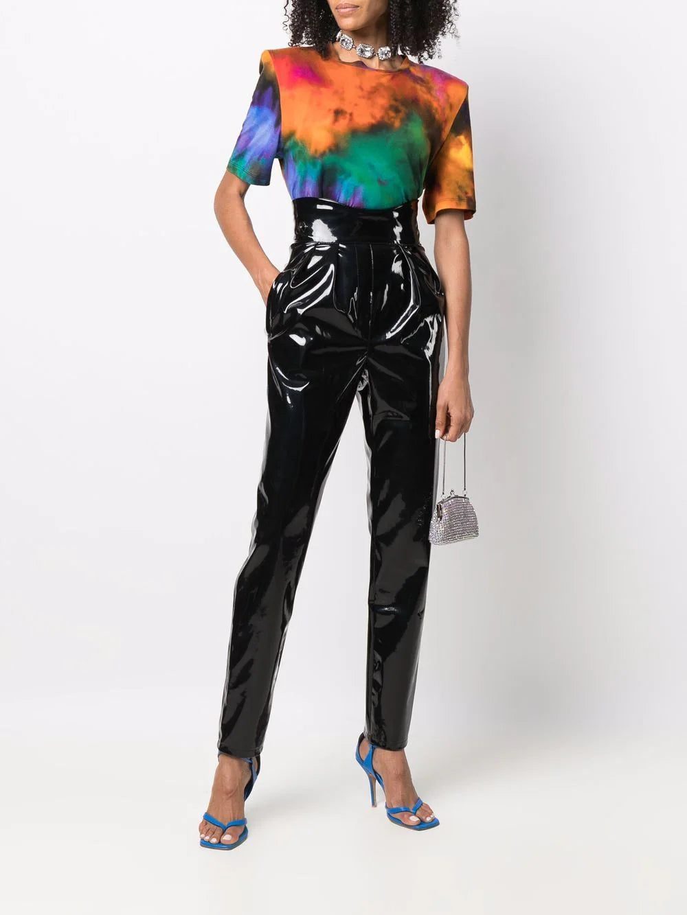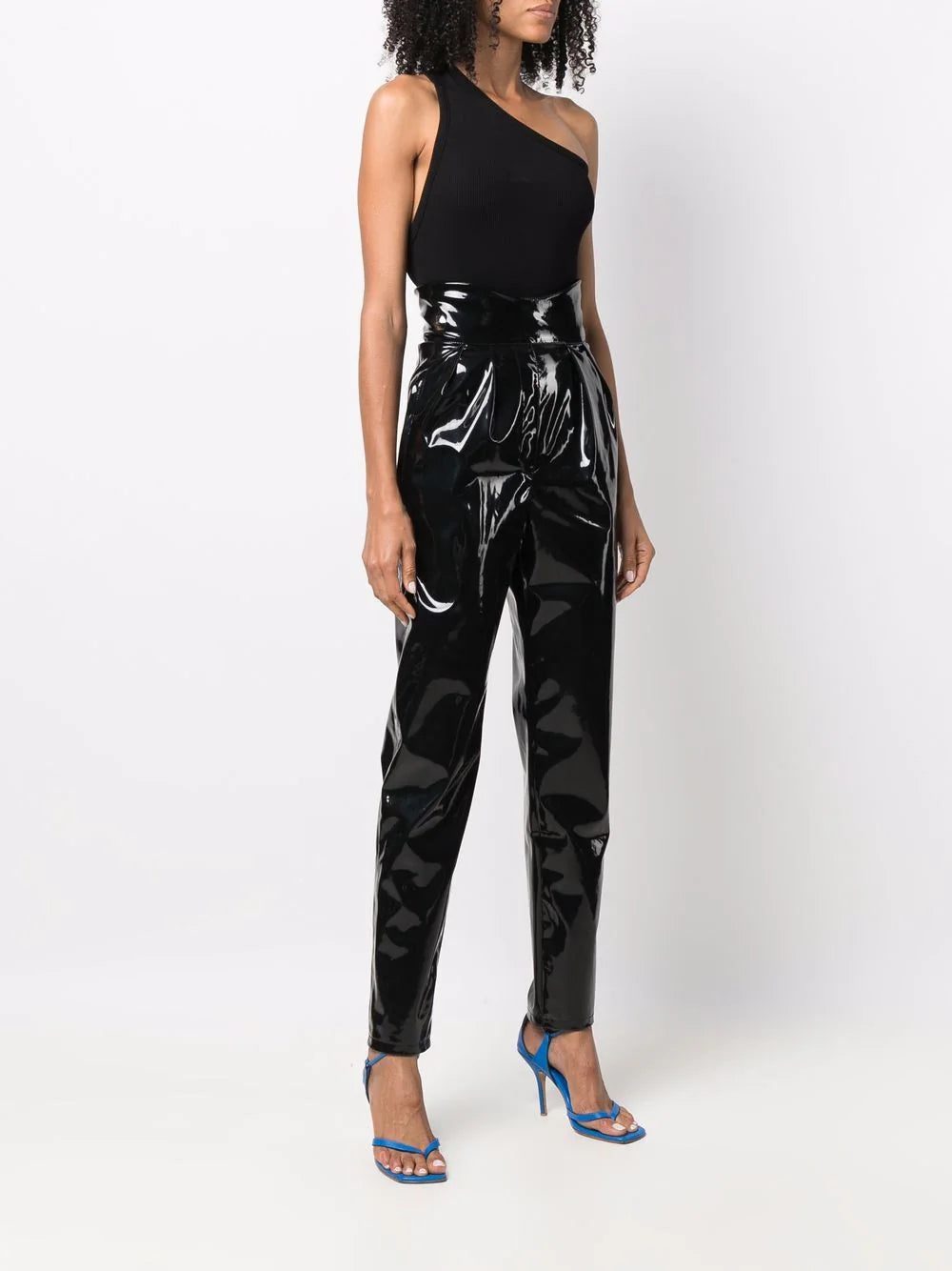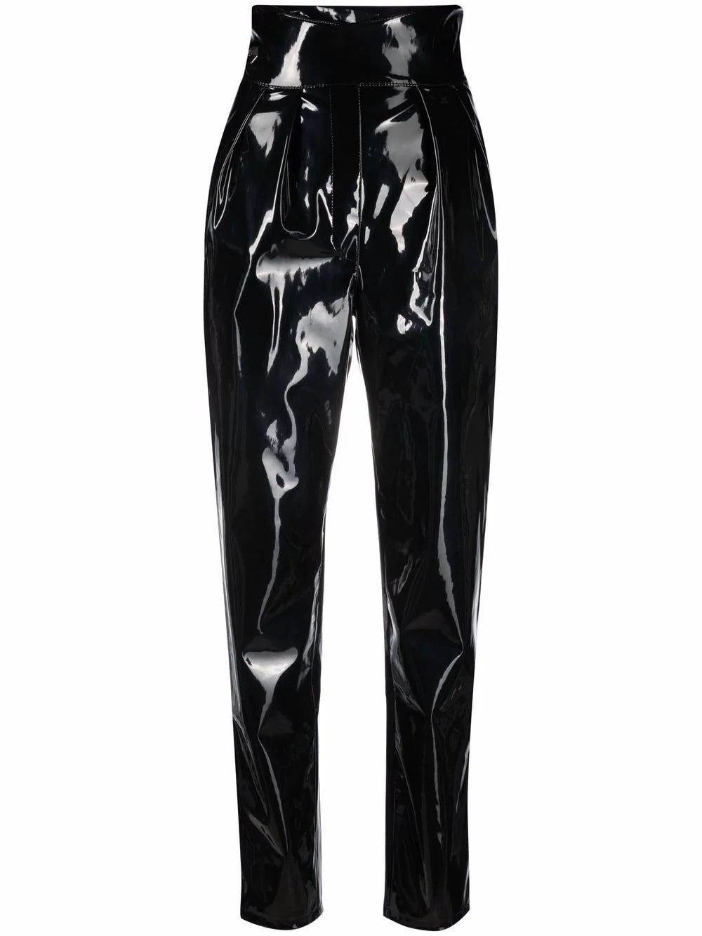 Black high-waisted long latex trousers from PHILIPP PLEIN featuring coated finish, high-waisted, concealed front fastening, two side slit pockets and tapered leg.