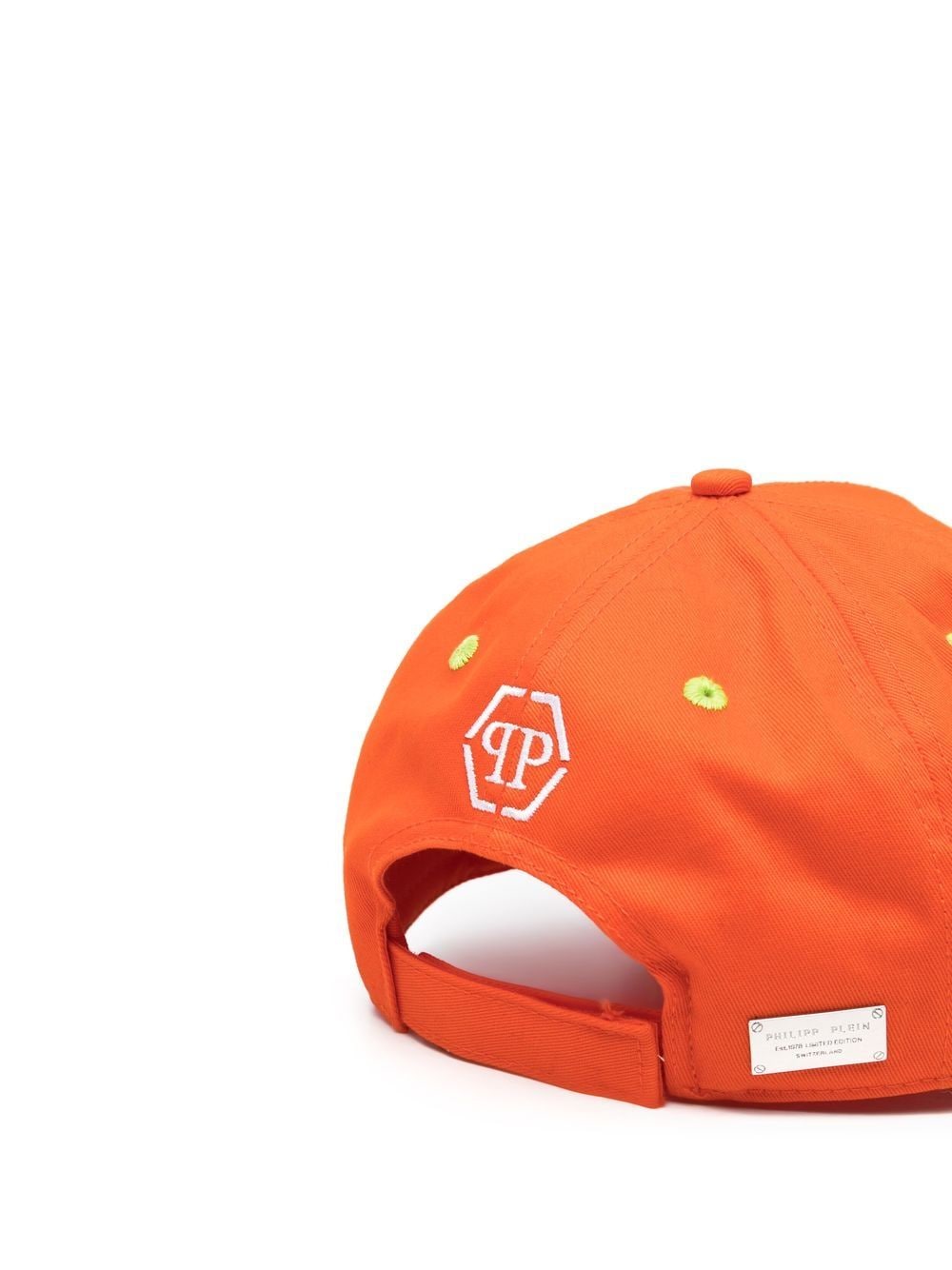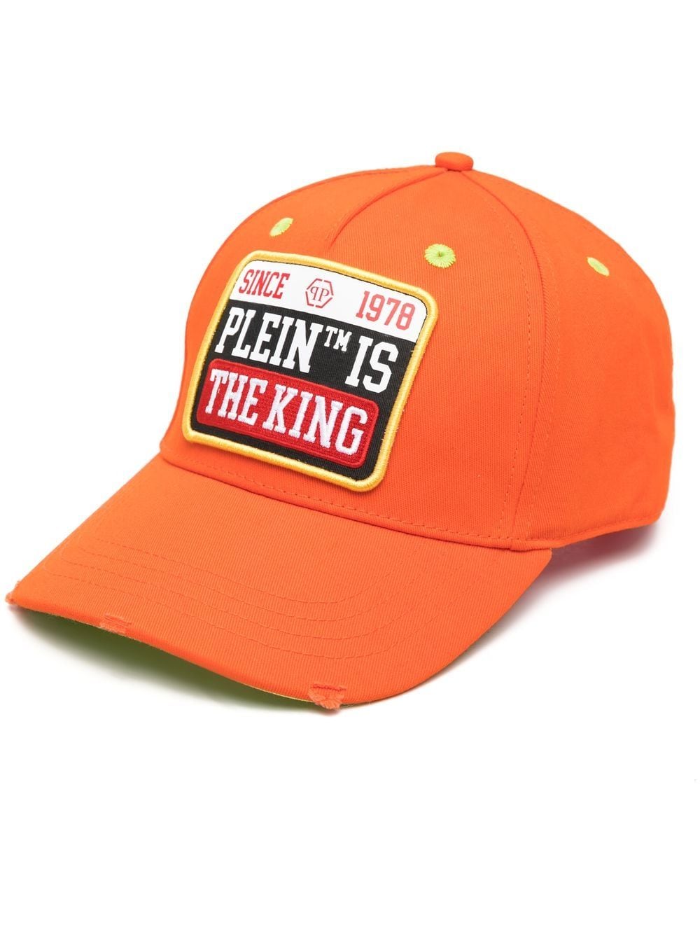 logo-patch distressed cap from PHILIPP PLEIN featuring orange, distressed finish, logo patch to the front, embroidered logo to the rear, silver-tone logo plaque, curved peak and adjustable strap to the rear.