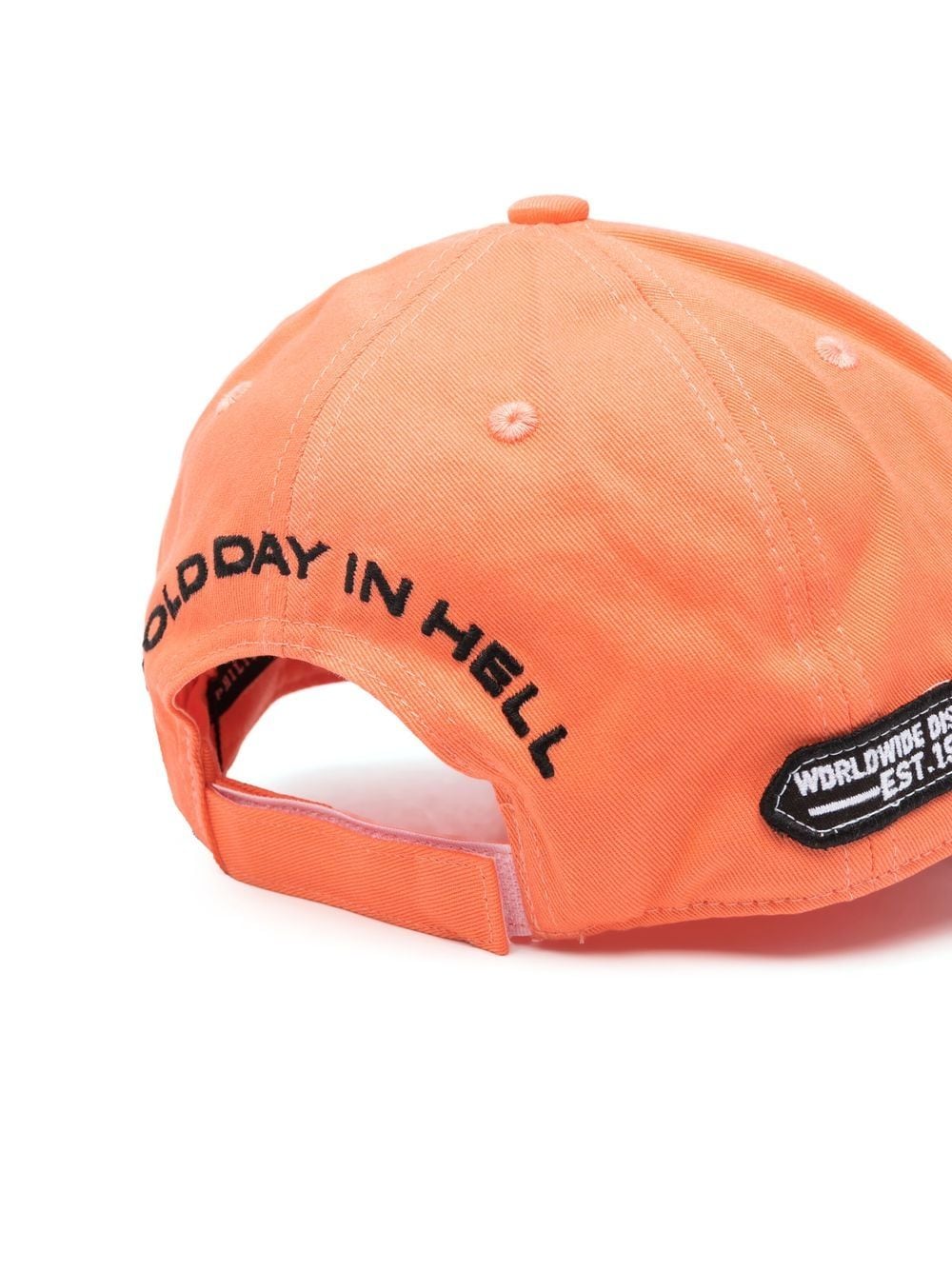 tangerine orange cotton curved peak fabric-covered button at the crown distressed effect logo patch to the front embroidered slogan silver-tone logo plaque eyelet vents rear touch-strap fastening