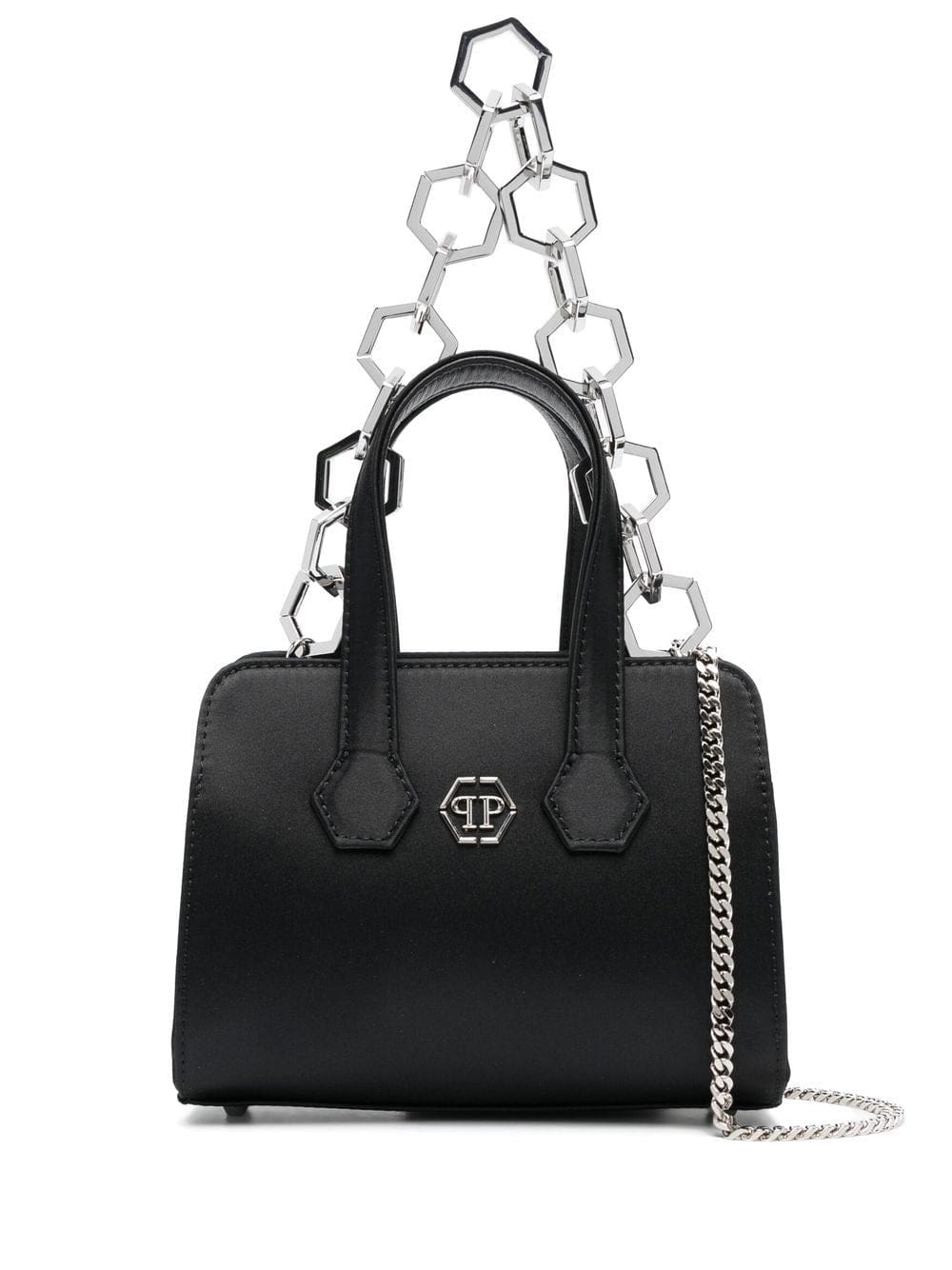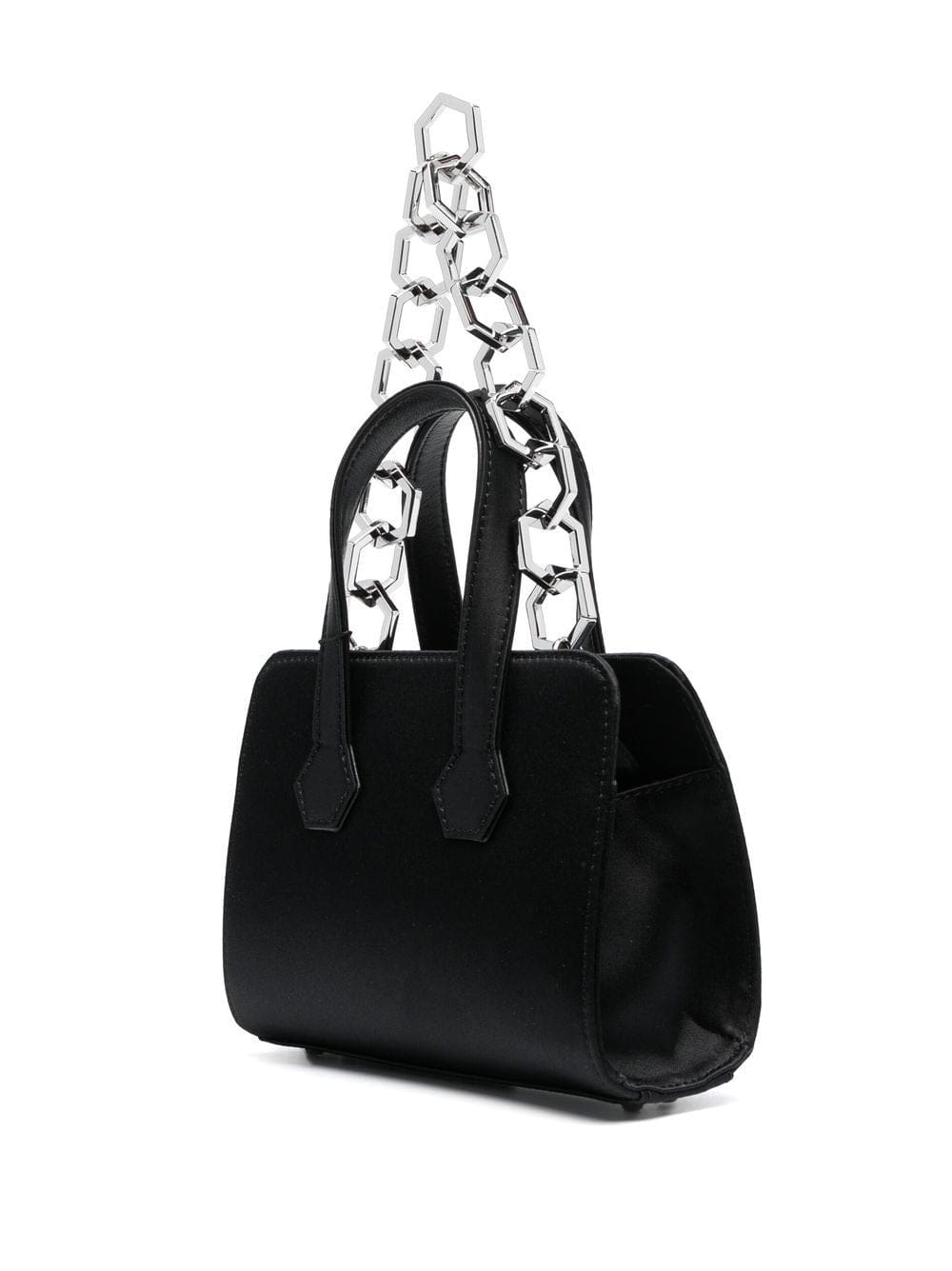 jet black satin finish silver-tone logo plaque two rounded handles to the sides detachable chain-link shoulder strap main compartment leopard print lining internal logo patch