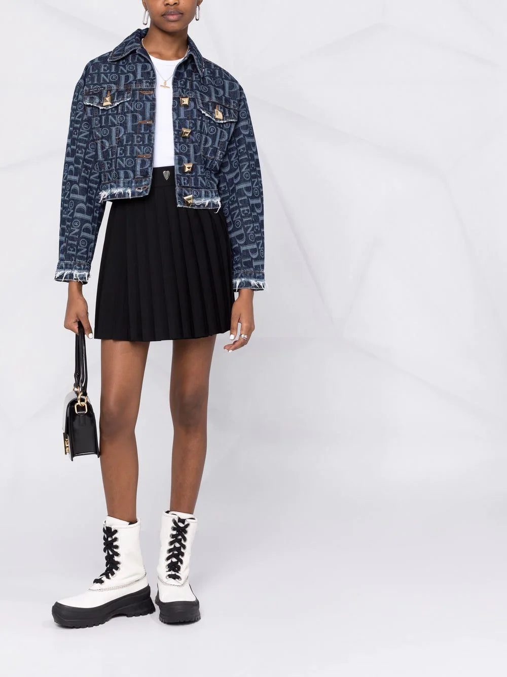 Philipp Plein's extravagant approach to design is showcased in this denim jacket, with a contemporary cropped silhouette. Featuring an all-over logo print with letters in different scales, it adds to its eye-catching effect.