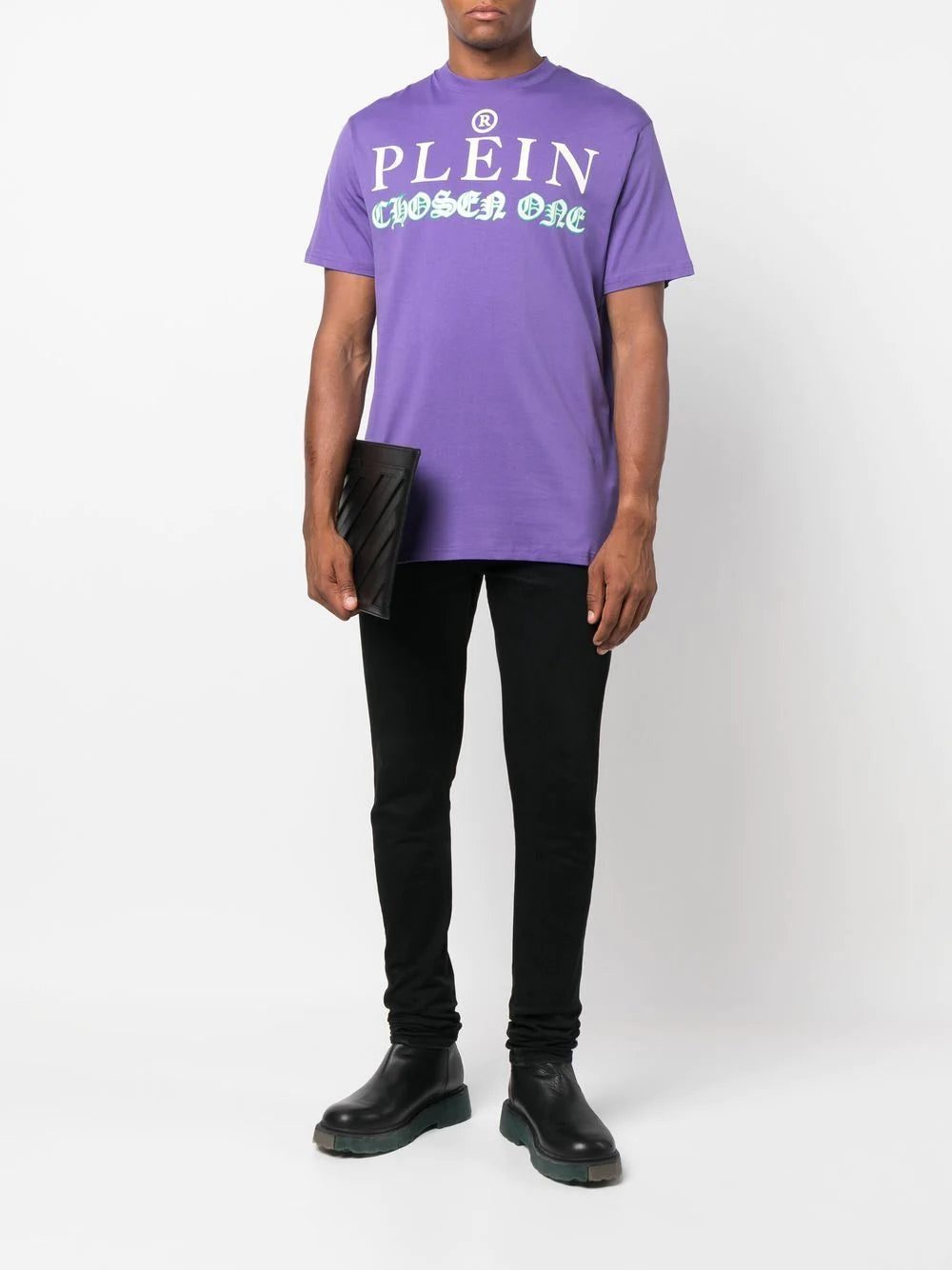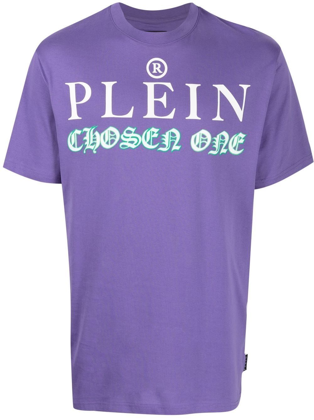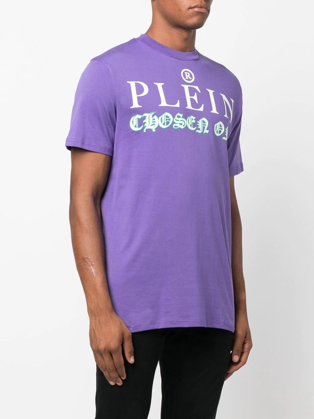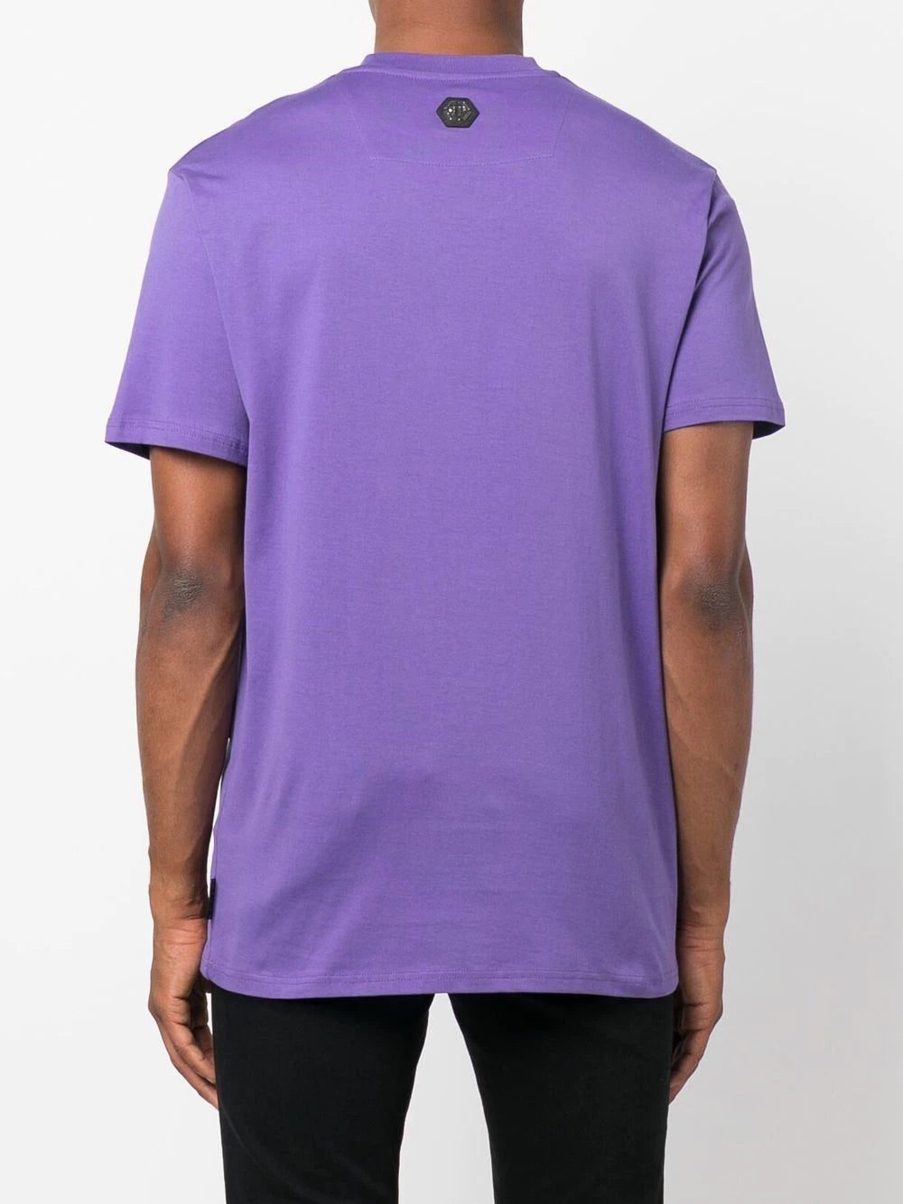 logo-print short-sleeve T-shirt from PHILIPP PLEIN featuring electric purple, cotton, logo print to the front, logo patch to the rear, round neck, short sleeves and straight hem.
